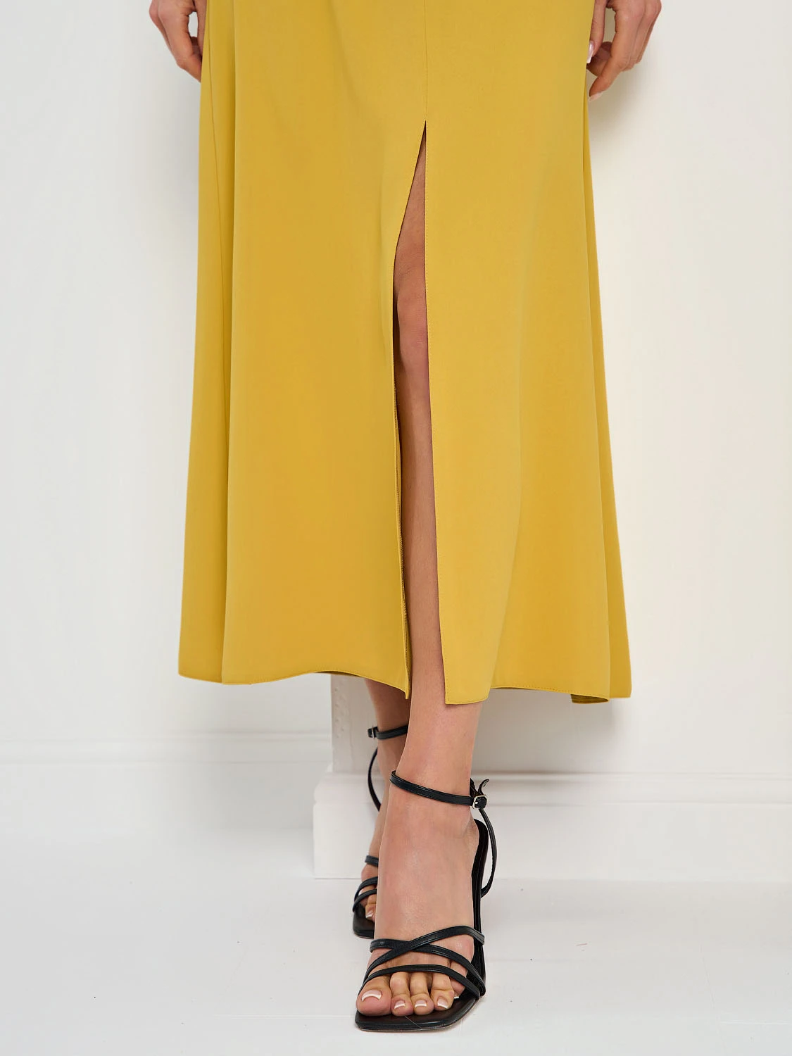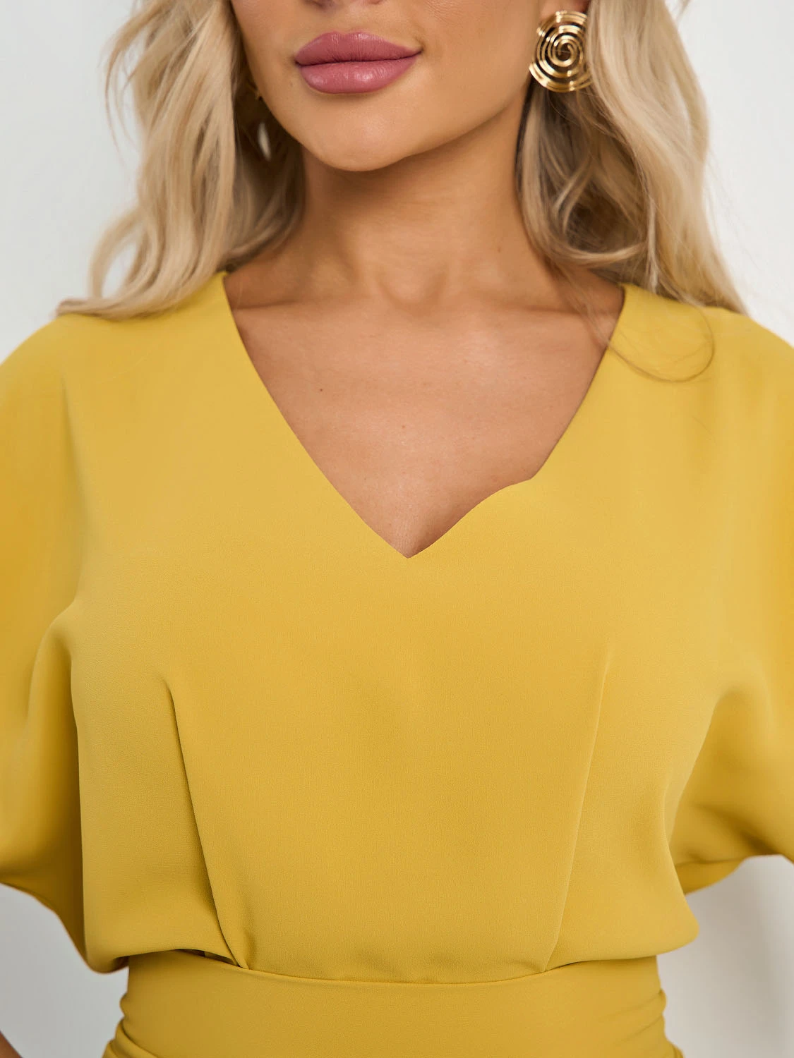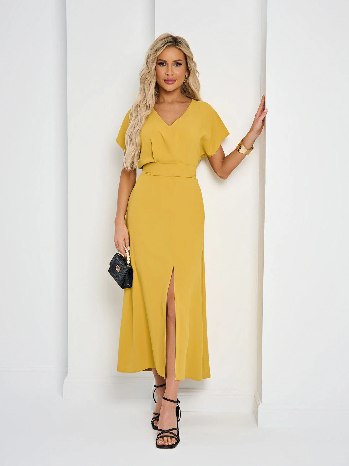 Платье с отрезной талией по переду, в шов вшит широкий пояс, который завязывается сзади.