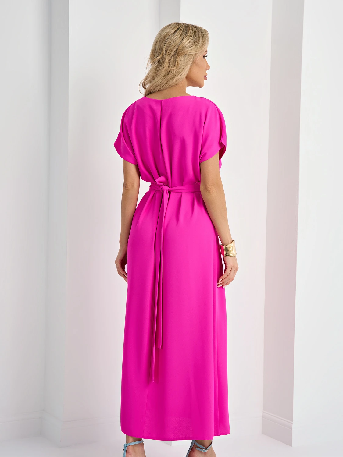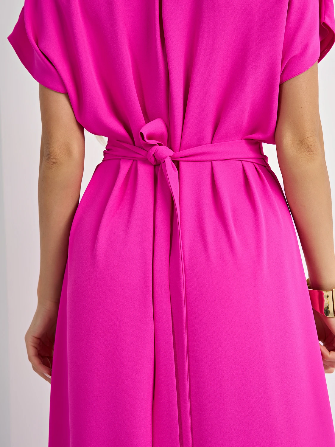 Платье с отрезной талией по переду, в шов вшит широкий пояс, который завязывается сзади.
