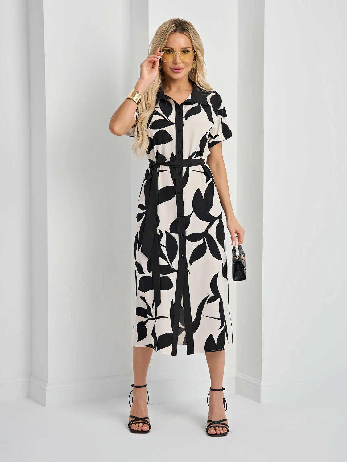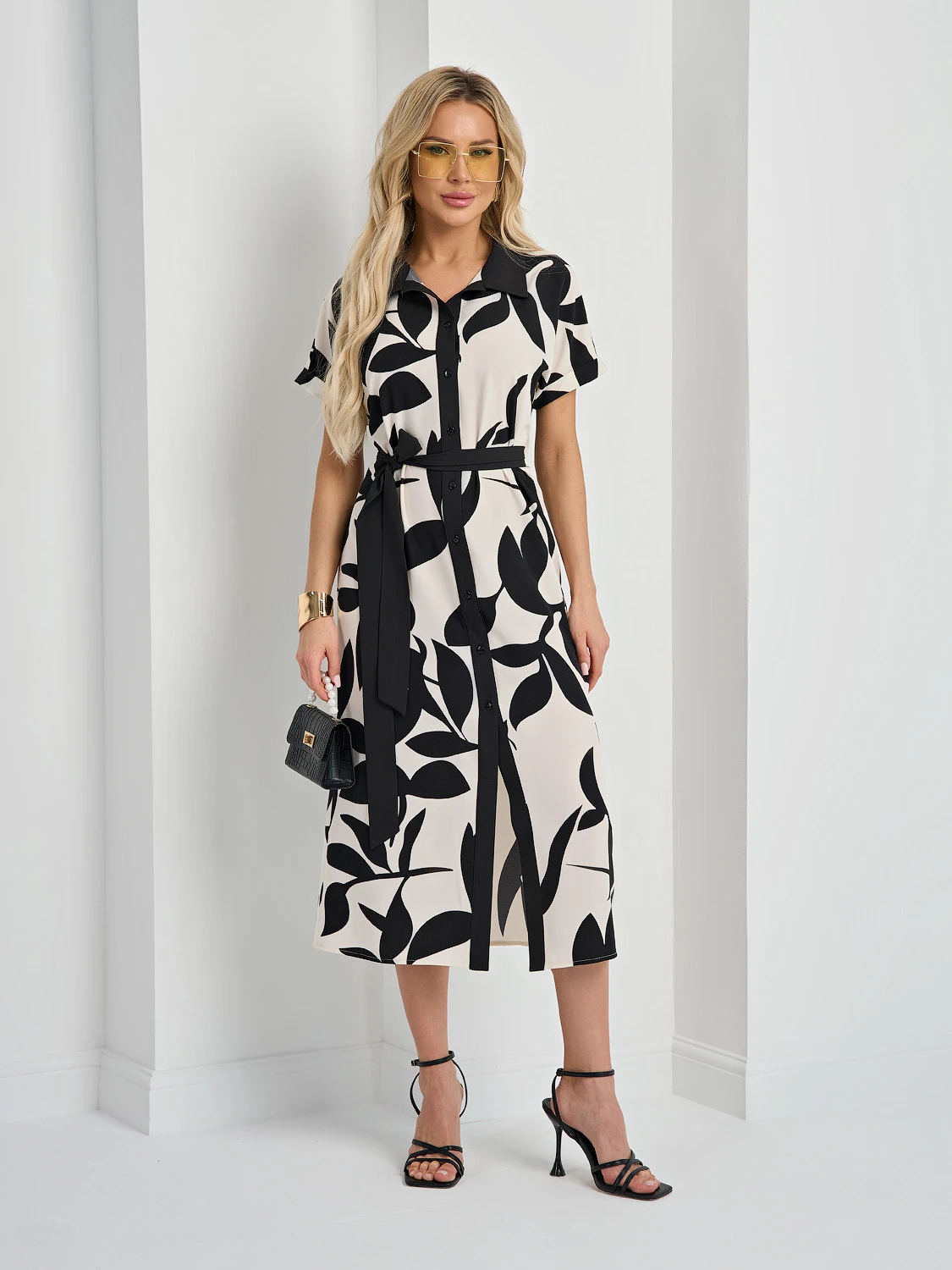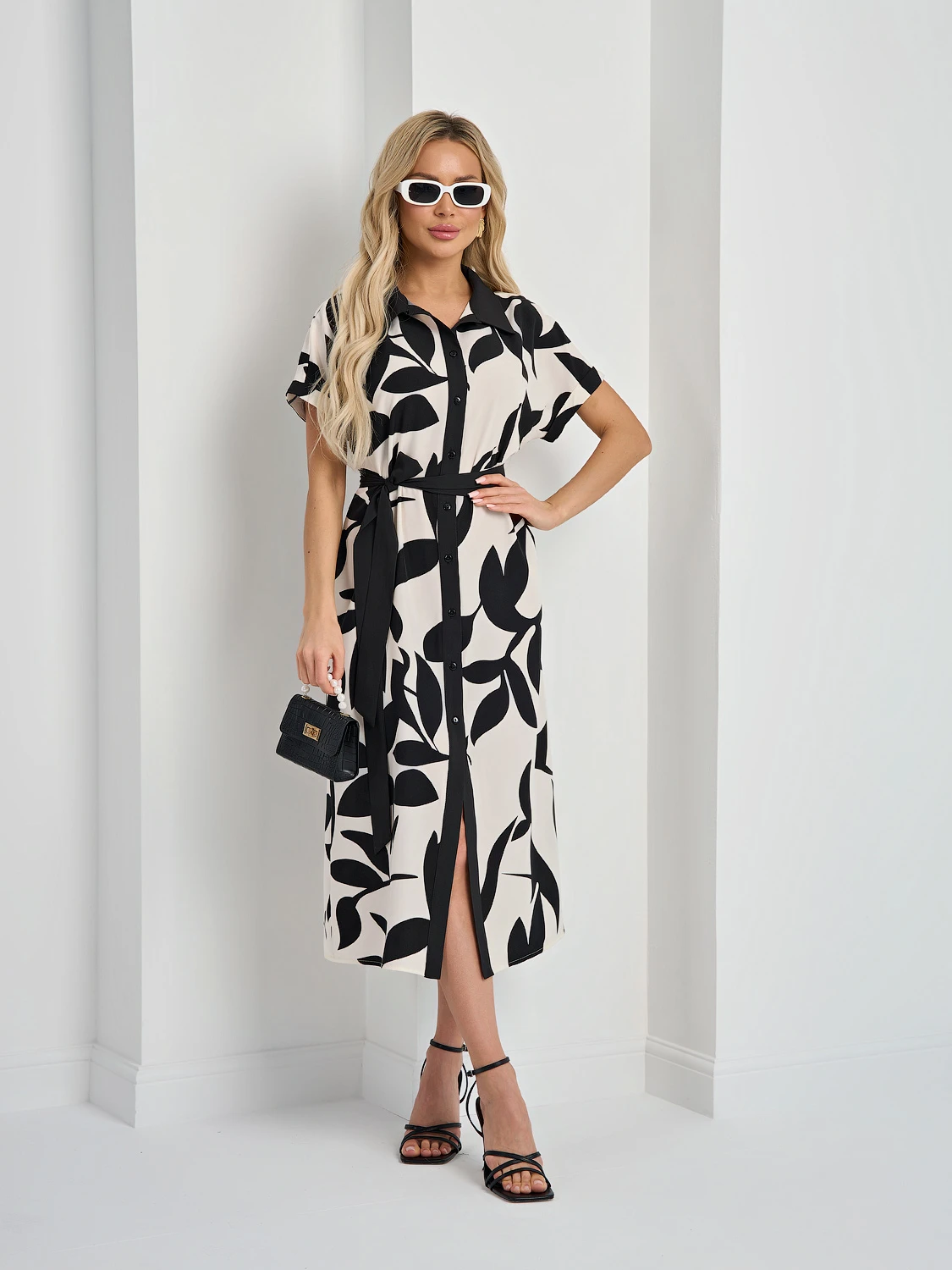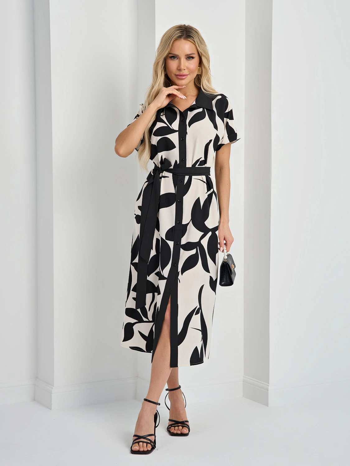 Воротник, передняя планка и пояс выполнены из ткани компаньона черного цвета.