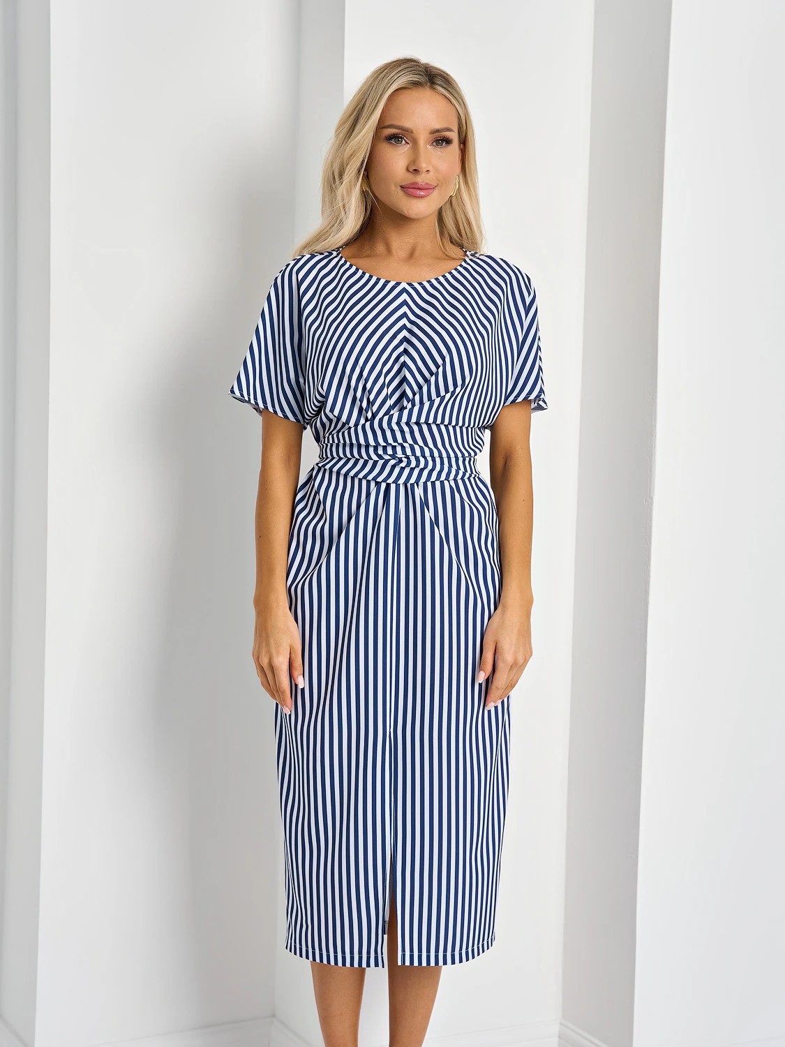 Платье полуприлегающего силуэта длины миди.
