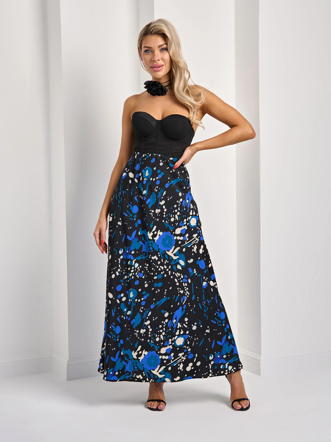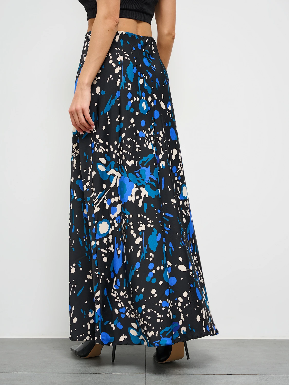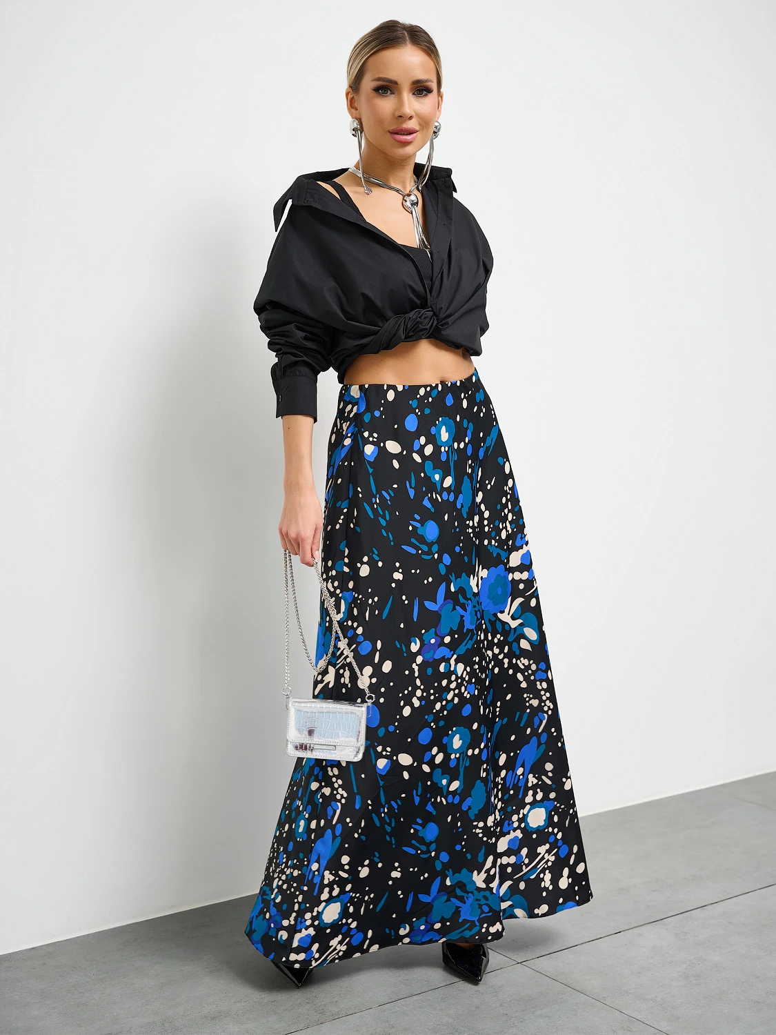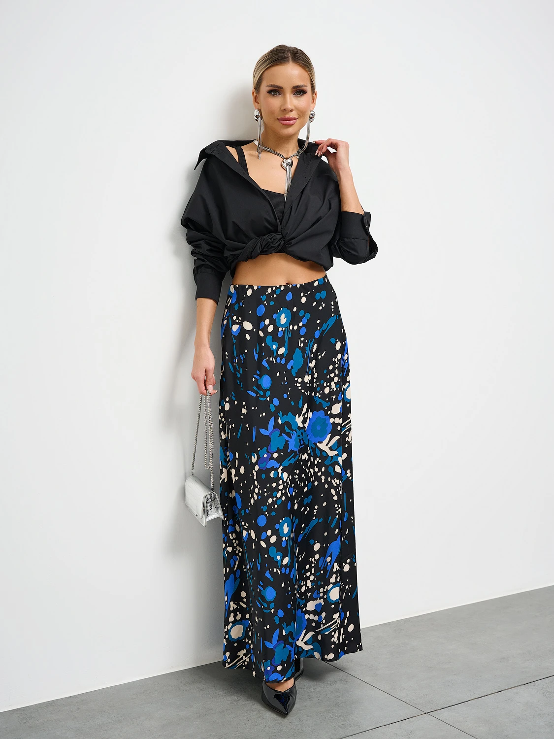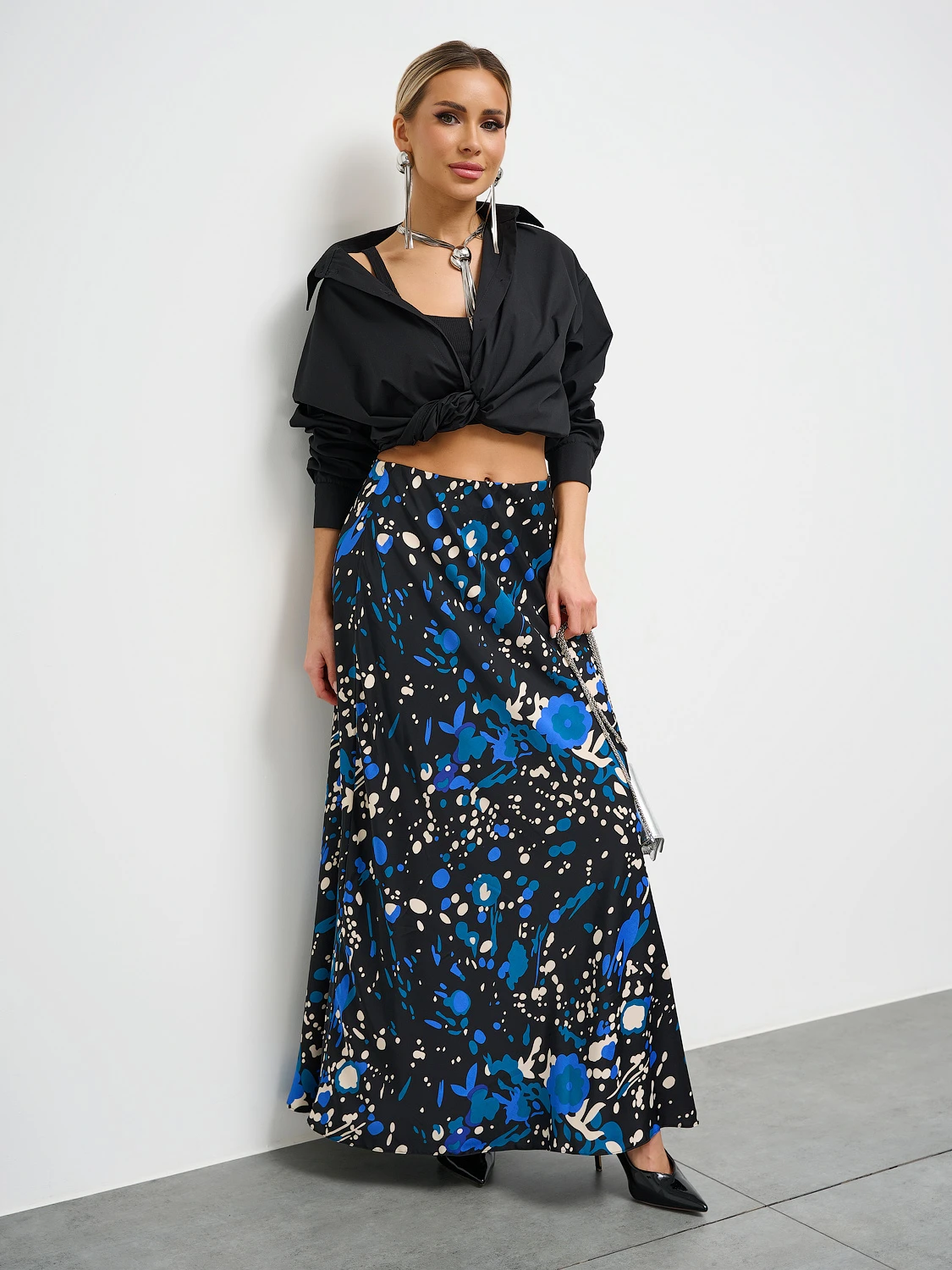 Юбка длины макси из плотного атласа с внутренним поясом из резинки. За счет струящейся ткани ваш образ будет легким и нежным.