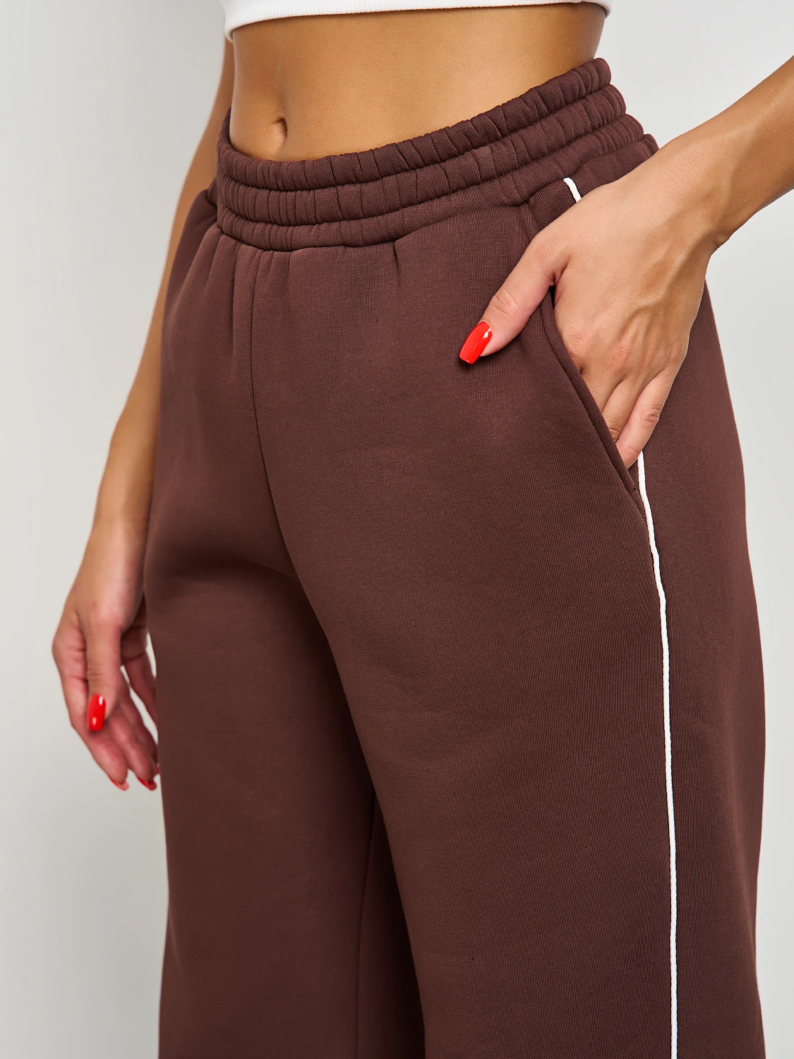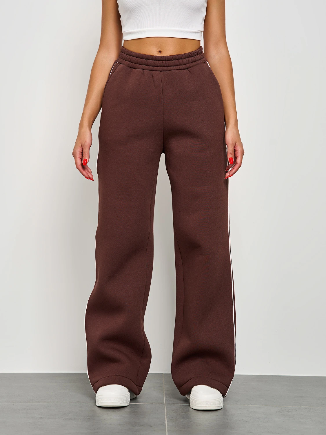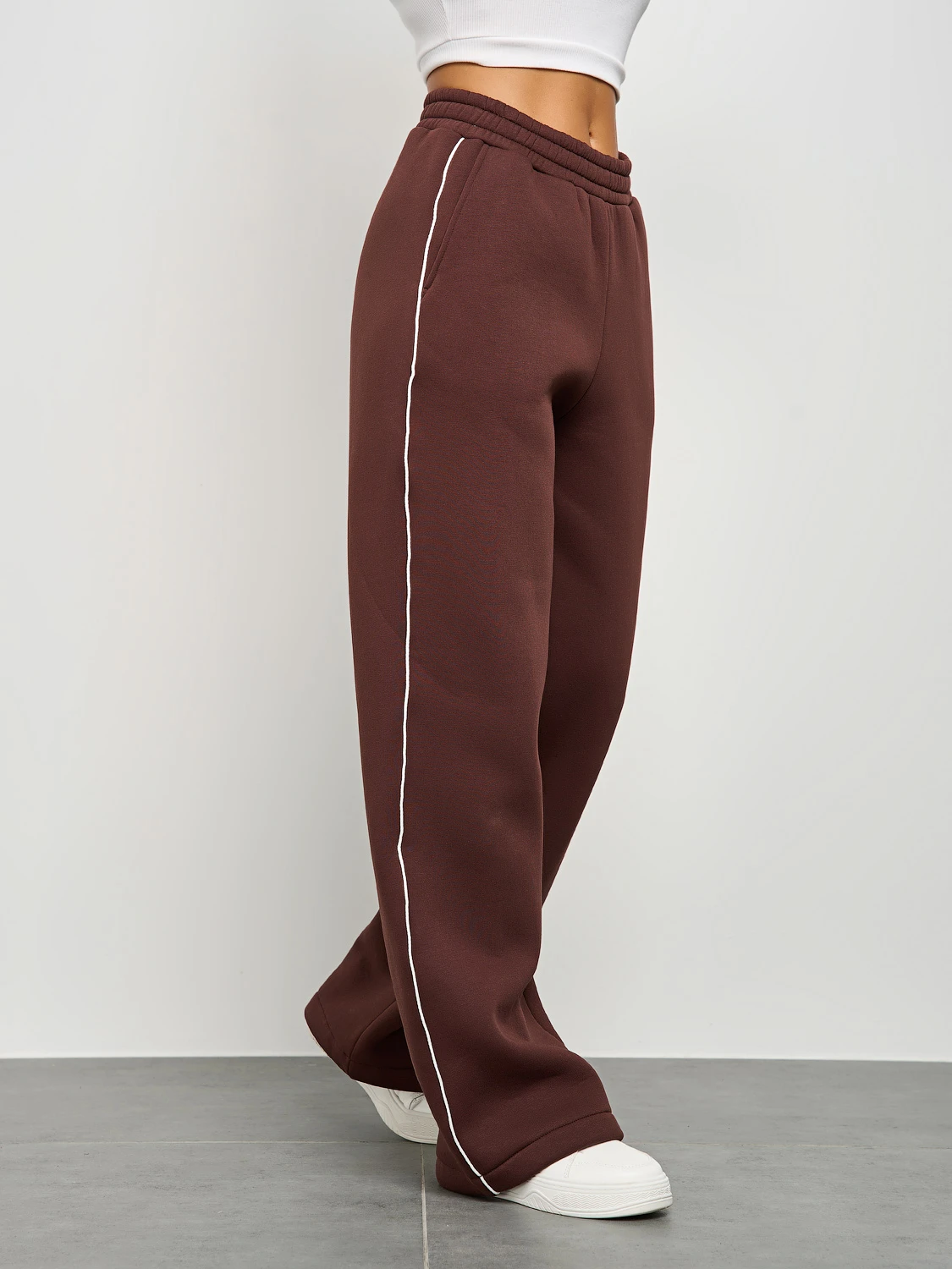 Широкие брюки из плотного премиум-футера 3-х нитка с начесом с тонкими лампасами , выполнеными из декоративного контрастного канта.