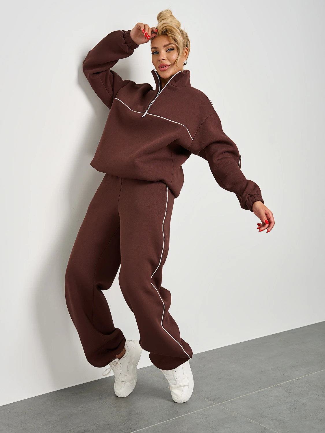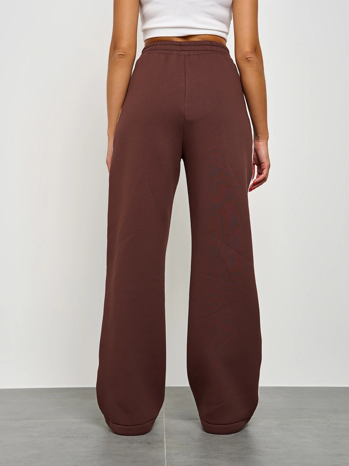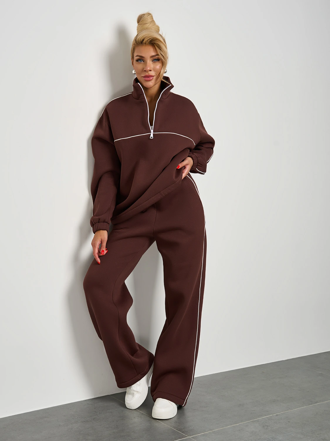 Широкие брюки из плотного премиум-футера 3-х нитка с начесом с тонкими лампасами , выполнеными из декоративного контрастного канта.