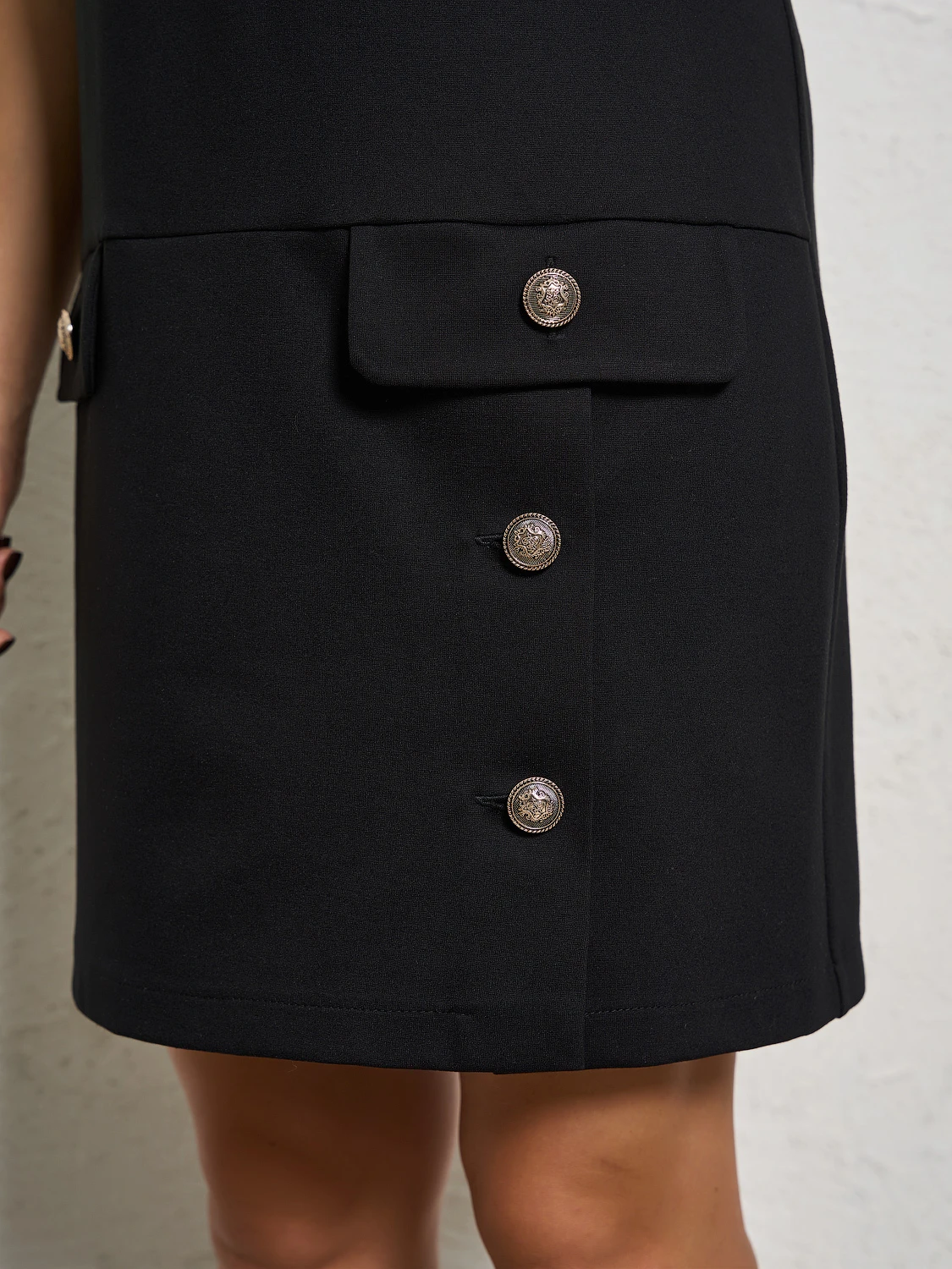 По нижней части платья расположены клапаны с декоративными пуговицами и разрез.
