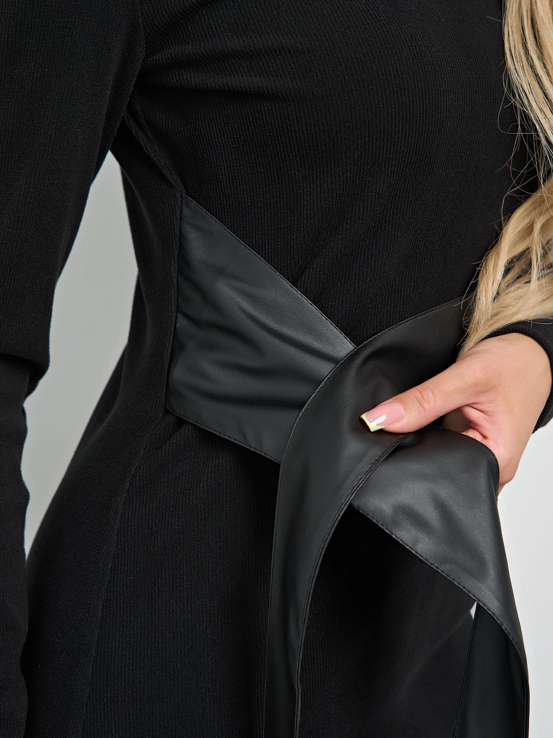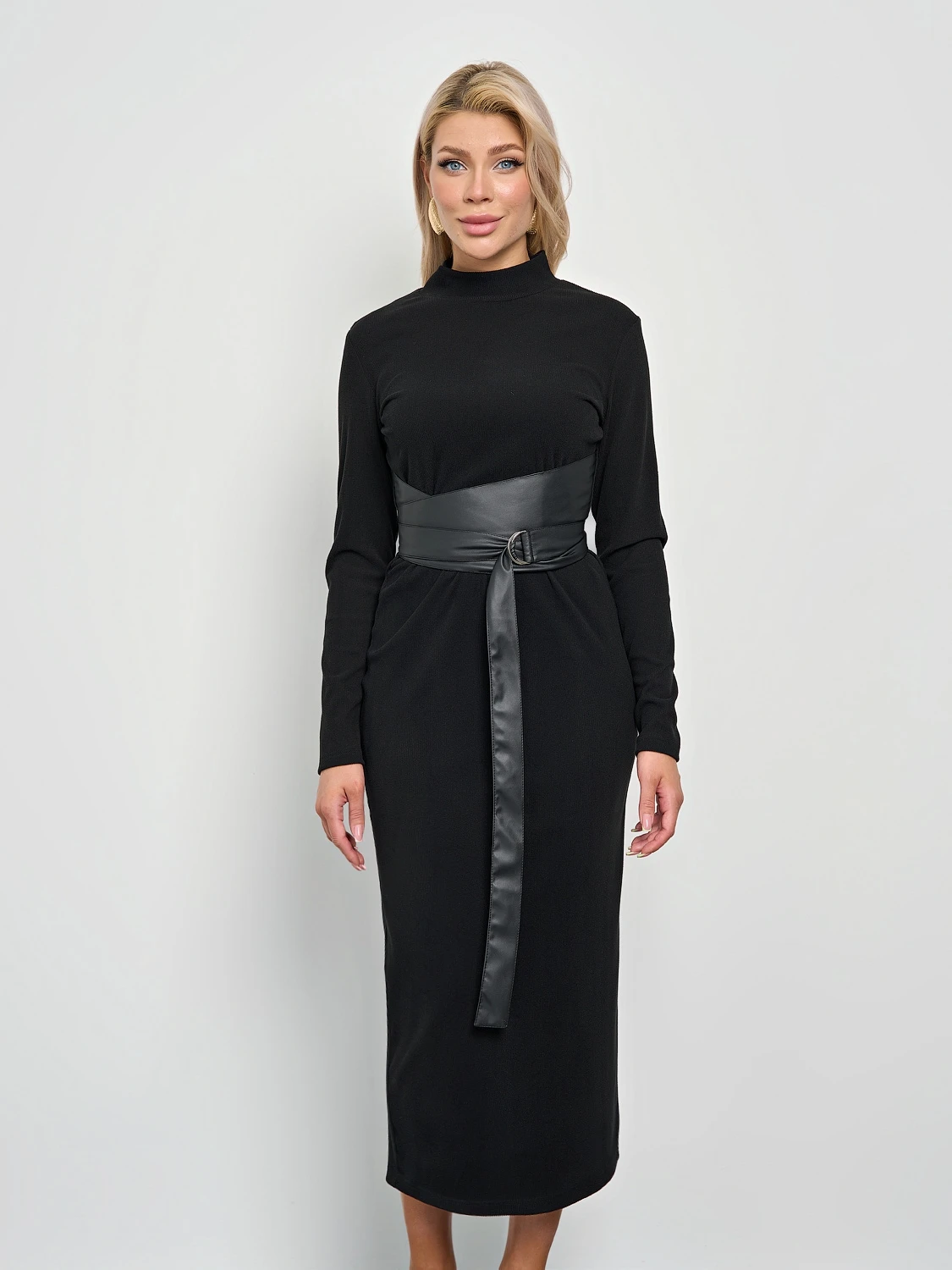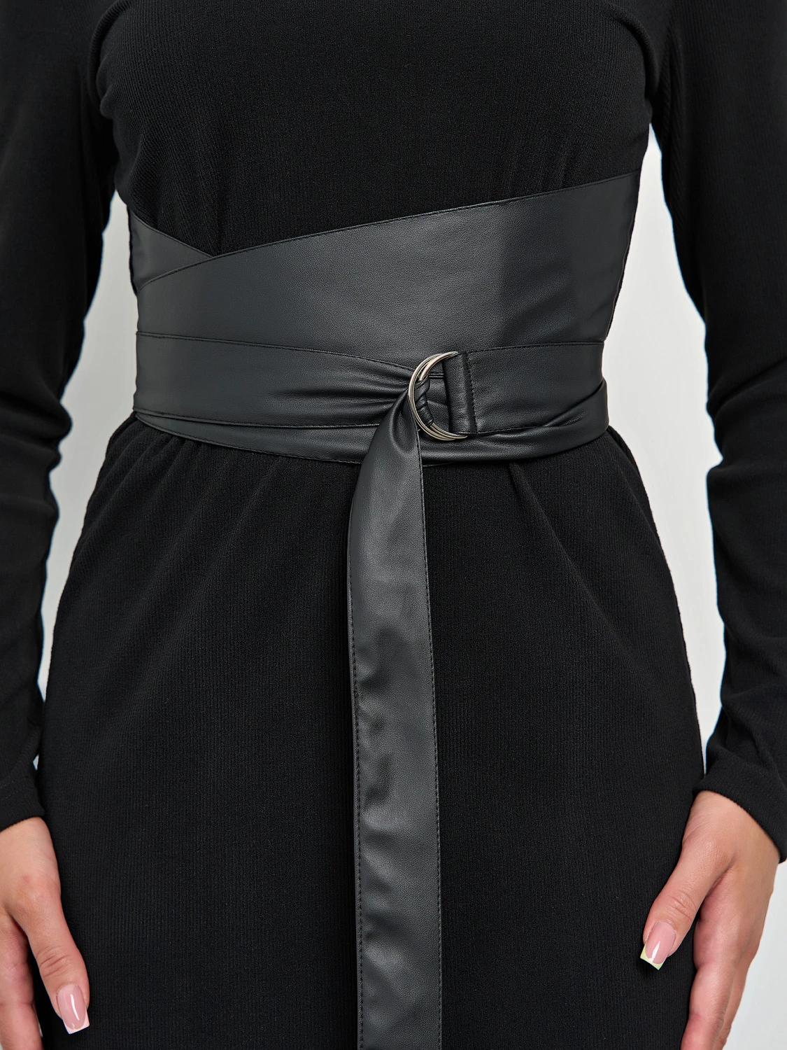 Пояс из искусственной кожи с пряжкой-полукольцом вшит в боковые швы изделия.