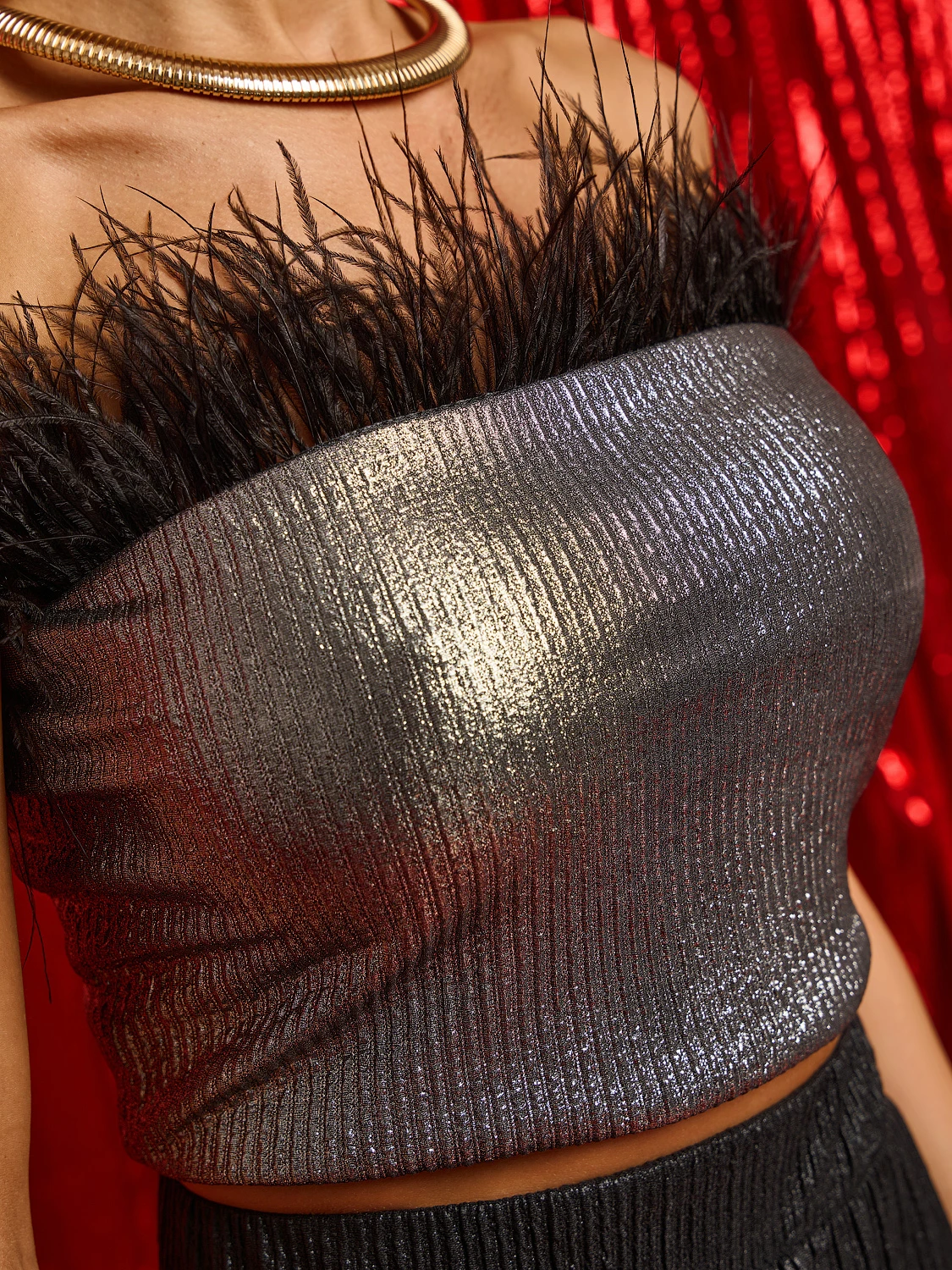 Эффектный топ-бандо из блестящего трикотажа. По переду изделия верхний край украшен перьями.