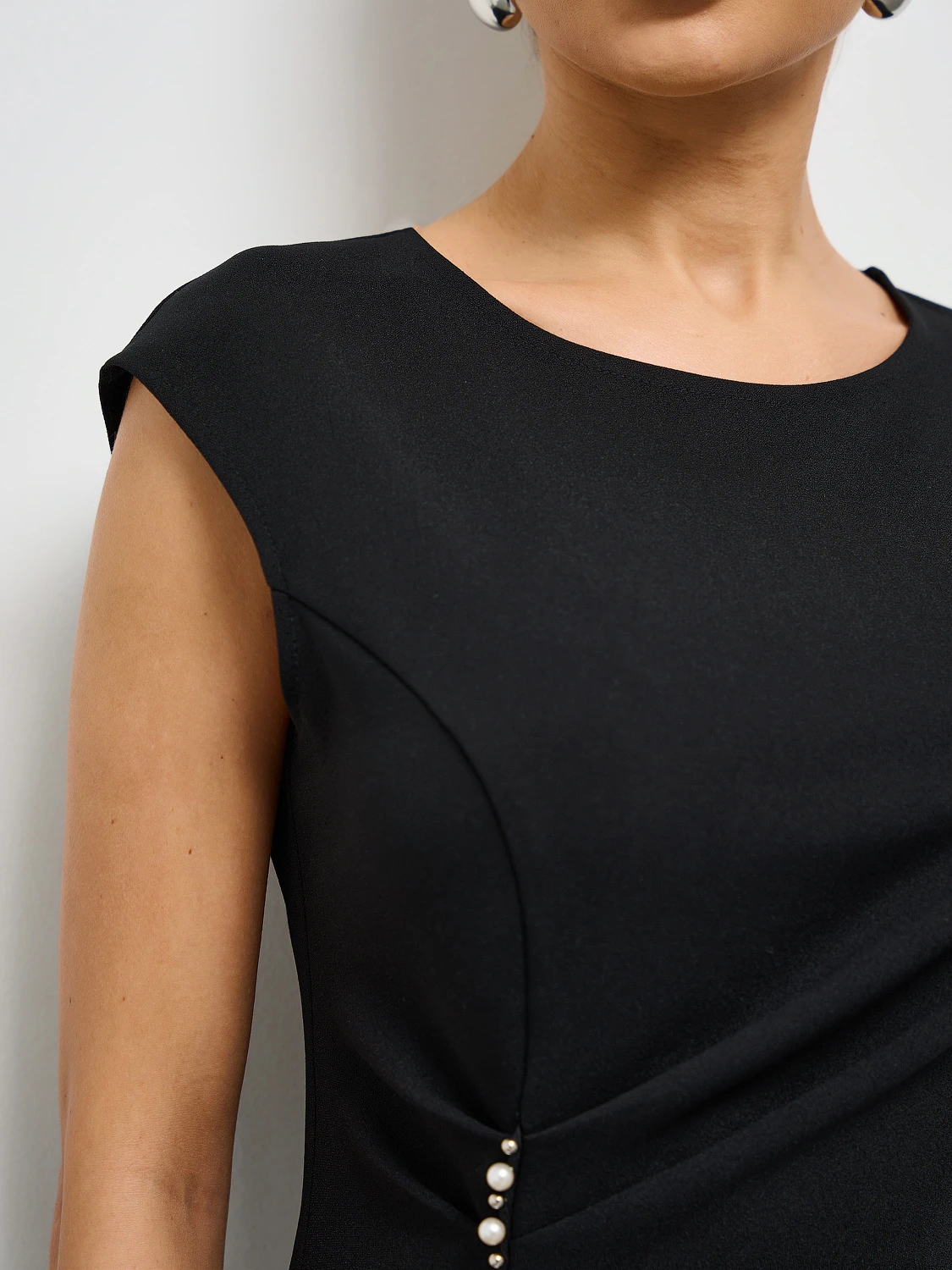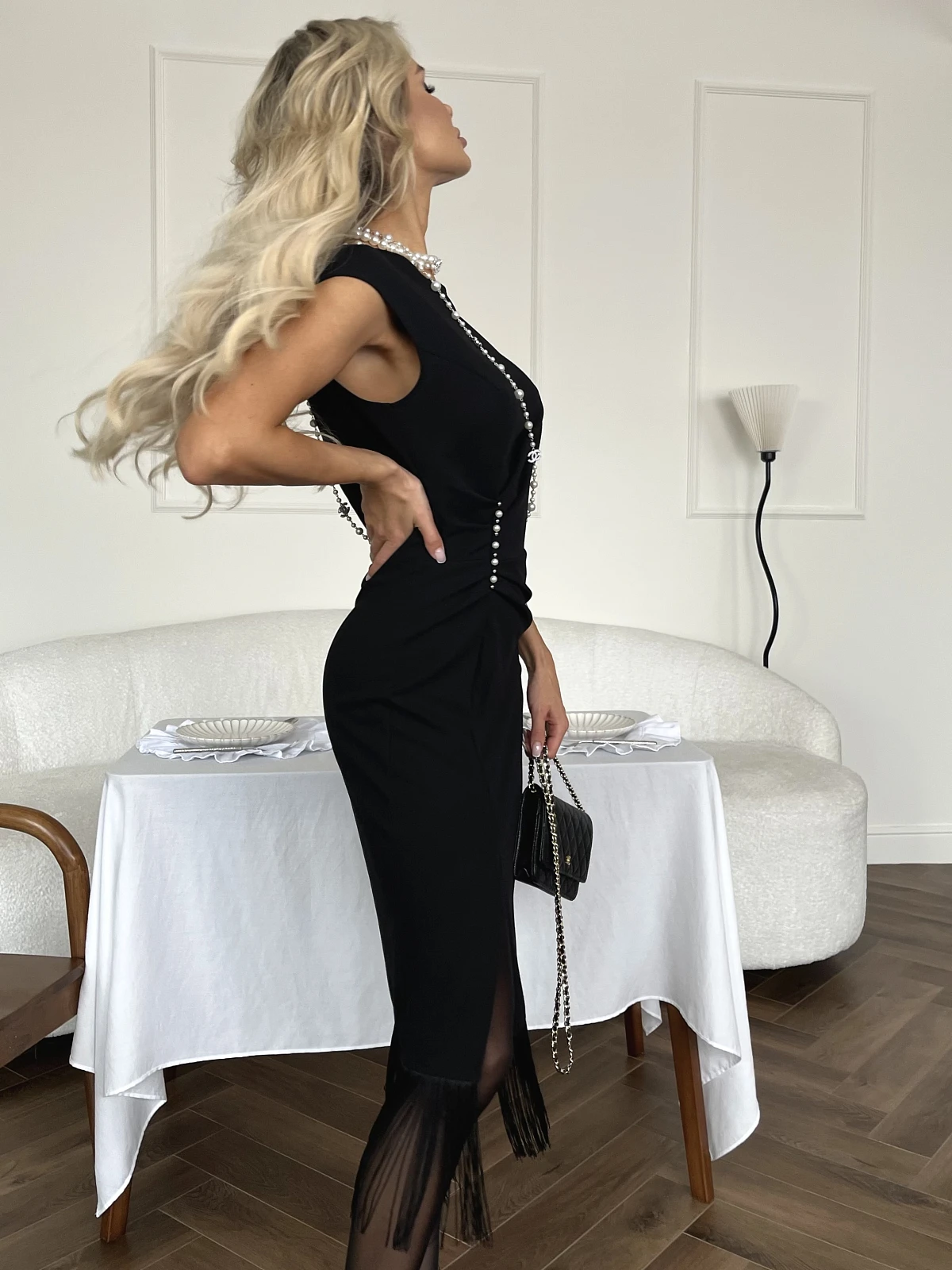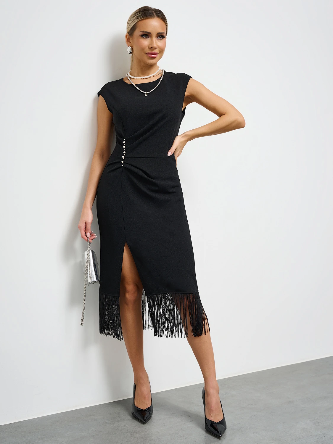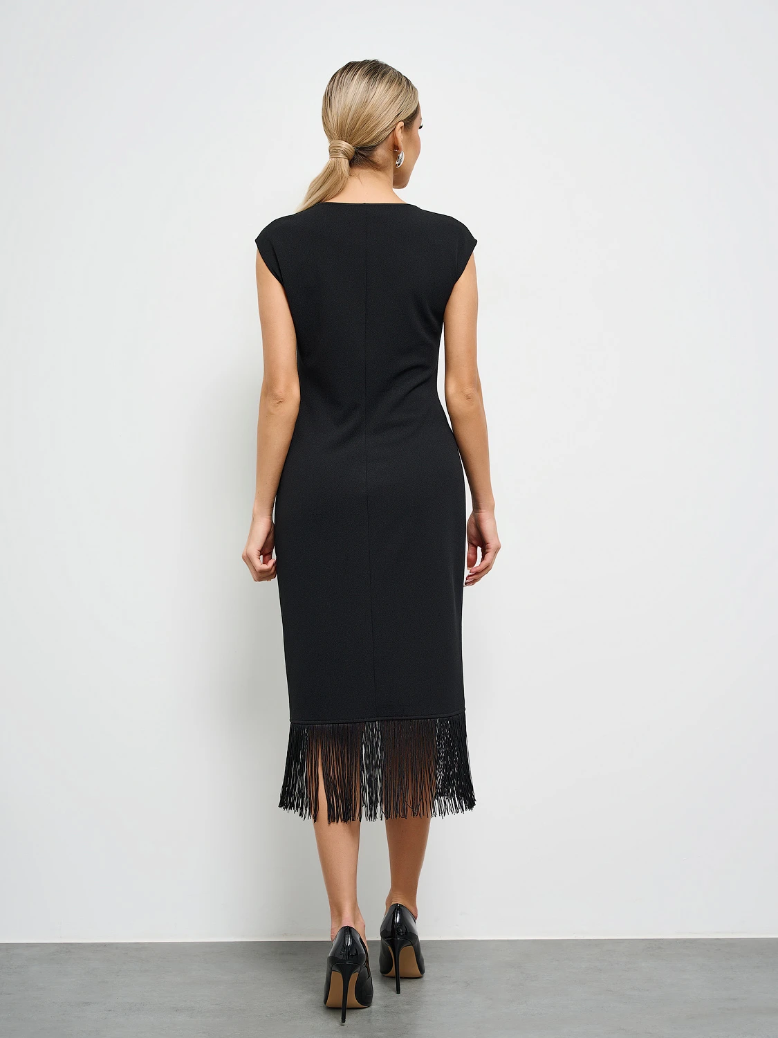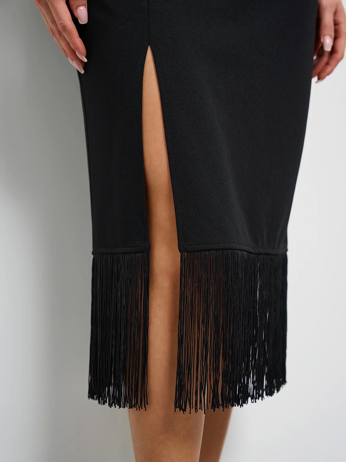 Платье длины миди прилегающего силуэта. По переду изделия высокий разрез. Низ изделия декорирован бахромой.