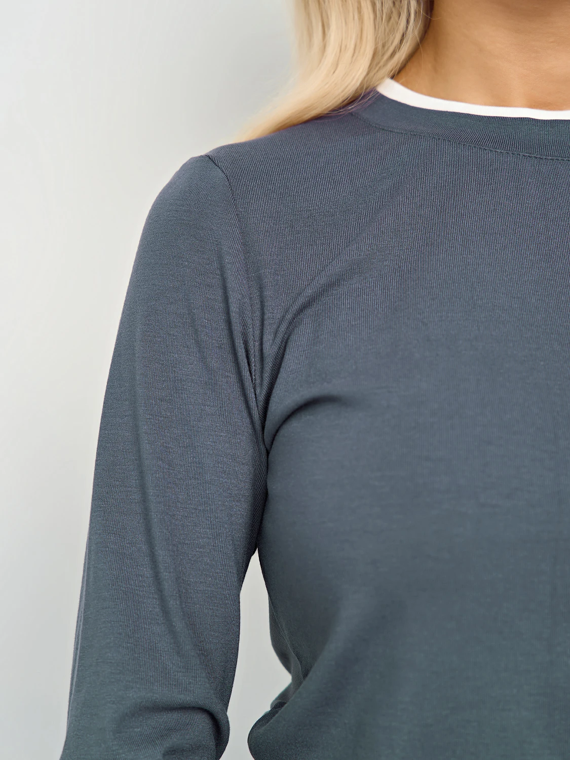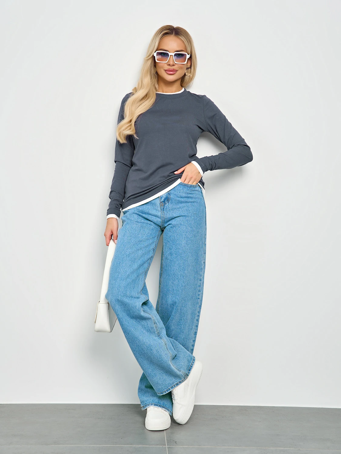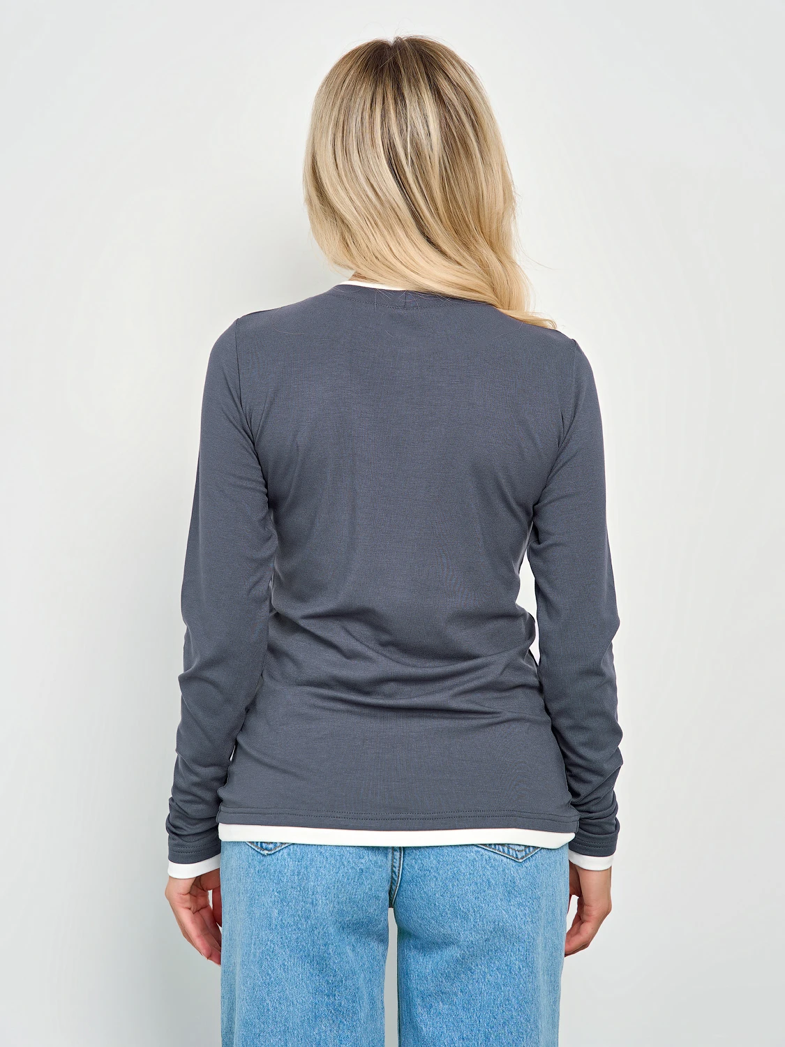 Горловина, низ рукава и низ изделия отделаны контрастным материалом, имитирующим второй слой.