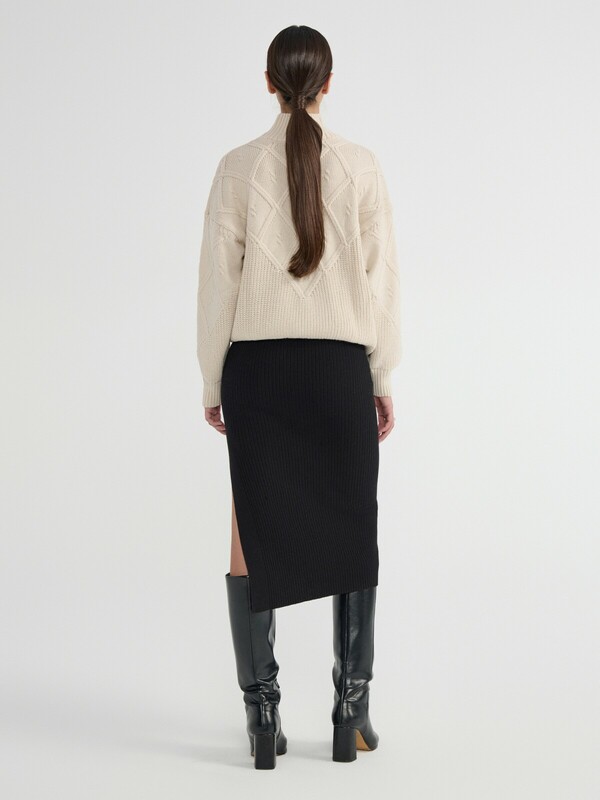 "Юбка в рубчик из пряжи с хлопком и шерстью поможет создать женственный и стильный образ на каждый день и на особый случай. Модель будет отлично гармонировать с вещами из базового гардероба.
