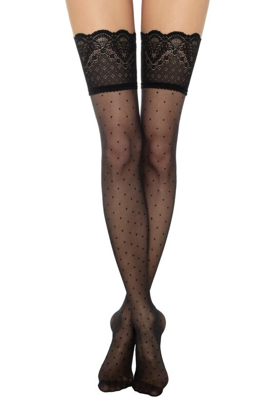 Тонкие чулки с рисунком «в горошек» и широкой ажурной резинкой – то, что нужно для стильных образов и абсолютной уверенности в себе!· самоподдерживающаяся ажурная резинка· плотное облегание · эластичные и легкие.