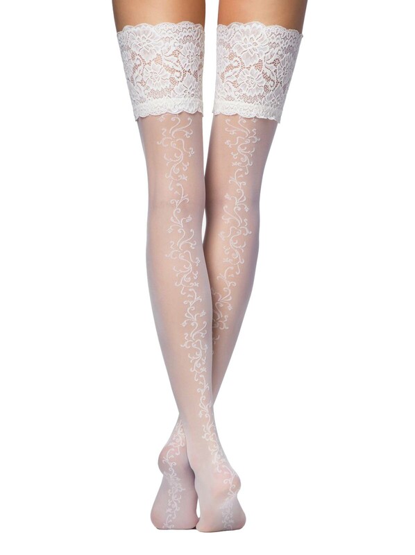 Тонкие эластичные фантазийные чулки 20 ден с широкой кружевной самоподдерживающейся резинкой. Рисунок в ножке - "Цветочная лиана, расположенная сзади ноги".