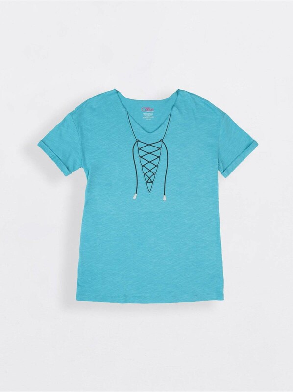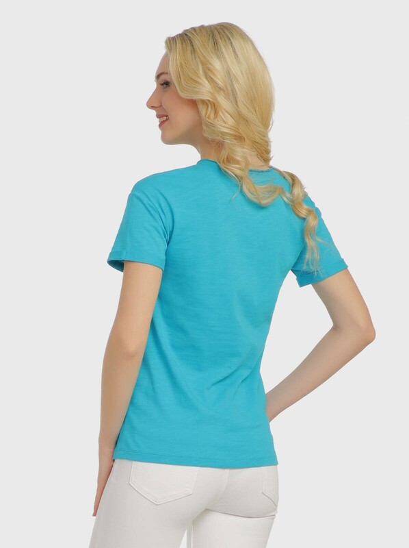 Джемпер женский из однотонного трикотажного полотна. Рукав короткий с отложным манжетом и со спущенной линией плеча. Горловина V образной формы. Низ джемпера и горловина обработаны густой обметкой "бабилок". По переду нанесен рисунок имитация застежки.