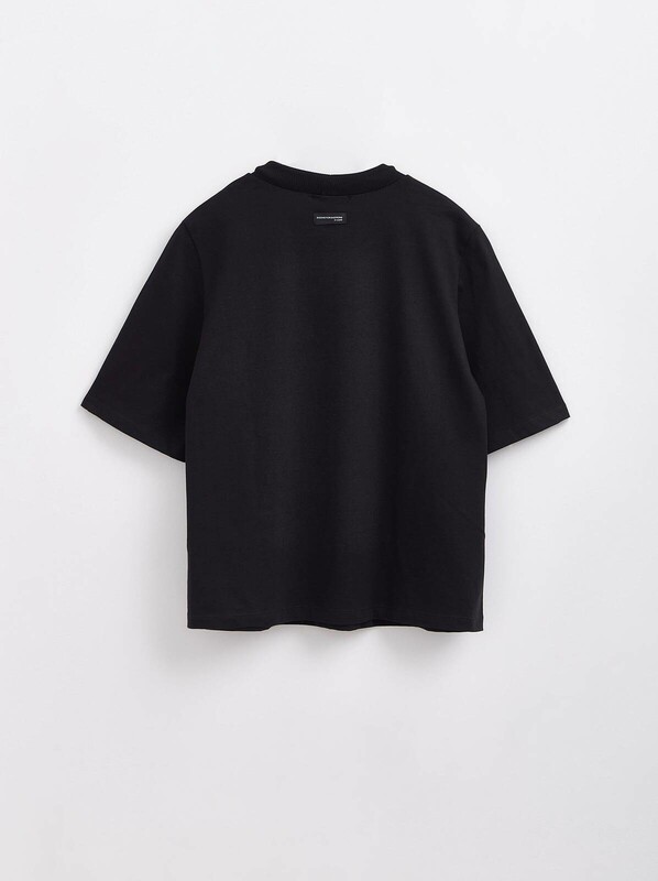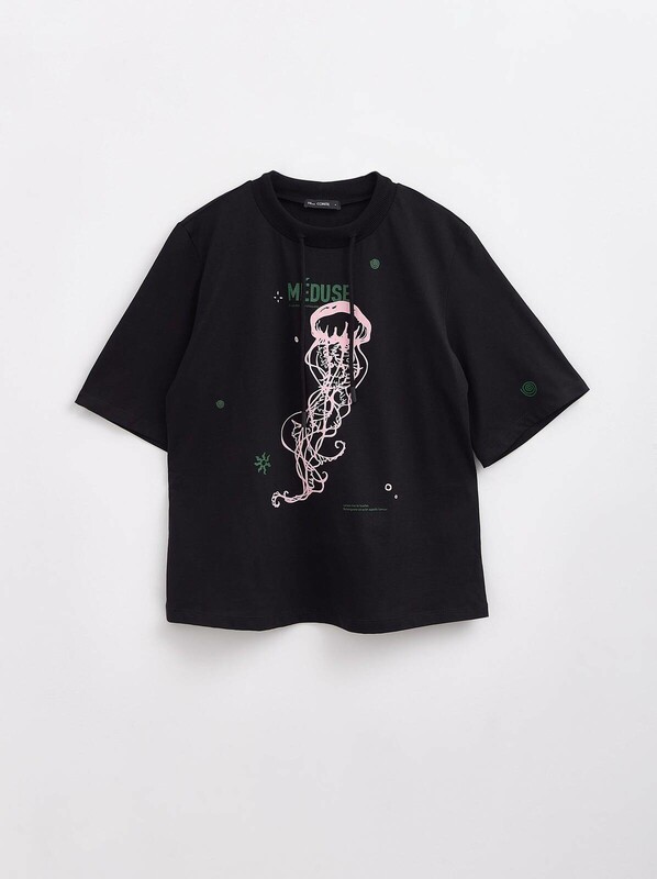 Oversize-футболка со шнуровкой «Meduse» станет основой для множества расслабленных базовых образов. · oversize· круглый вырез горловины · притачная планка в рубчик· по планке выметаны петли и втянут декоративный шнурок· рукава до локтя· печатный рисунок «Meduse»· 100% хлопок· сохранение формы при соблюдении рекомендаций по уходу.