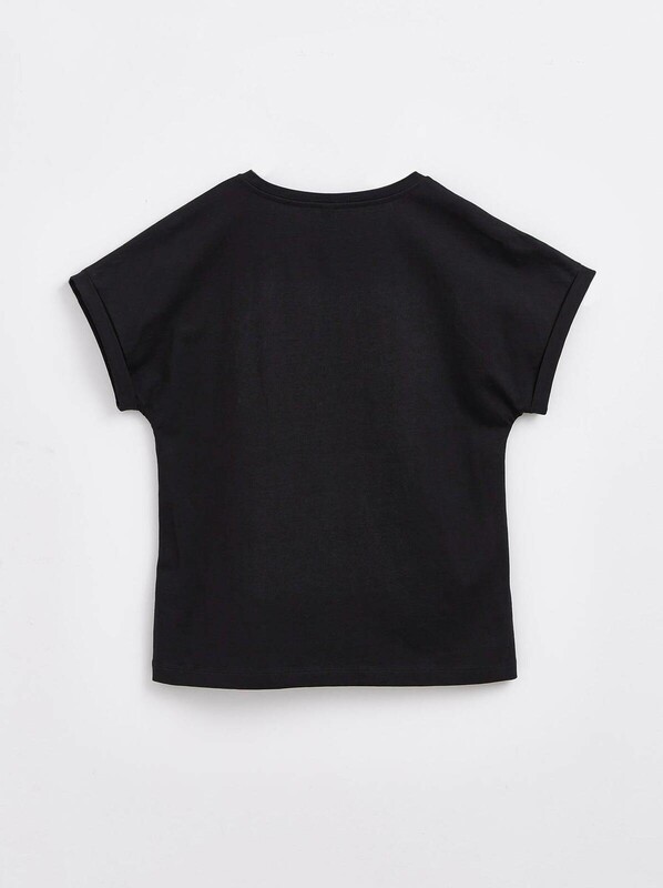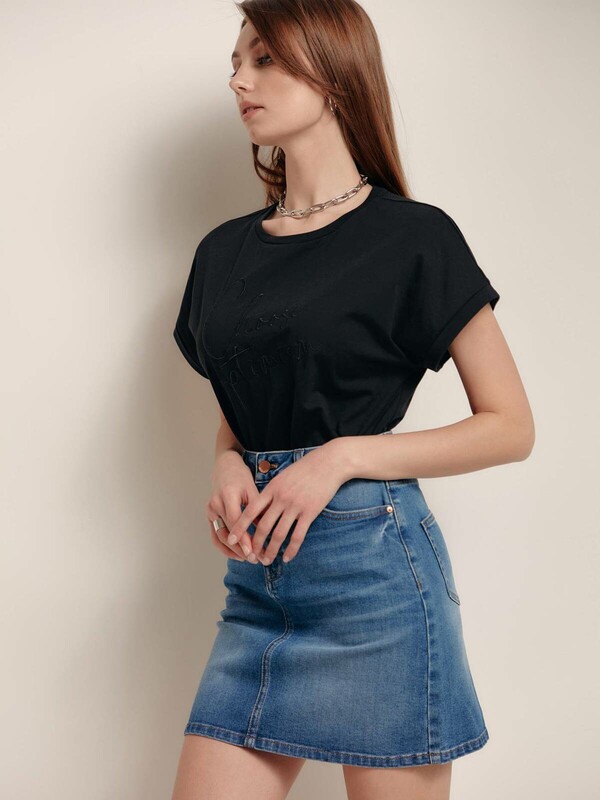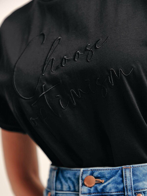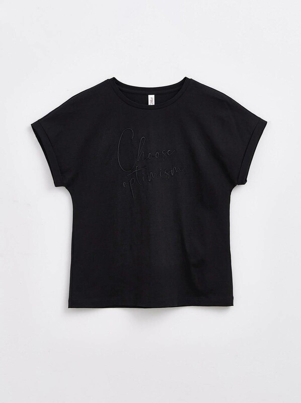Черная футболка прямого силуэта LD 1221 из мягкого хлопка сочетает в себе минимализм и оригинальные тенденции уличной моды. · прямой силуэт· круглый вырез горловины· спущенная линия плеча· короткий рукав с отложным цельнокроеным манжетом· вышивка «Choose optimism»· мягкий 100% хлопок· устойчивый цвет и сохранение формы при соблюдении рекомендаций по уходу· прекрасный вариант на каждый день. хлопок 100%