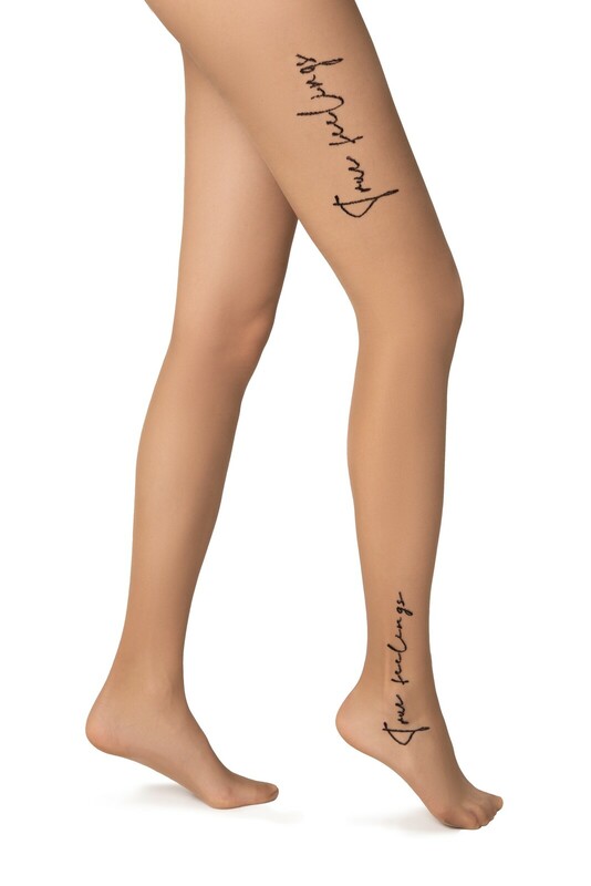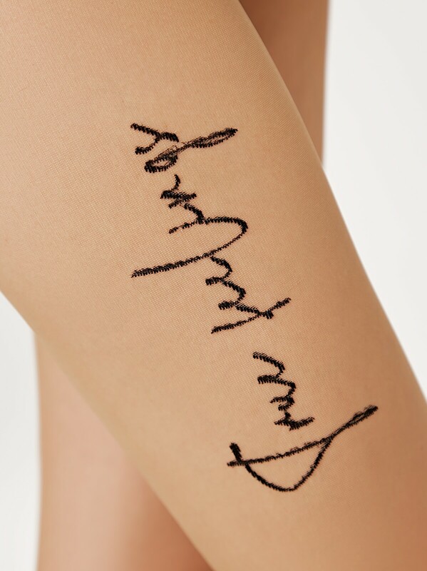 Тонкие эластичные фантазийные женские колготки 30 ден с рисунком "имитация тату" в виде надписи черной полиамидной нитью в области щиколотки и бедра, рисунок расположен на одной ноге, двойной оплет нити, плоский шов, хлопковая ластовица, укрепленный мысок.