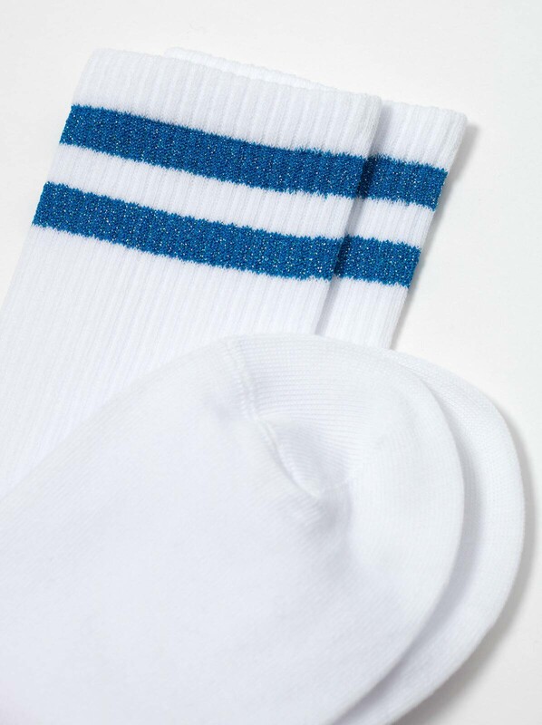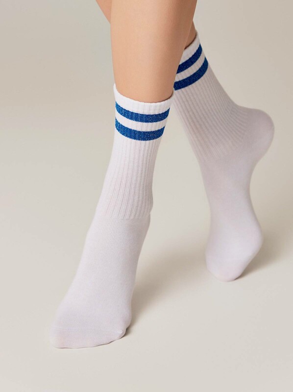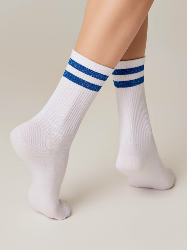 Хлопковые носки с яркими полосками из люрекса смотрятся так стильно и оригинально, что вам не захочется прятать их под одеждой. Смело носите трендовые носочки ACTIVE в стиле спорт-шик и с удовольствием подчеркивайте свою индивидуальность.
