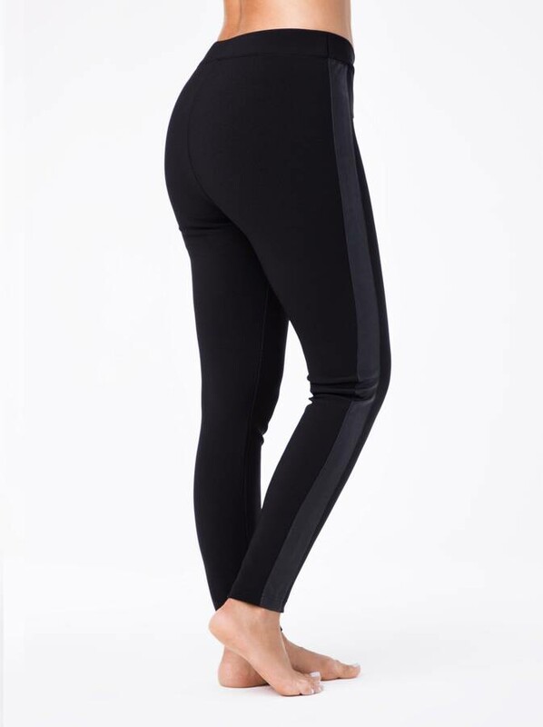 Леггинсы женские из однотонного трикотажного полотна. По боку вдоль ножки лампас из кожи переходящий вверху в фигурную кокетку. По шву лампаса и кокетки - отделочная строчка. Верх изделия обработан поясом с эластичной тесьмой внутри.