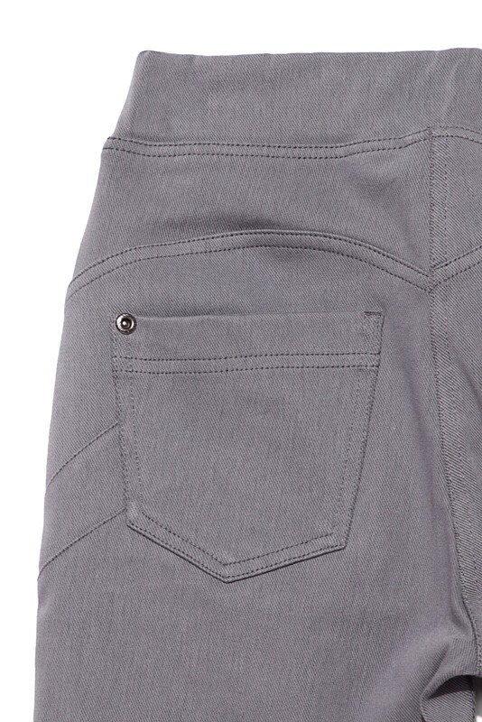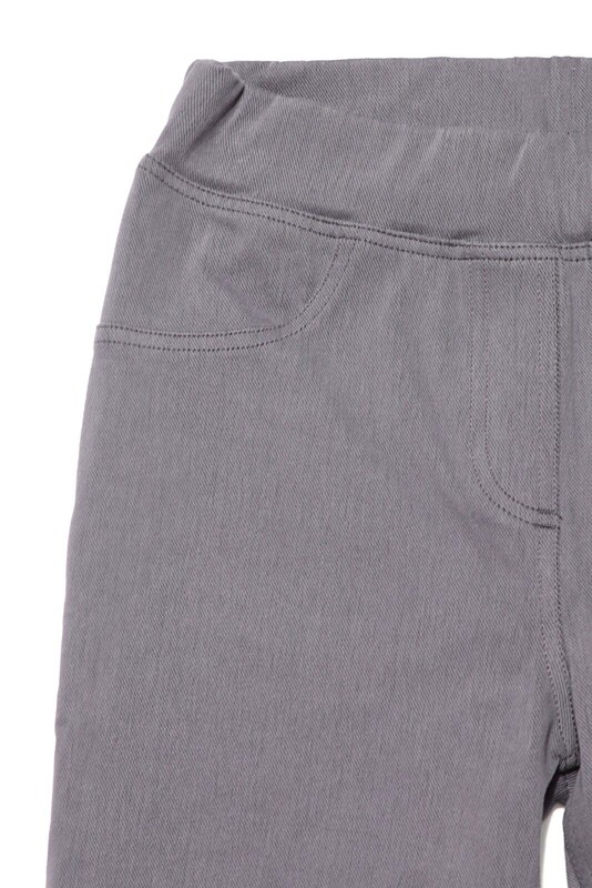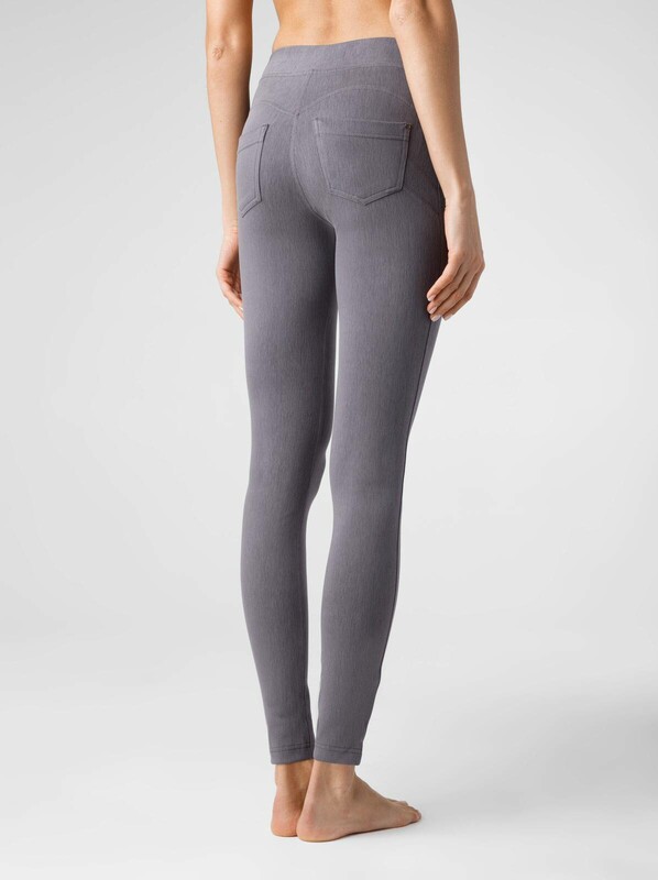 Леггинсы женские облегающие из трикотажного полотна "джинс". По переду изделия-имитация гульфика и боковых карманов. По спинке - фигурные кокетки, 4 боковые вытачки и накладные карманы. Верх изделия обработан поясом с широкой резинкой внутри.