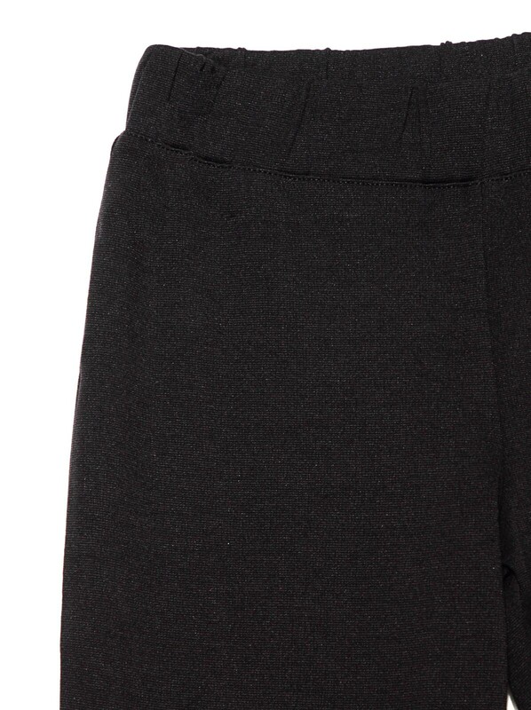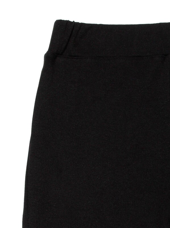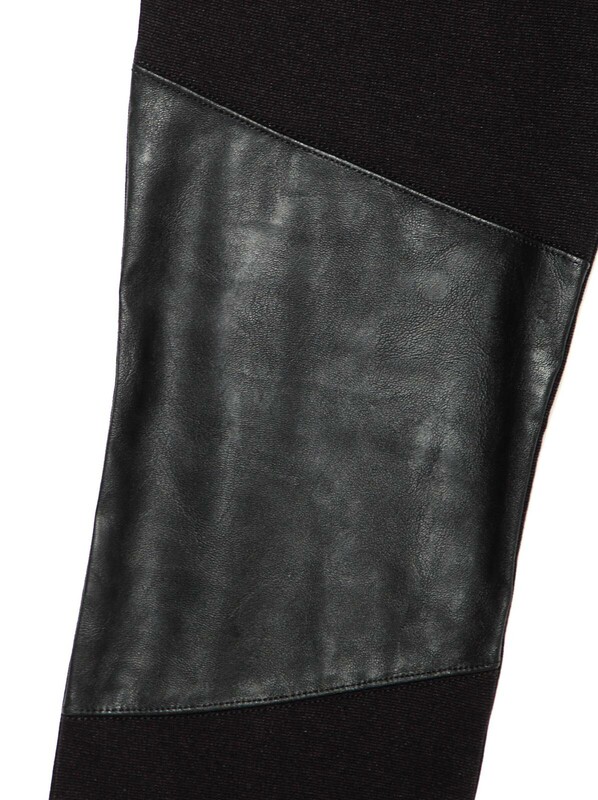 Леггинсы женские из трикотажного полотна. По передним половинкам на уровне колена отделочная деталь из искусственной кожи. по швам притачивания отделочной детали выполнены отделочные строчки с узкой расстановкой игл. Верх изделия обработан поясом с широкой резинкой внутри. По шву притачивания пояса выполнена узкая отделочная строчка. вискоза 63%, полиамид 31%, эластан 6%