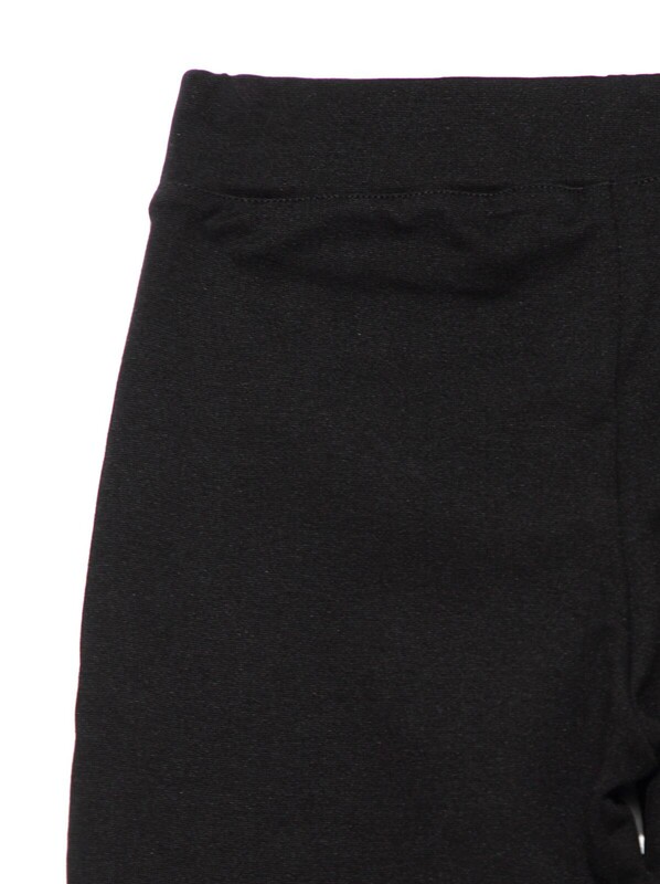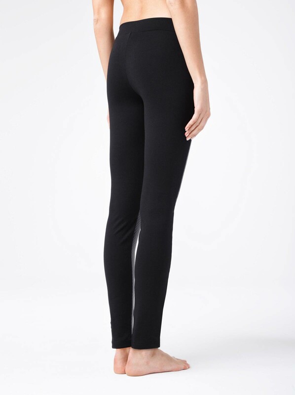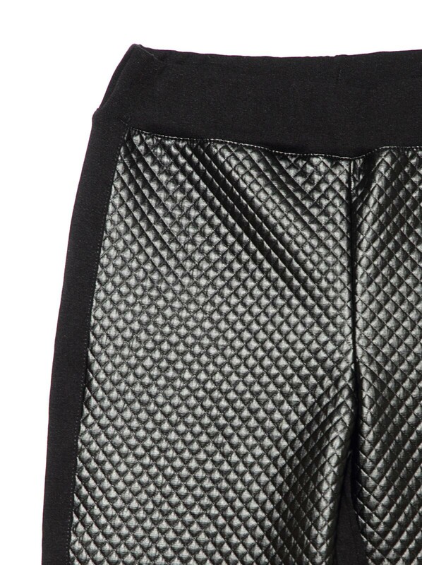 Леггинсы женские из трикотажного полотна комбинированные. Передние половинки выполнены из трикотажного полотна "под искусственную кожу" стеганное. Задние половинки и пояс выполнен из однотонного трикотажного полотна. Верх изделия обработан поясом с широкой резинкой внутри. По боковым швам и шву притачивания пояса проложена отделочная строчка с узкой расстановкой игл.