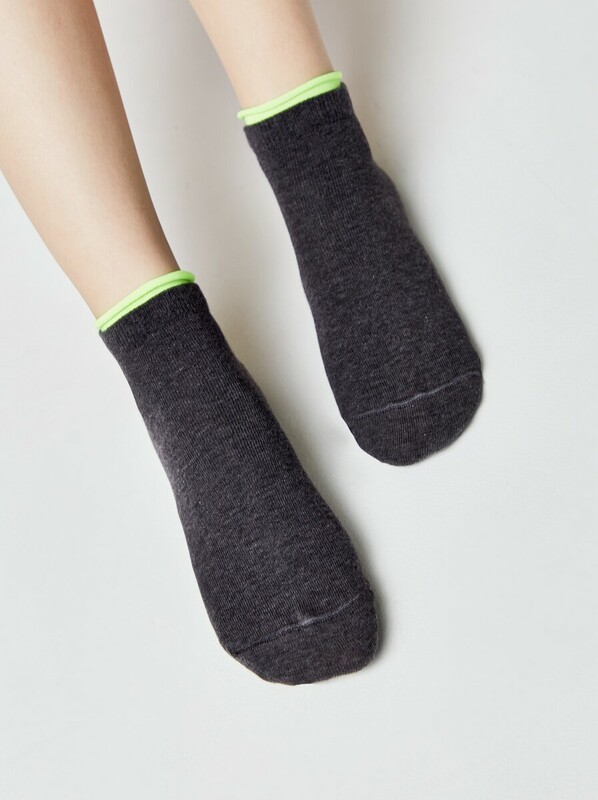 Укороченные спортивные женские носки из хлопка, однотонные с контрастной декоративной отделкой по краю резинки.