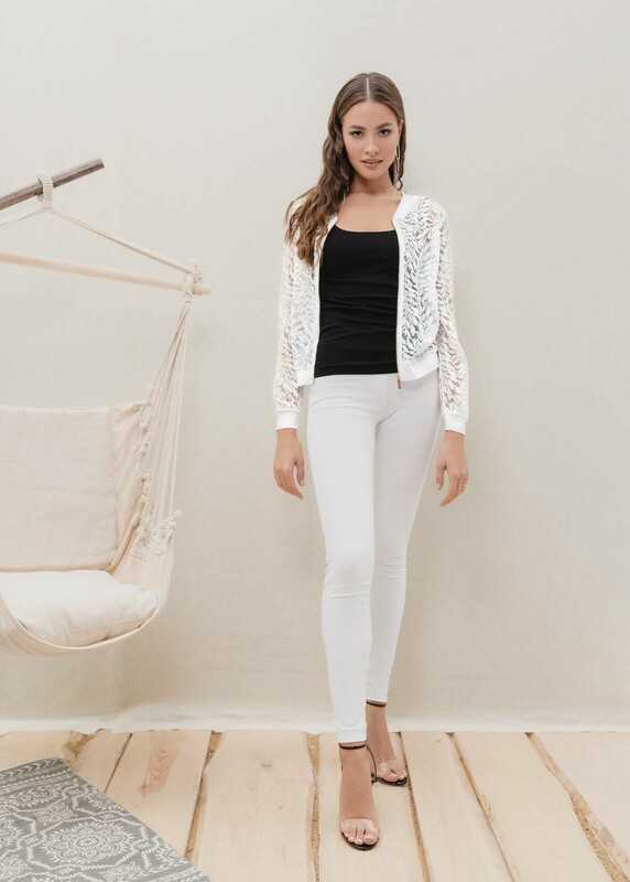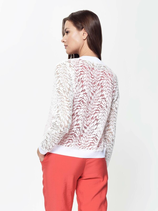 Кружевной бомбер с металлической молнией станет незаменимой вещью в весенне-летнем гардеробе девушки. Модница оценит трендовое объемное кружево с растительным мотивом. Бомбер безупречно сидит по фигуре благодаря облегающим манжетам и эластичному поясу.