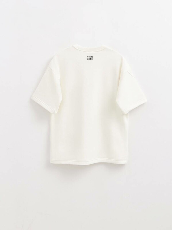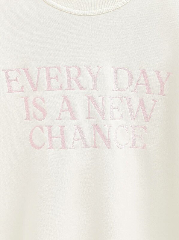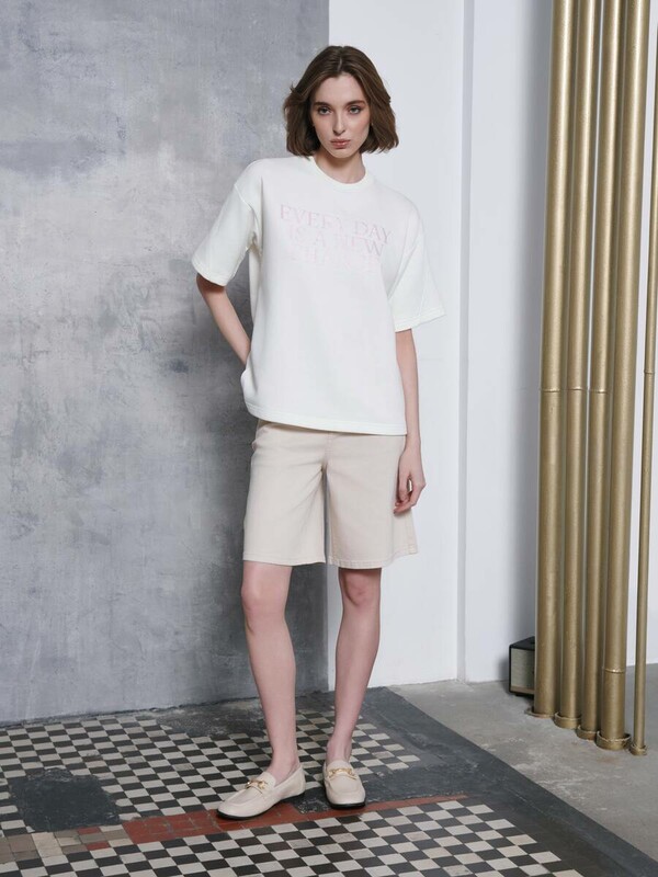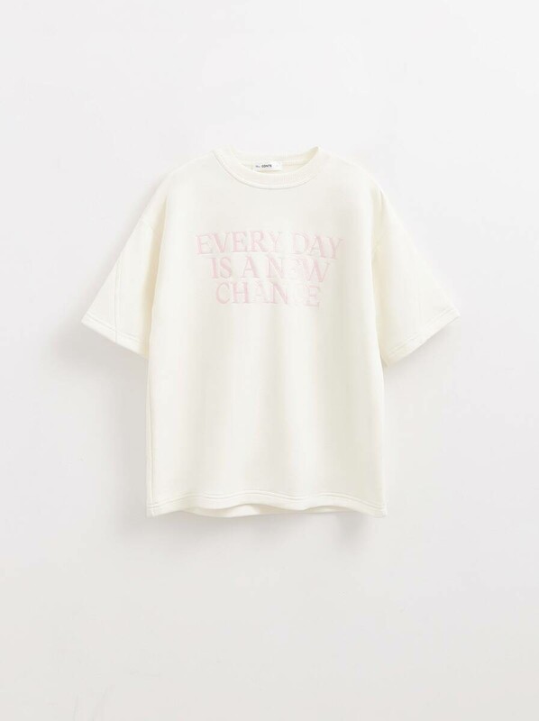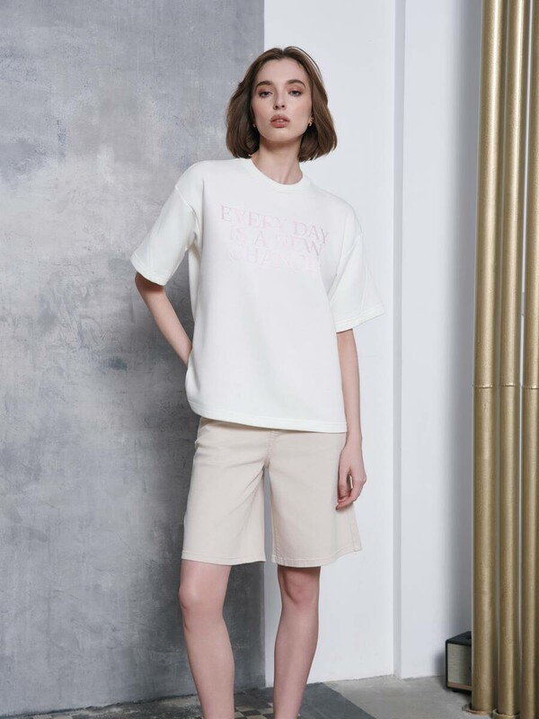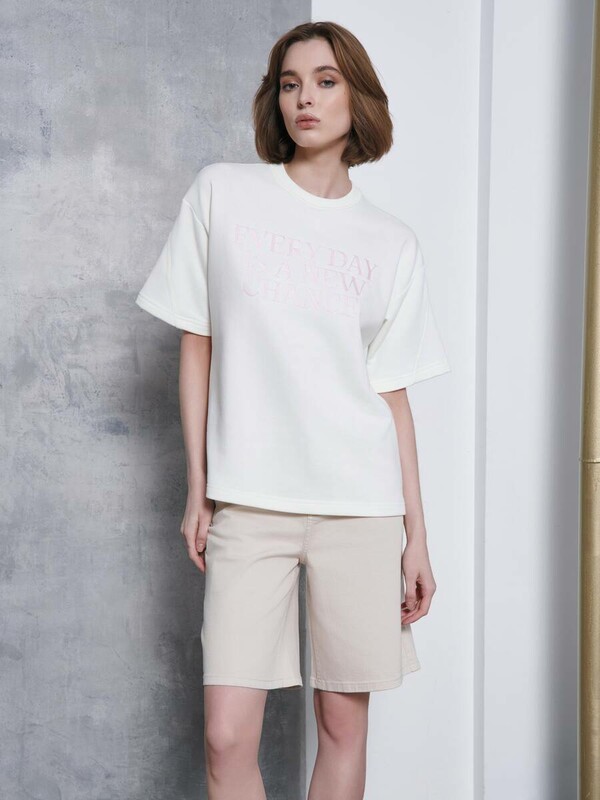 Свободная футболка из футера с вышивкой «Every day is a new chance» станет основой для множества расслабленных базовых образов. • умеренный oversize • удлиненная модель • круглый вырез горловины с планкой в рубчик • спущенная линия плеч • короткие втачные рукава с акцентными строчками • мягкий и приятный к телу футер без начеса • вышивка «Every day is a new chance» • по спинке - лаконичная объемная печать с логотипом бренда • сохранение формы и цвета при соблюдении рекомендаций по уходу • безупречный стиль и абсолютная свобода в движениях • всегда приятно открывать новые грани в привычной вещи. bumbac 83%, poliester 17%