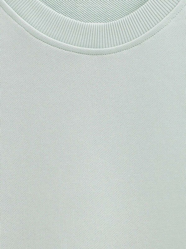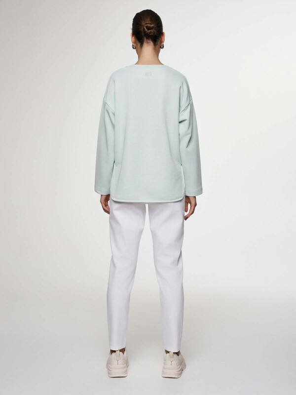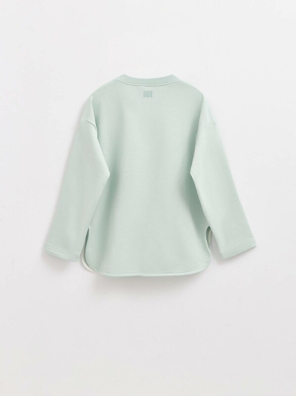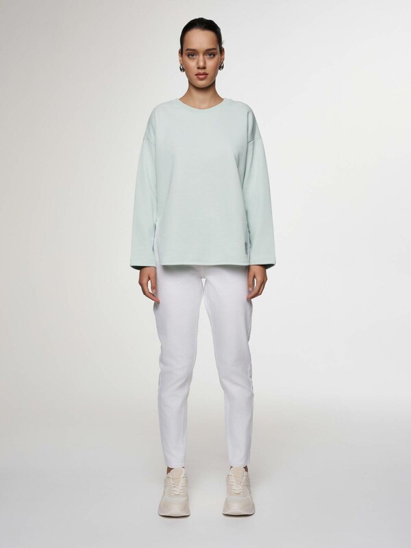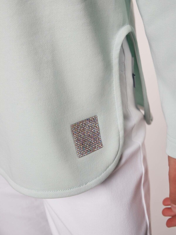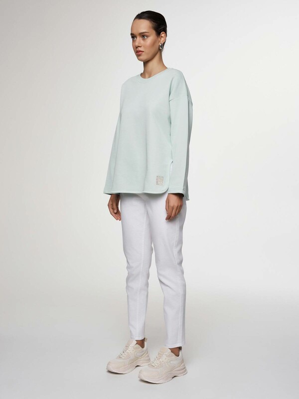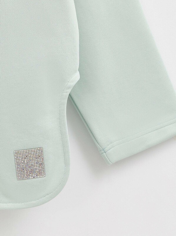 Лонгслив из футера c разрезами по бокам и аппликацией из стразов станет основой для множества расслабленных базовых образов.