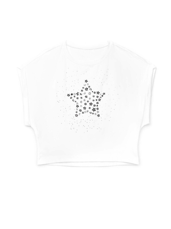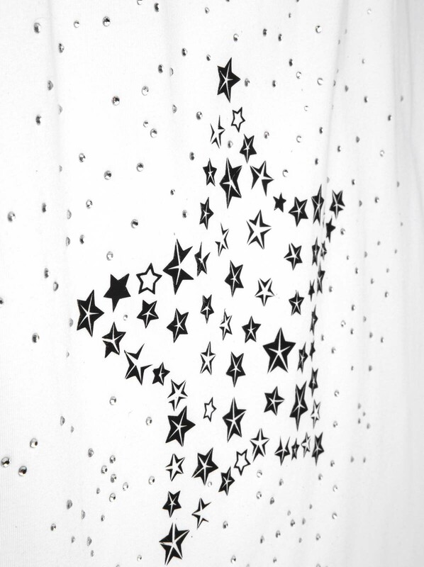 Хлопковая футболка в стиле oversize с приспущенным плечом и эффектным принтом с россыпью из стразов станет яркой изюминкой вашего летнего образа. В футболке будет легко и комфортно благодаря высокому содержанию хлопка в составе материала и свободному облеганию.