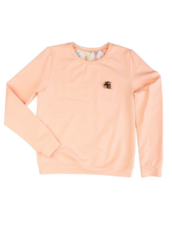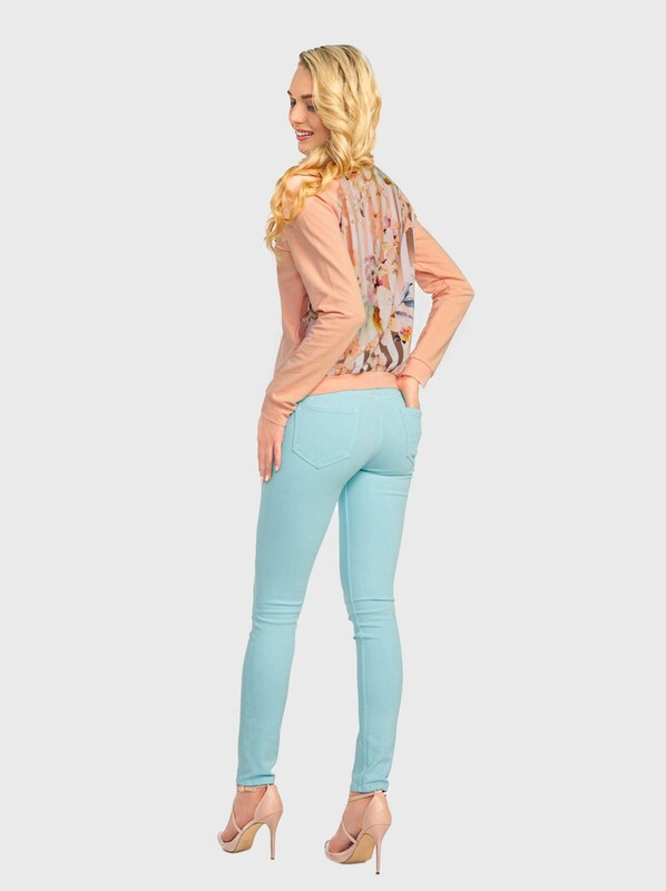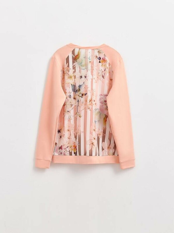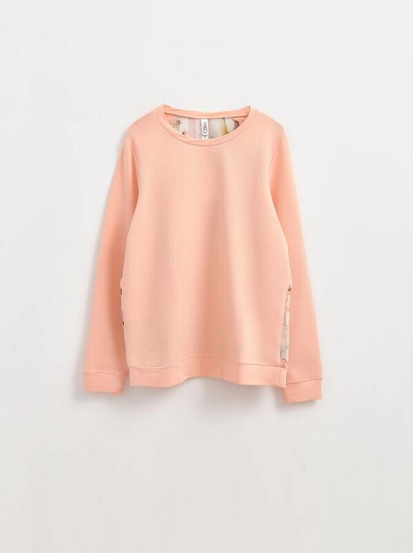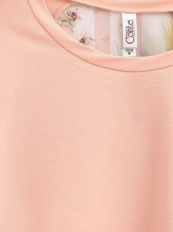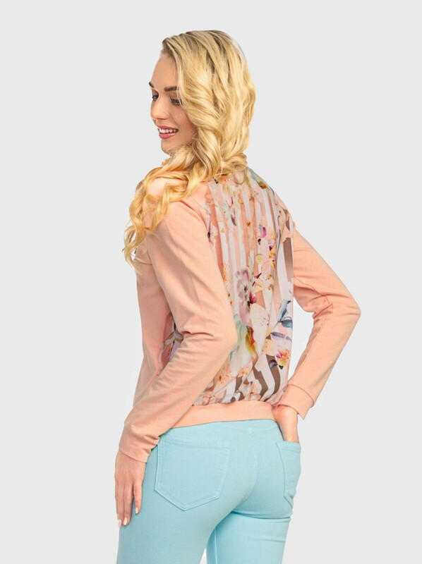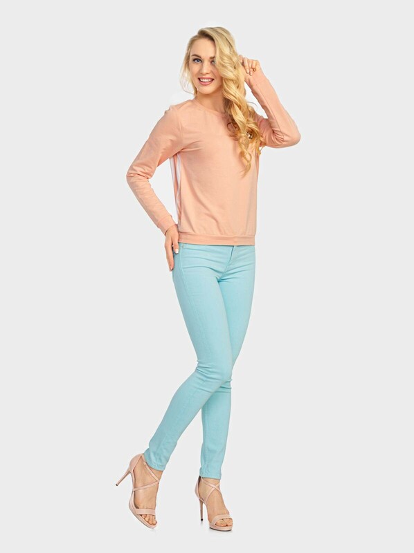 Джемпер женский из трикотажного полотна, комбинированный. Рукав длинный. Спинка выполнена из отделочного полотна. Горловина круглая, по низу джемпера и низу рукавов пришиты манжеты. На уровне груди, с левой стороны прикреплена брошь.