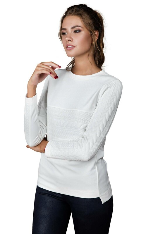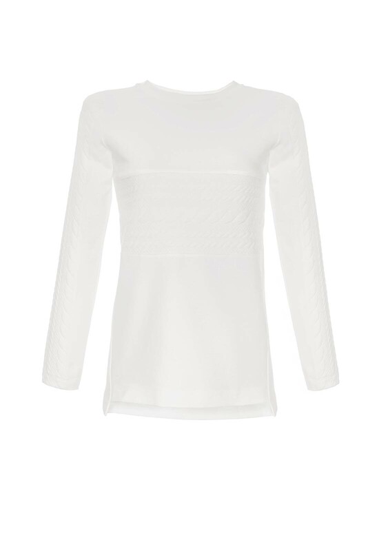 Лаконичный трикотажный джемпер полуприлегающего силуэта подходит для формирования базового повседневного гардероба. Мягкое, эластичное полотно с высоким содержанием вискозы. Изделие отлично держит заданную форму, легко в уходе, сохраняются первозданные качества даже после многочисленных стирок. Длинные рукава декорированы эффектным узором, имитирующим узорную вязку. Отличный комби-вариант для узких джинсов и кожаных леггинсов.