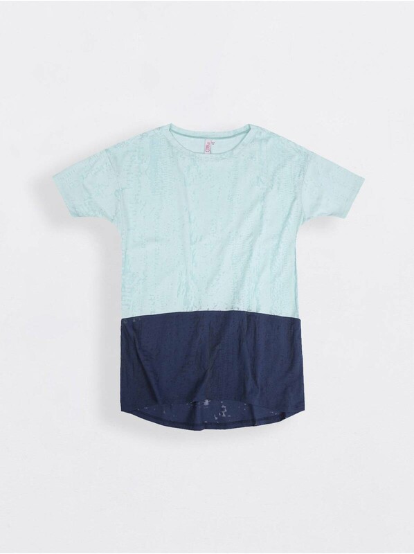 Джемпер женский удлиненный с коротким втачным рукавом. Линия плеча - спущенная. Горловина изделия обработана планкой. Трикотажное полотно с эффектом "вытравка". Верхняя и нижняя части джемпера - контрастные. полиэстер 50%, хлопок 50%