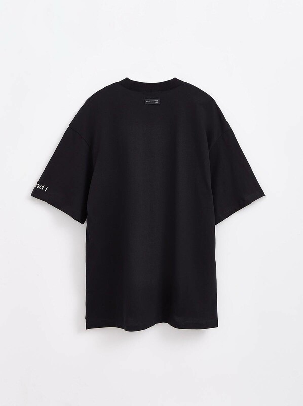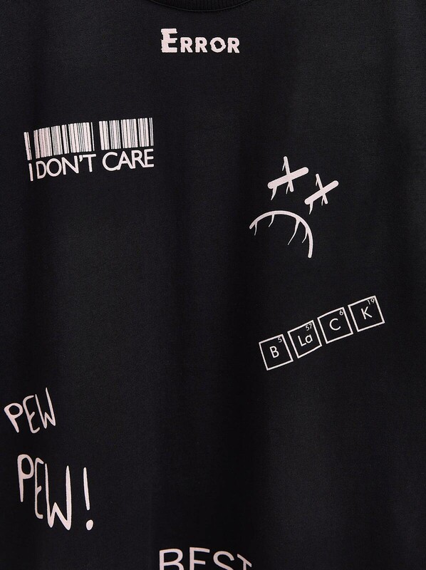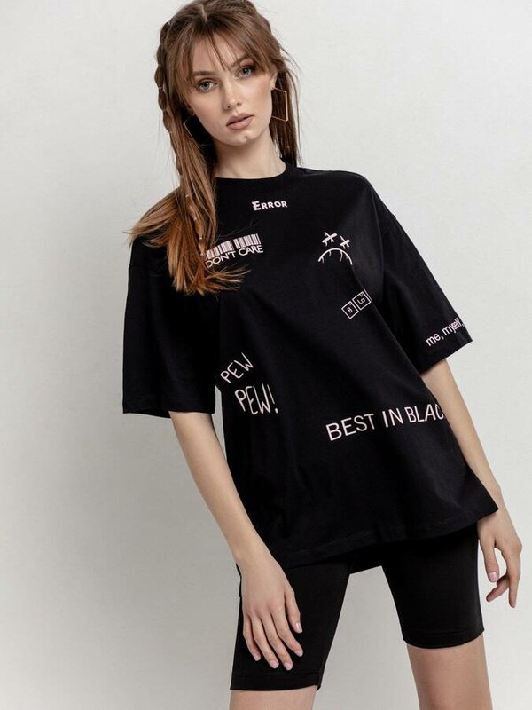 Oversize-футболка «Error» станет основой для множества расслабленных базовых образов. · oversize· круглый вырез горловины с планкой в рубчик· по верху спинки нашивка «Designed for emotions»· спущенная линия плеча· рукава до локтя· разрезы по бокам· печатные рисунки «Error»· слегка удлиненная спинка· 100% хлопок