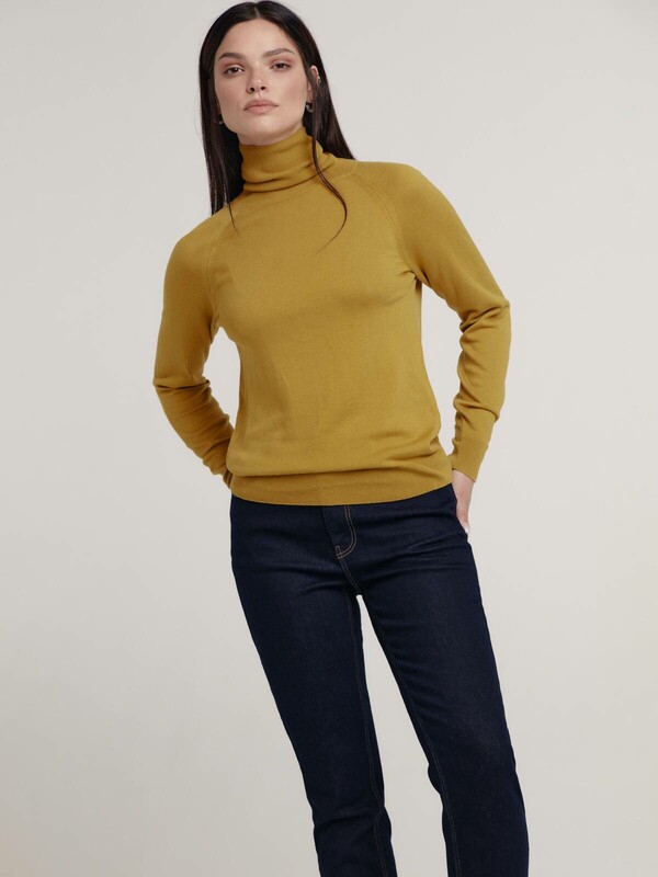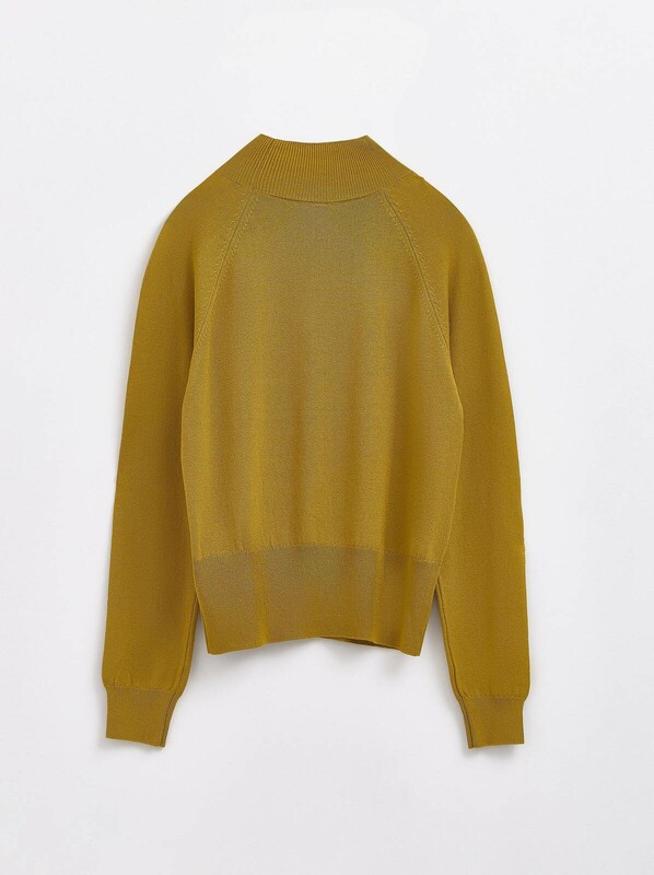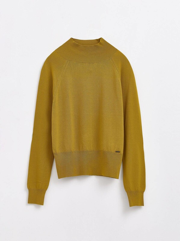 Укороченный джемпер с воротником-стойкой из шелковистой вискозной пряжи - лаконичная модель, которая поможет создать множество новых повседневных и офисных образов, не изменяя собственному стилю. SILK TOUCH VISCOSE: вискоза премиального качества с благородным матовым блеском по своим свойствам повторяет натуральный шелк. Дарит легкость, и абсолютный комфорт на протяжении всего дня. · воротник-стойка в мелкий рубчик· длинные рукава реглан с манжетами в рубчик· укороченный силуэт с акцентом на талии· вискозная пряжа премиального качества · металлическая пластинка с логотипом бренда· лаконичная и комфортная модель.