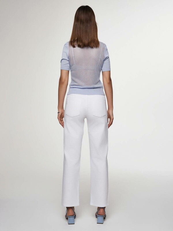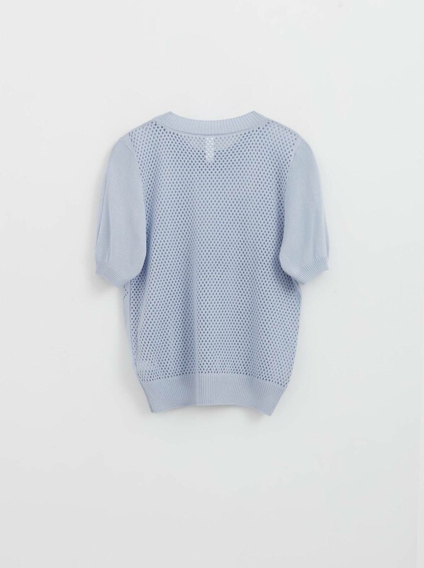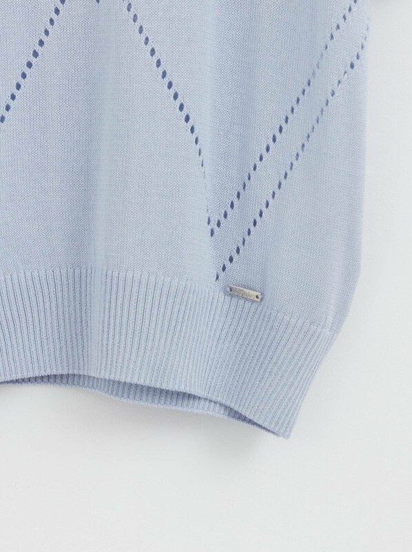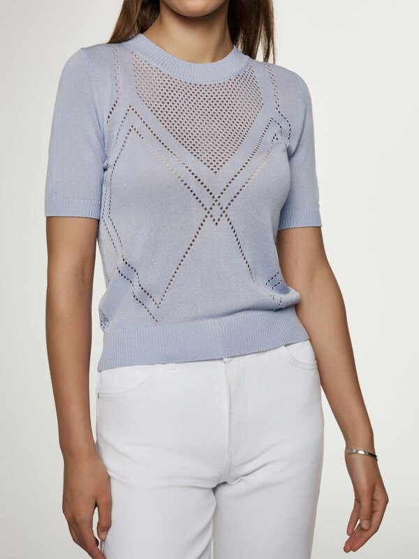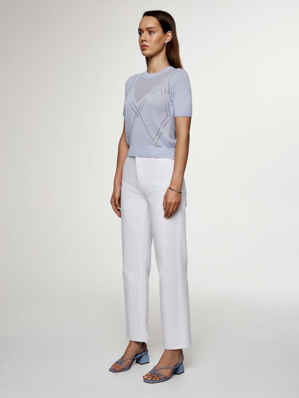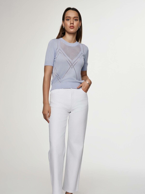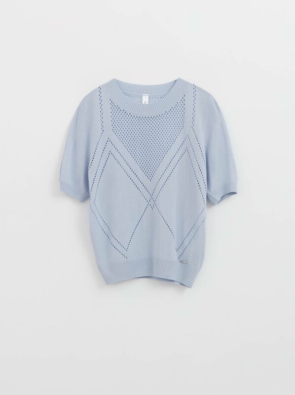 Джемпер прямого силуэта связан из тонкой шелковистой пряжи на основе вискозы красивым сочетанием ажурного переплетения и кулирной глади. Модель поможет подчеркнуть индивидуальность и сделает повседневный образ элегантным. · круглый вырез горловины· классическая линия плеч· короткие втачные рукава· прямой силуэт· гладкая и приятная к телу пряжа с вискозой· сочетание двух переплетений: ажурного и кулирной глади· сохранение формы и цвета при соблюдении рекомендаций по уходу· лаконично, женственно и элегантно.