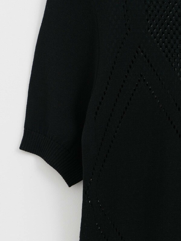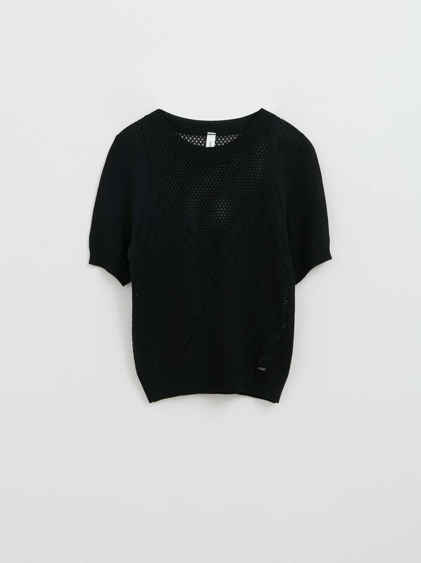 Джемпер прямого силуэта связан из тонкой шелковистой пряжи на основе вискозы красивым сочетанием ажурного переплетения и кулирной глади. Модель поможет подчеркнуть индивидуальность и сделает повседневный образ элегантным. · круглый вырез горловины· классическая линия плеч· короткие втачные рукава· прямой силуэт· гладкая и приятная к телу пряжа с вискозой· сочетание двух переплетений: ажурного и кулирной глади· сохранение формы и цвета при соблюдении рекомендаций по уходу· лаконично, женственно и элегантно.