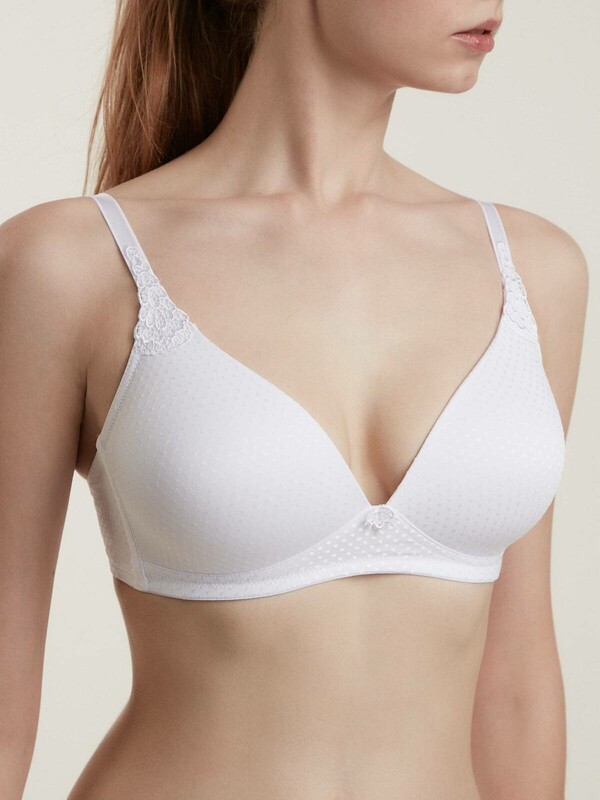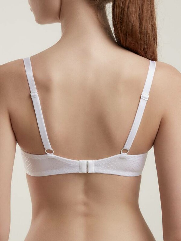 Бюстгальтер серии VOYAGE отличается чистотой линий и исключительным комфортом. Выполненный из полотна с деликатным жаккардовым рисунком «в горошек» и украшенный аппликациями макраме, бюстгальтер поможет создать одновременно простой и утонченный образ.