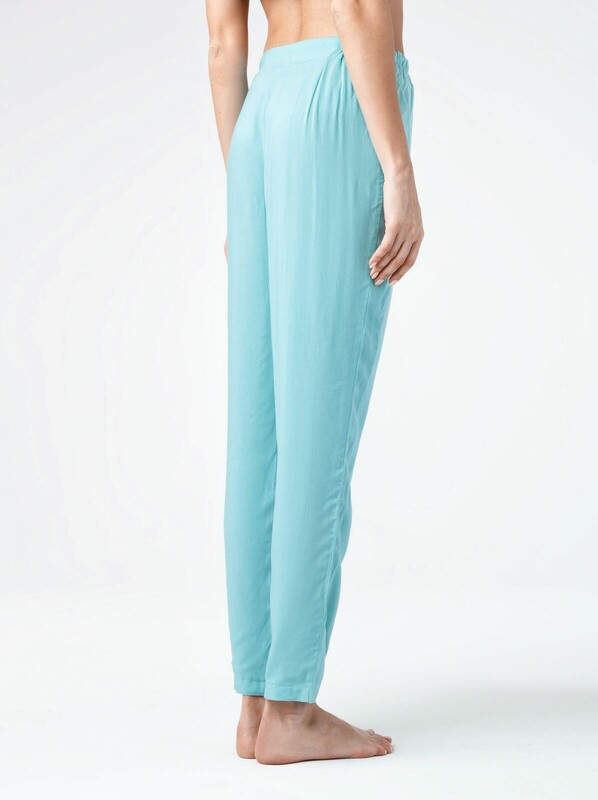Брюки женские из однотонного текстильного материала свободного покроя. В боковых швах-карманы. Низ изделия обработан швом в подгибку. Верхний срез изделия обработан притачным поясом с резинкой по бокам и узкими завязками вставленными по-переду в люверсы.