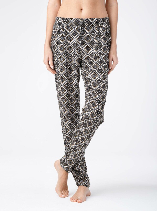 Брюки женские из набивного текстильного материала свободного покроя с карманами. Низ изделия обработан швом в подгибку. Верхний срез изделия обработан притачным поясом с резинкой по бокам и узкими завязками, вставленными по переду в люверсы. вискоза 100%