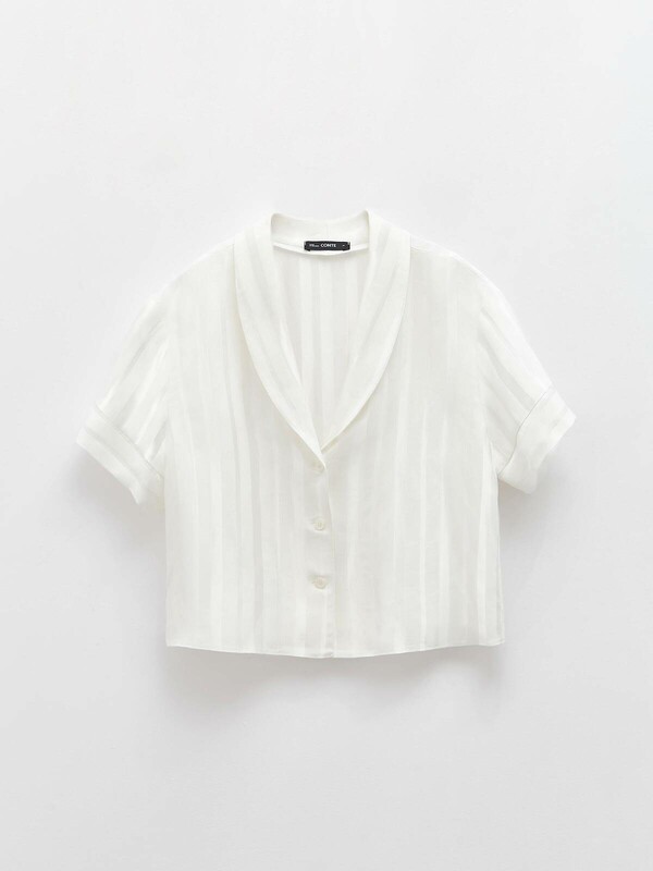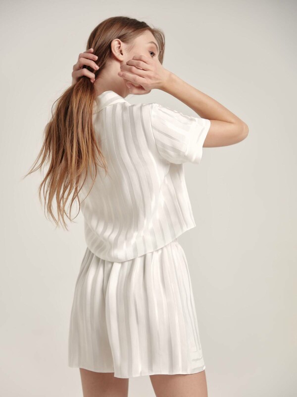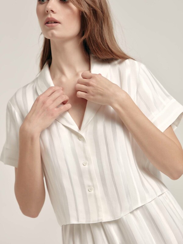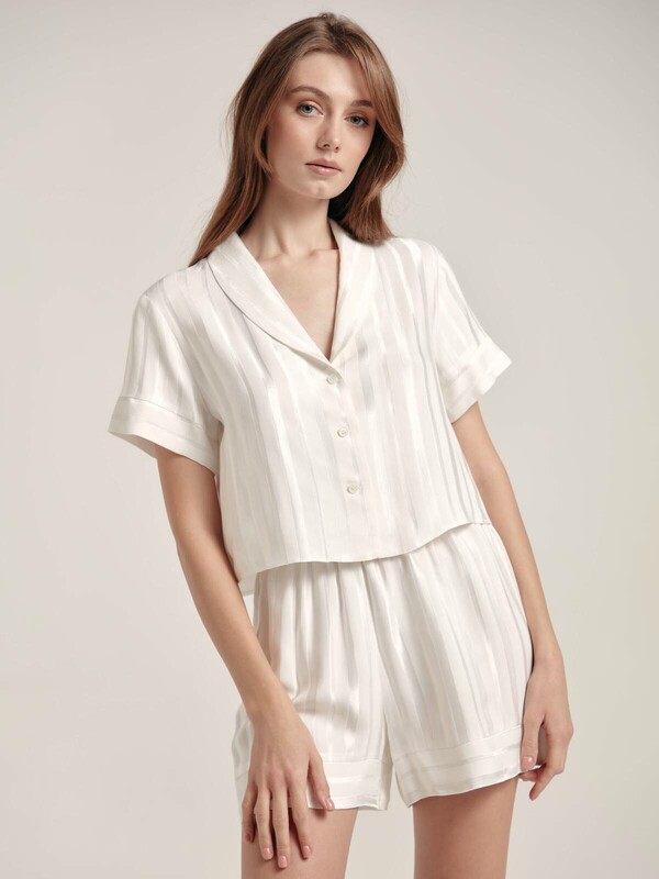 Укороченная домашняя блуза с атласными полосами LHW 1707 – эффектный и при этом комфортный вариант для стильного домашнего гардероба. SILK TOUCH VISCOSE: премиальная вискоза с эффектом «ощущение шелка» подарит мягкость и комфорт на протяжении всего дня. · V-образный вырез горловины· отложной воротник· короткие втачные рукава с манжетой по низу· центральная застежка на петли и пуговицы· умеренно свободный крой· укороченная модель· вискоза премиального качества · полотно с атласными вертикальными полосами· сохранение формы и цвета при соблюдении рекомендаций по уходу· эффектный и комфортный вариант для стильного домашнего гардероба.