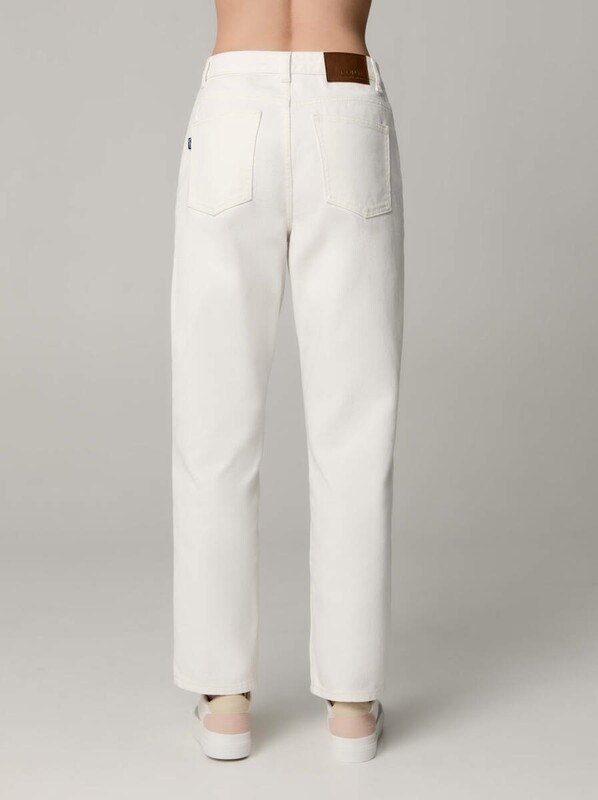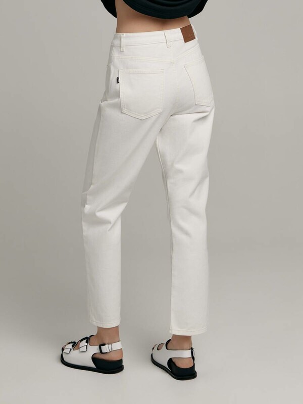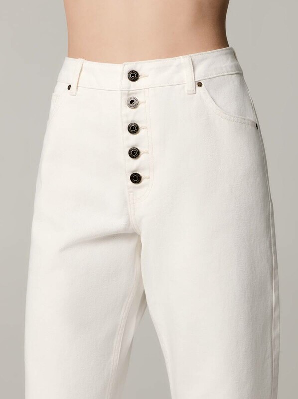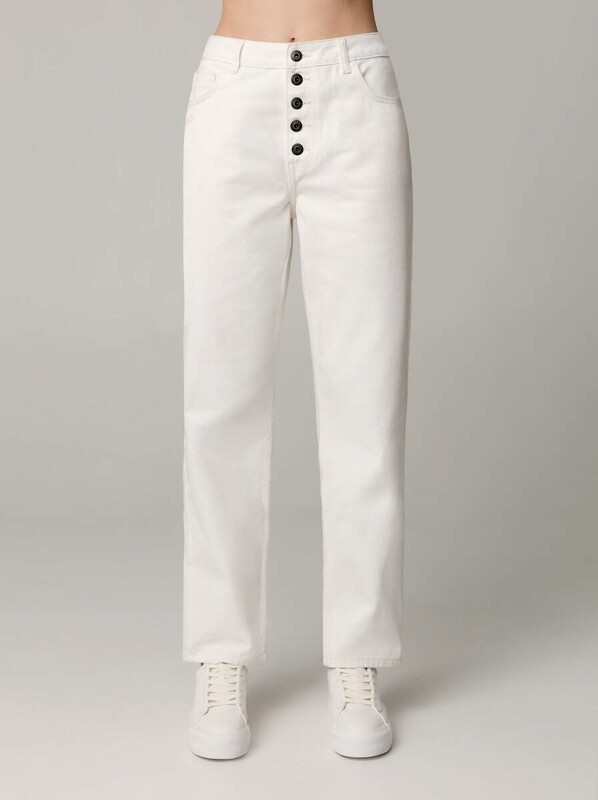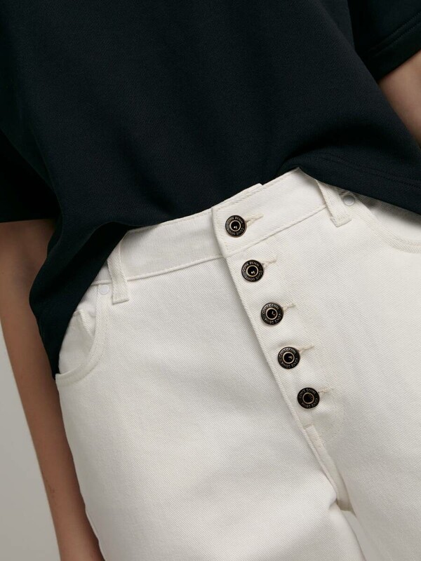 Джинсы на пуговицах из фактурного денима помогут создать актуальные повседневные и расслабленно-деловые образы.За безупречную посадку по фигуре отвечают высокая посадка, умеренно свободный силуэт и крой straight.