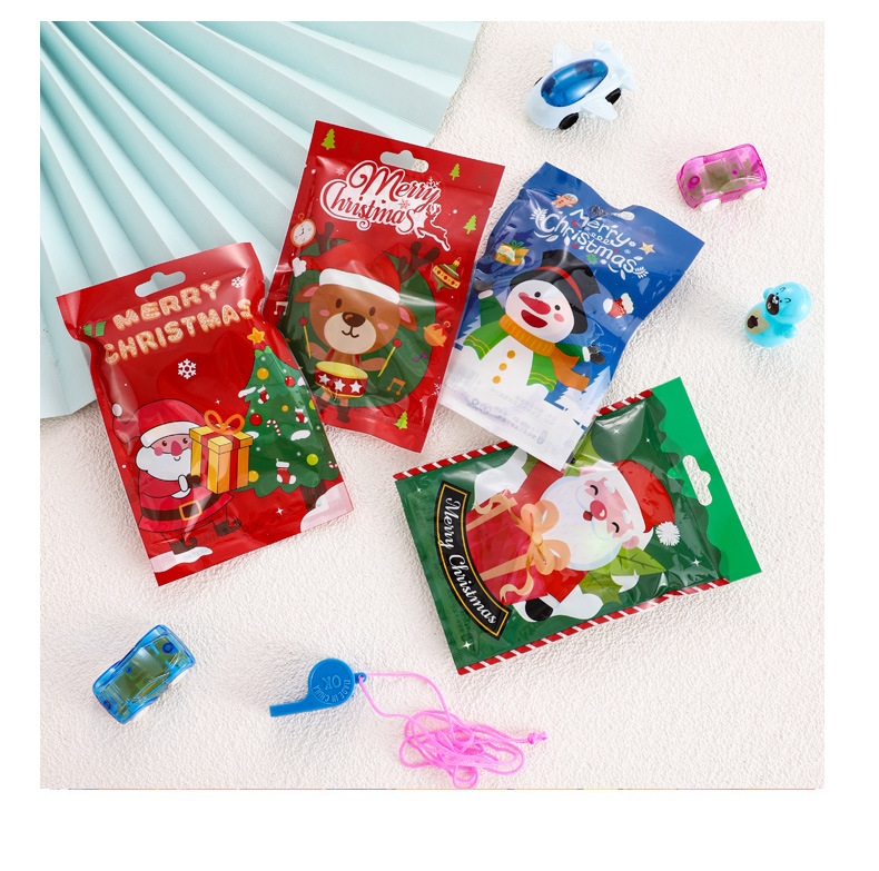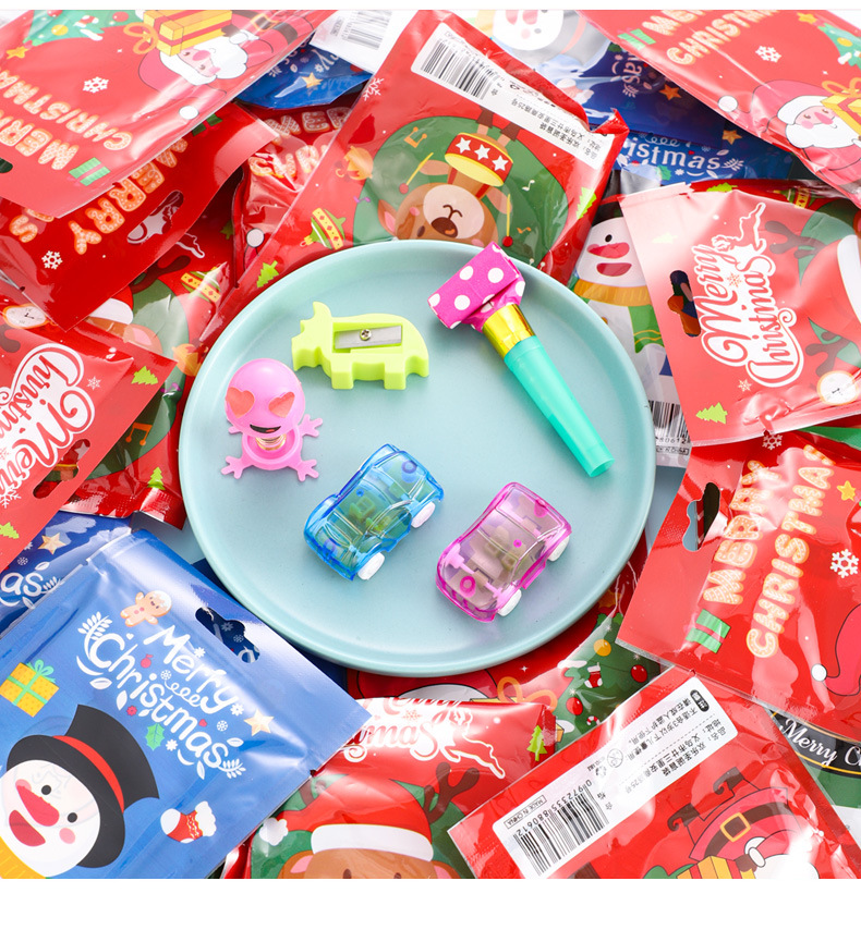 Яркие запаяные новогодние подарочные пакеты, в которых случайным образом попадаются различные презенты: точилки, блокнотики, игрушки, насадки для правильного письма, спирографы и мн другое.