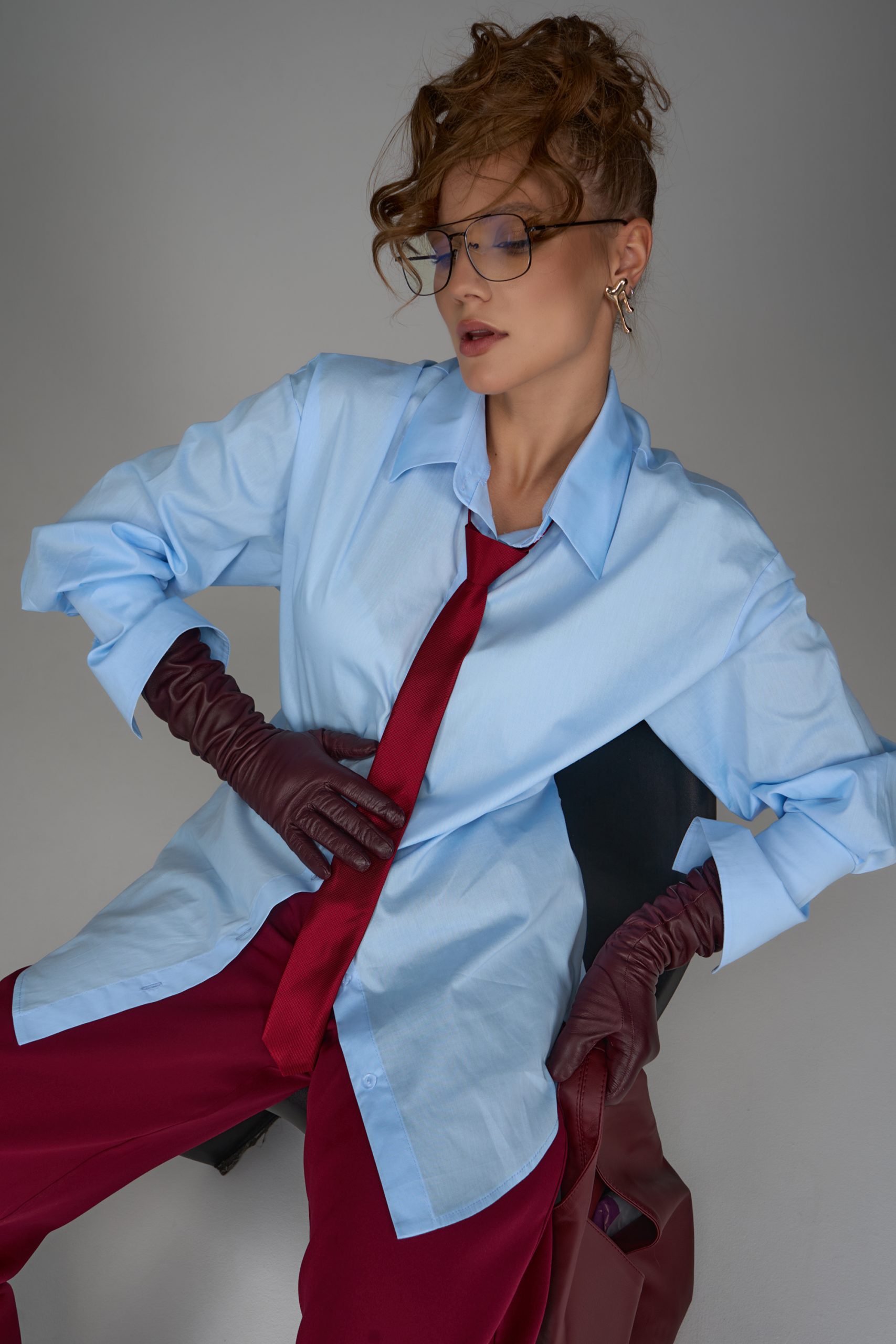 Стильная удлинённая рубашка прямого кроя с акцентом на талию.