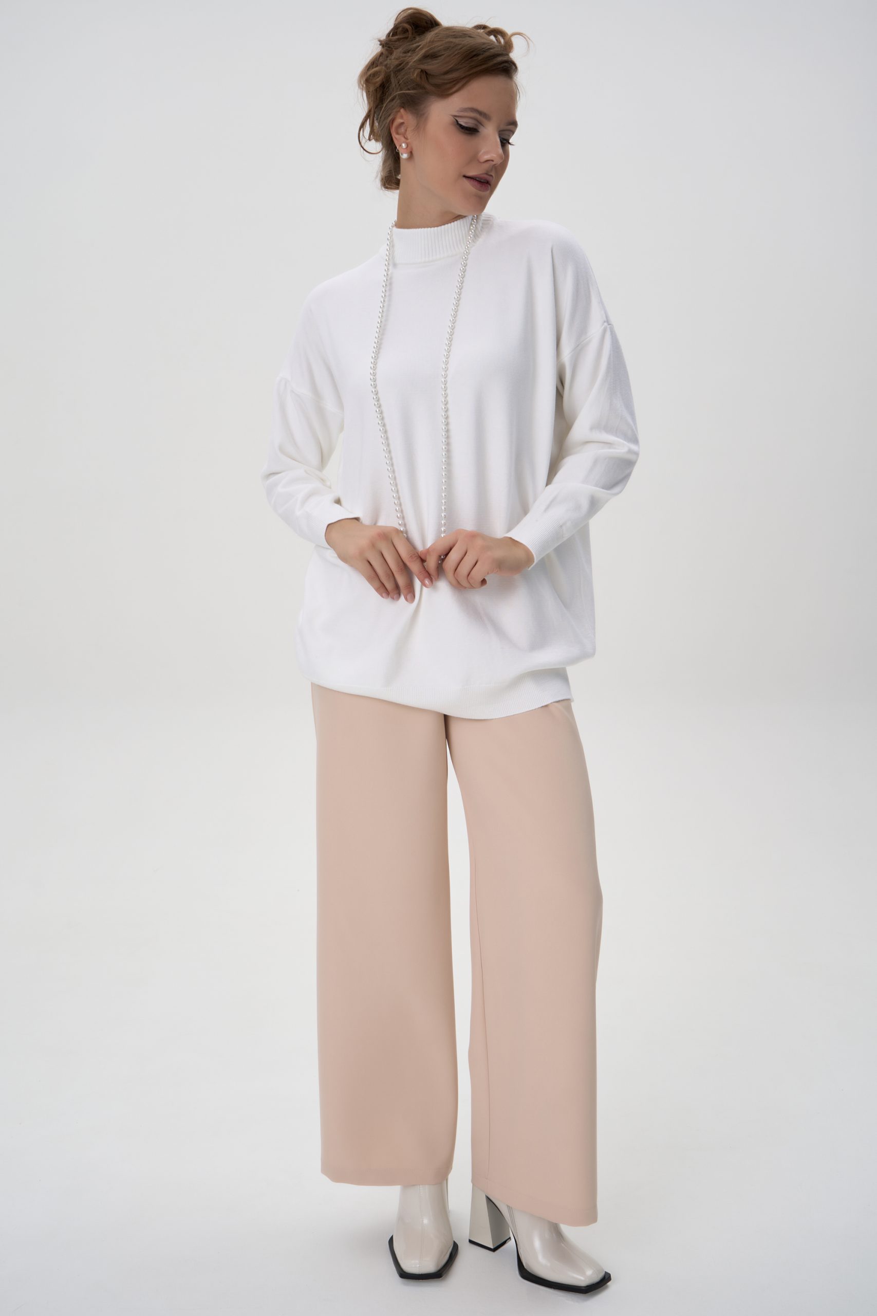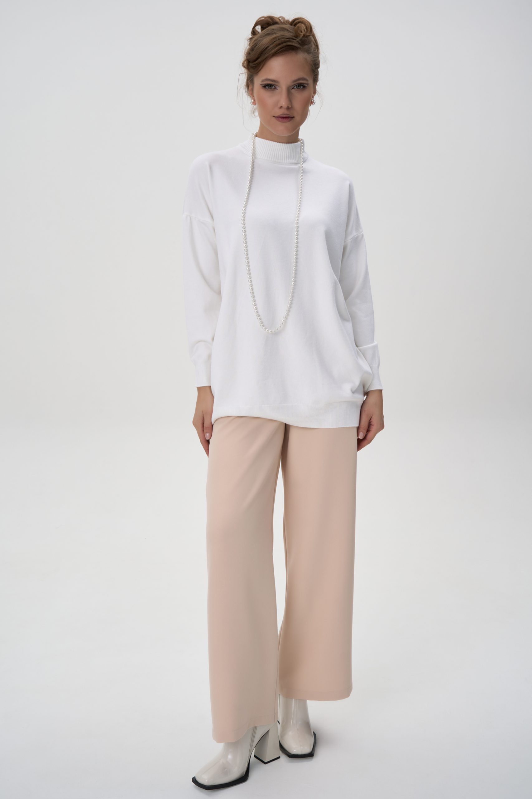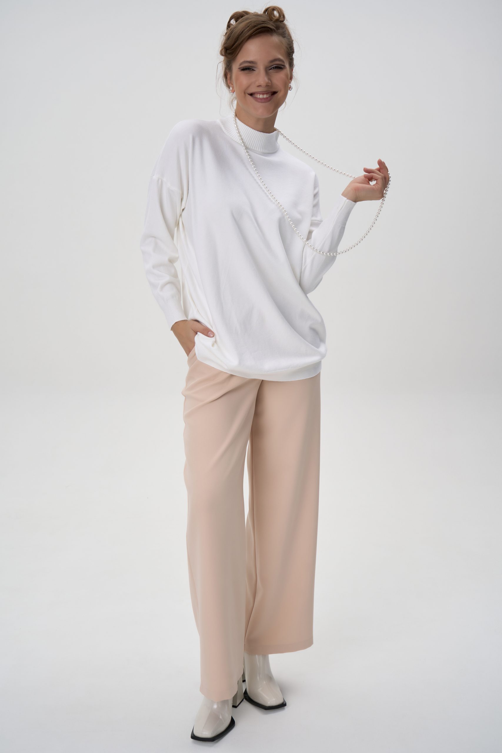 Благодаря свободному силуэту и эластичной фактуре трикотажа, пуловер комфортно садится по фигуре разного типа — подчёркивает линию плеч, не обтягивает и создаёт аккуратный силуэт.