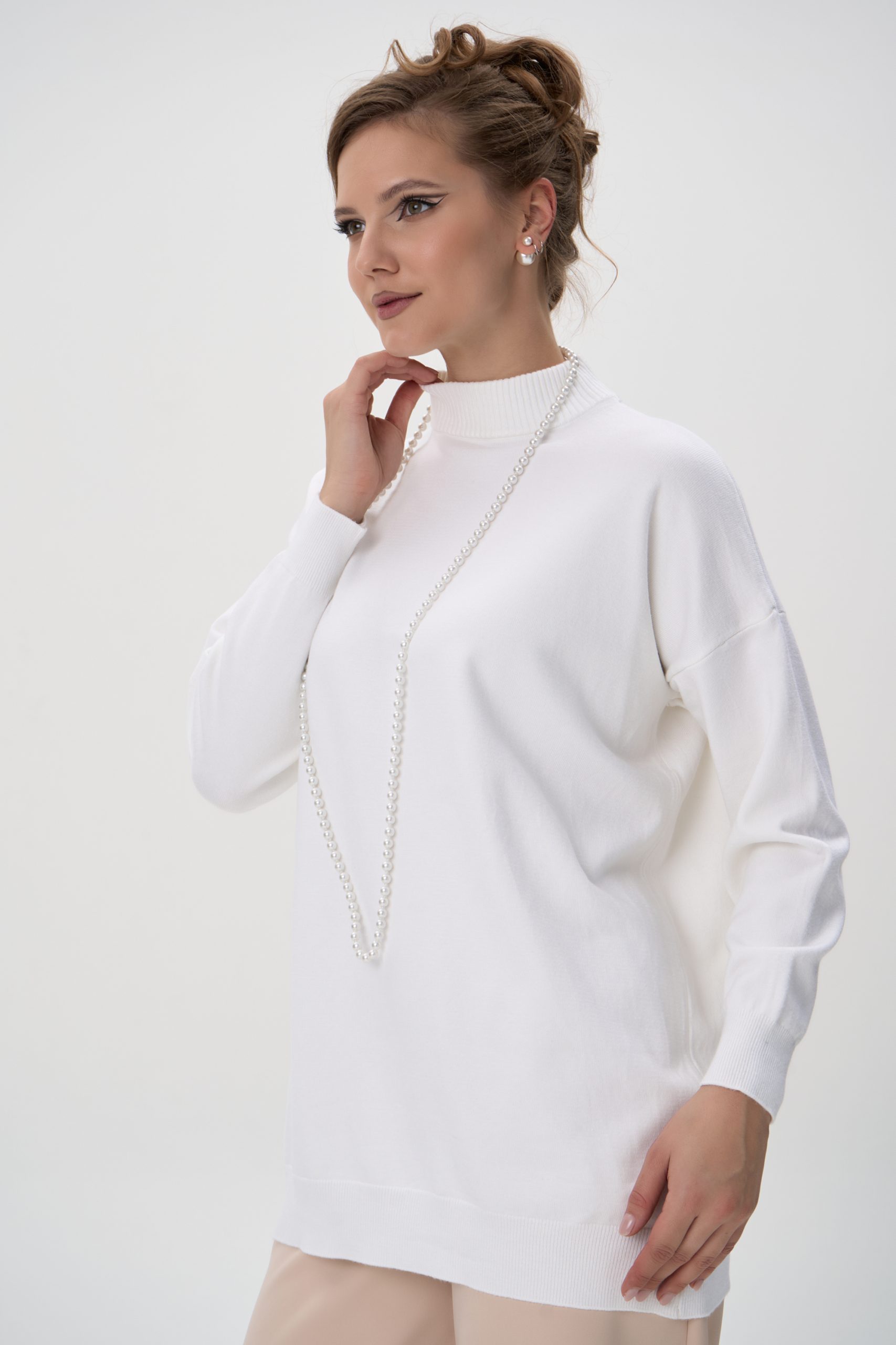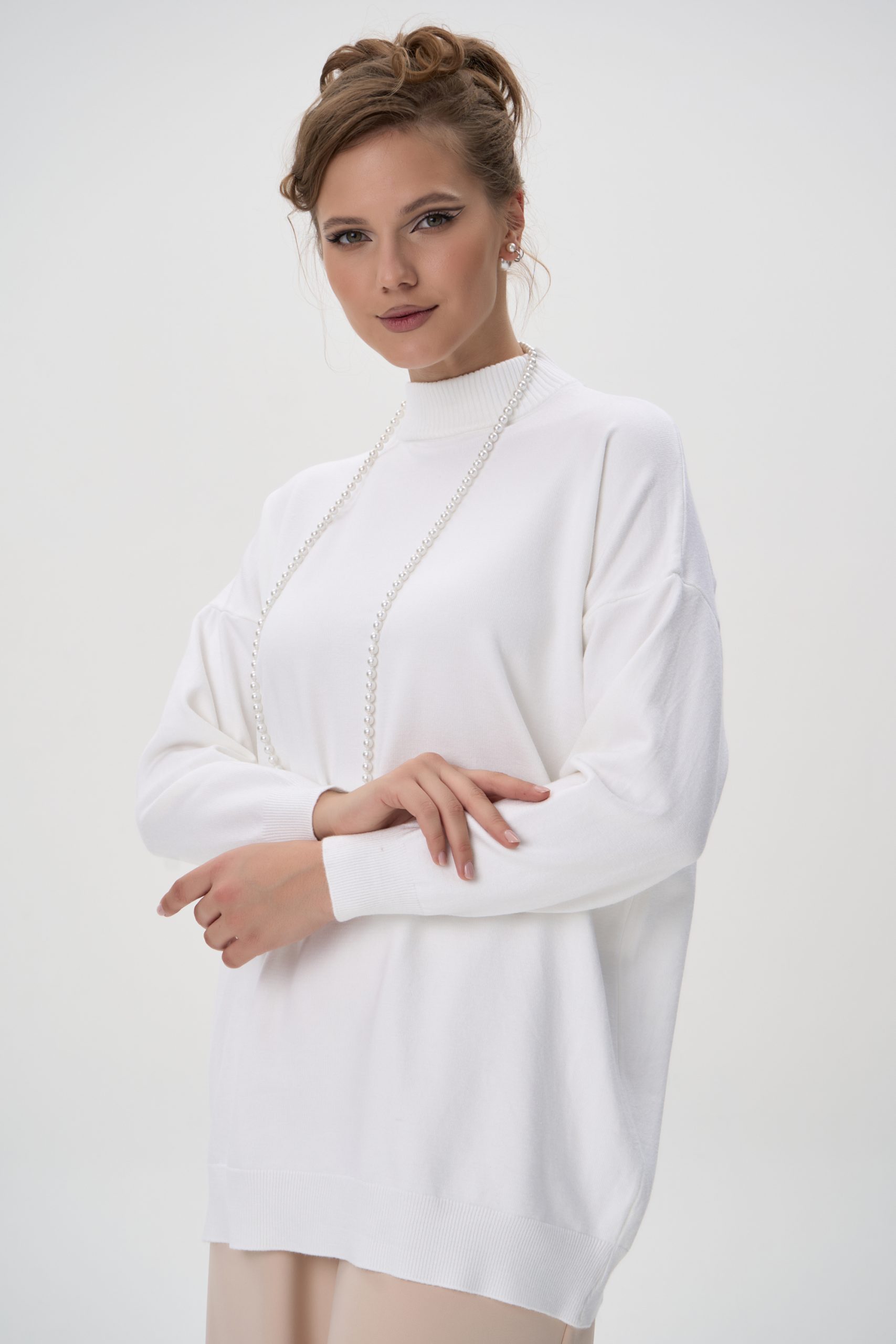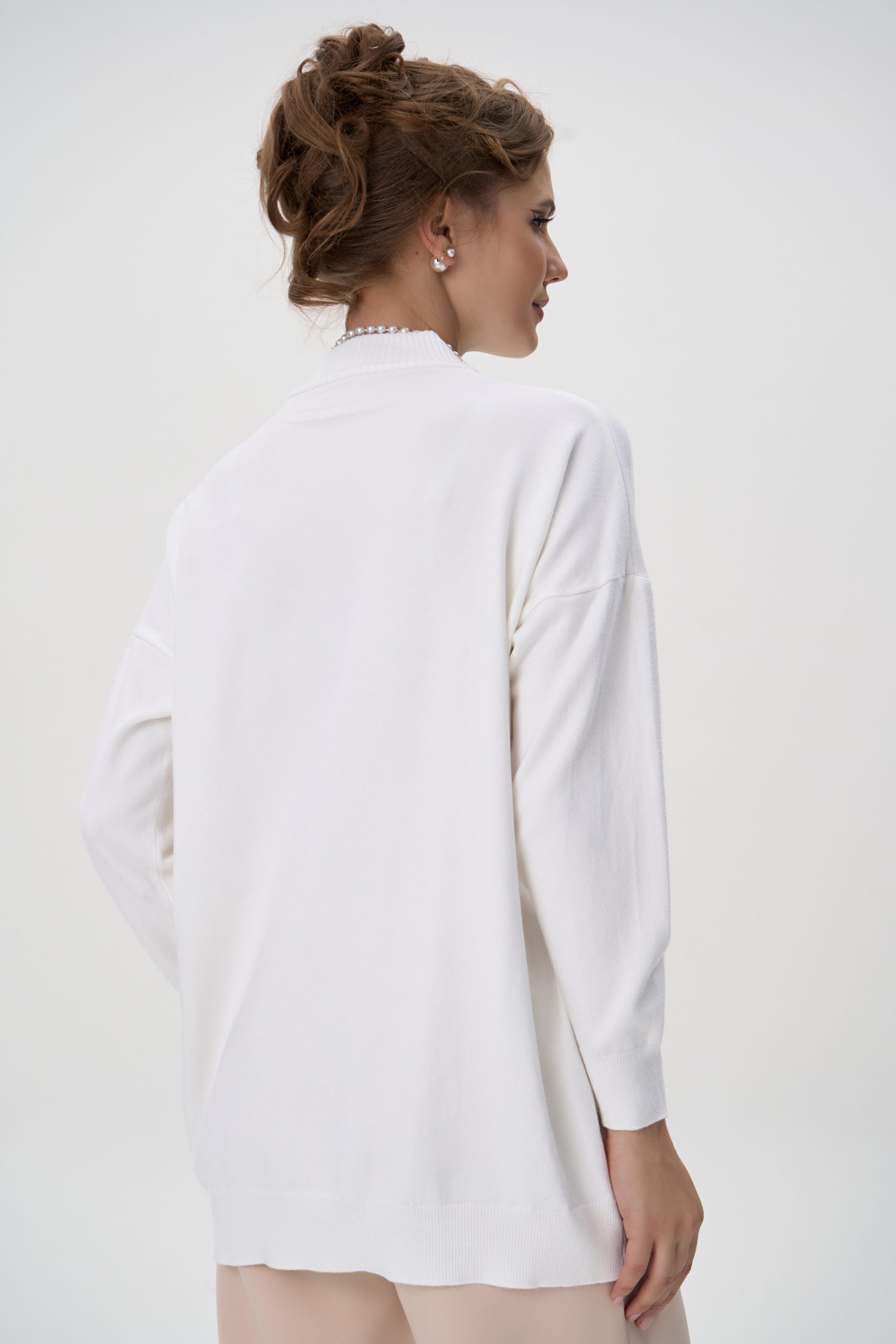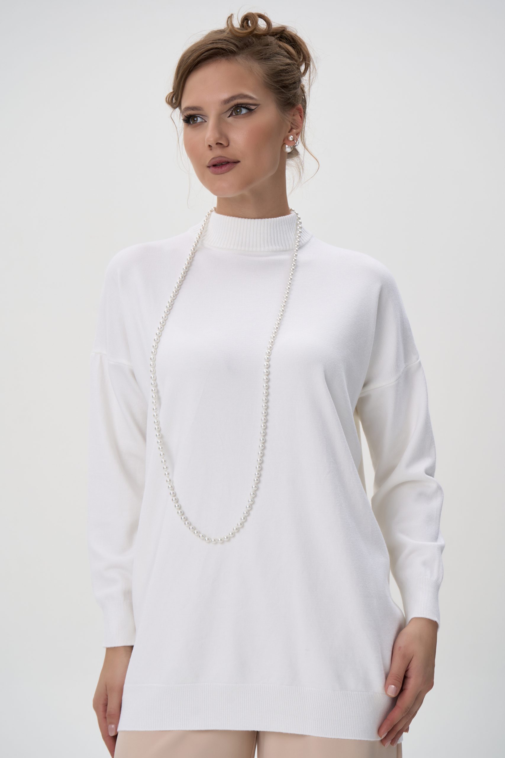 Благодаря свободному силуэту и эластичной фактуре трикотажа, пуловер комфортно садится по фигуре разного типа — подчёркивает линию плеч, не обтягивает и создаёт аккуратный силуэт.