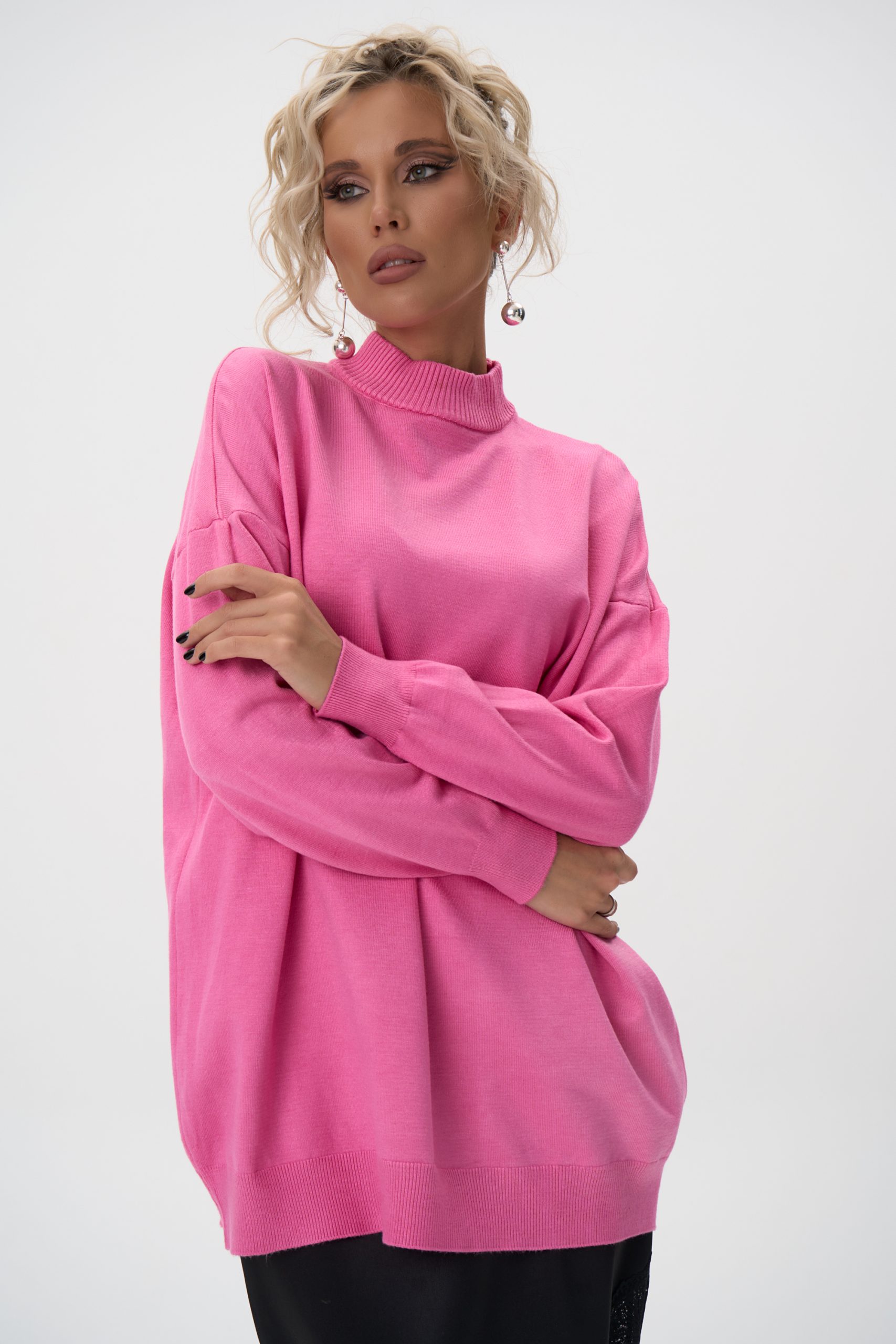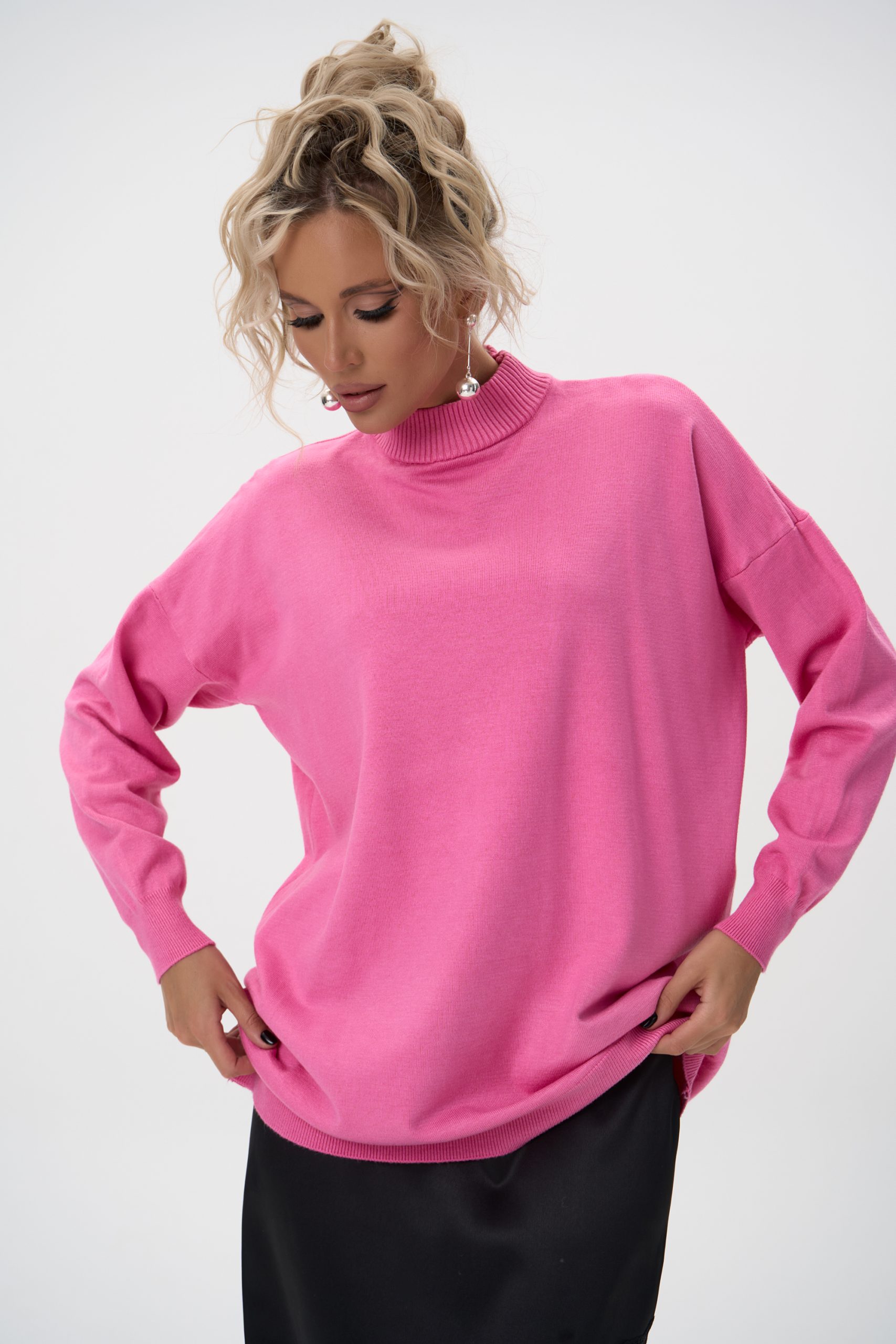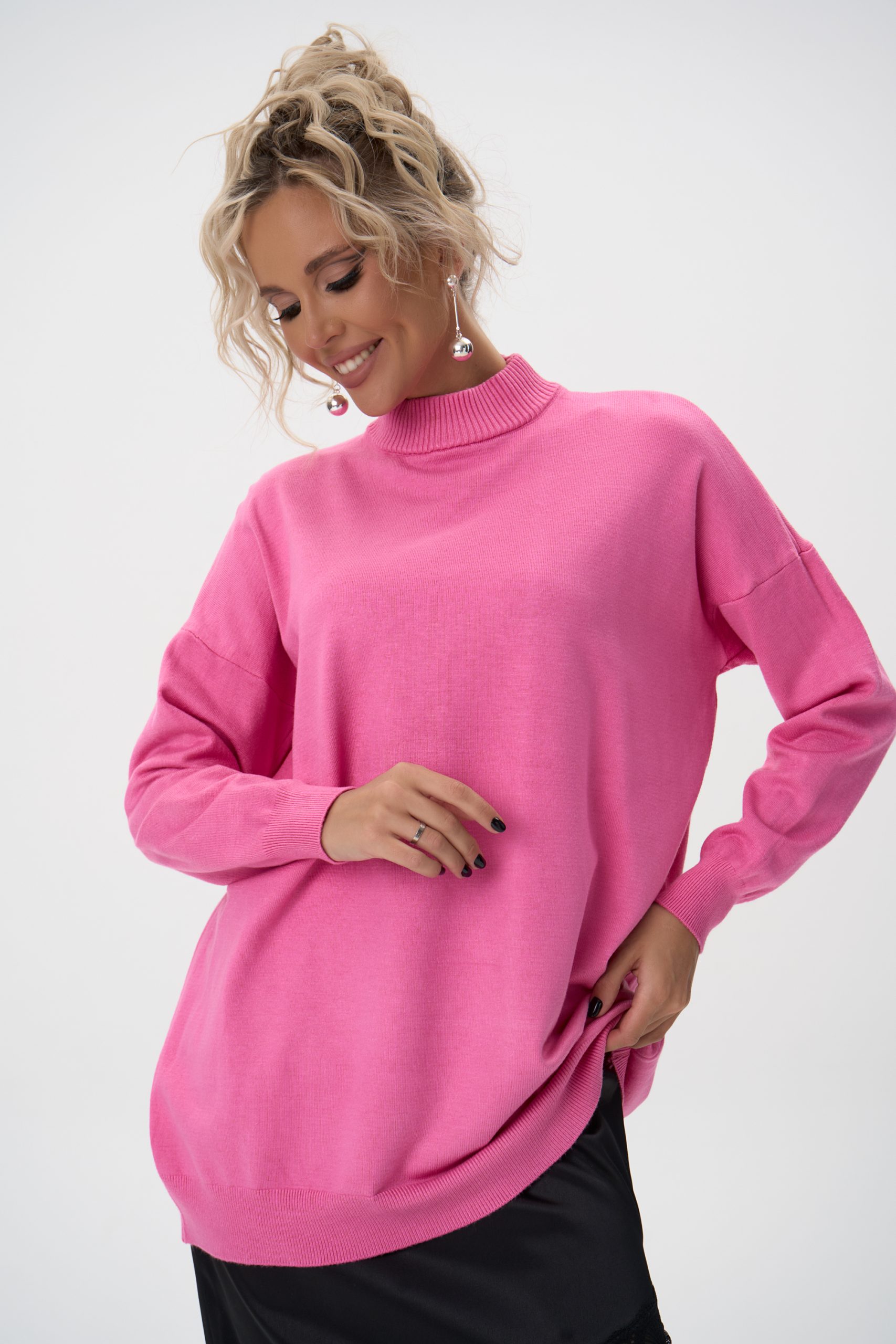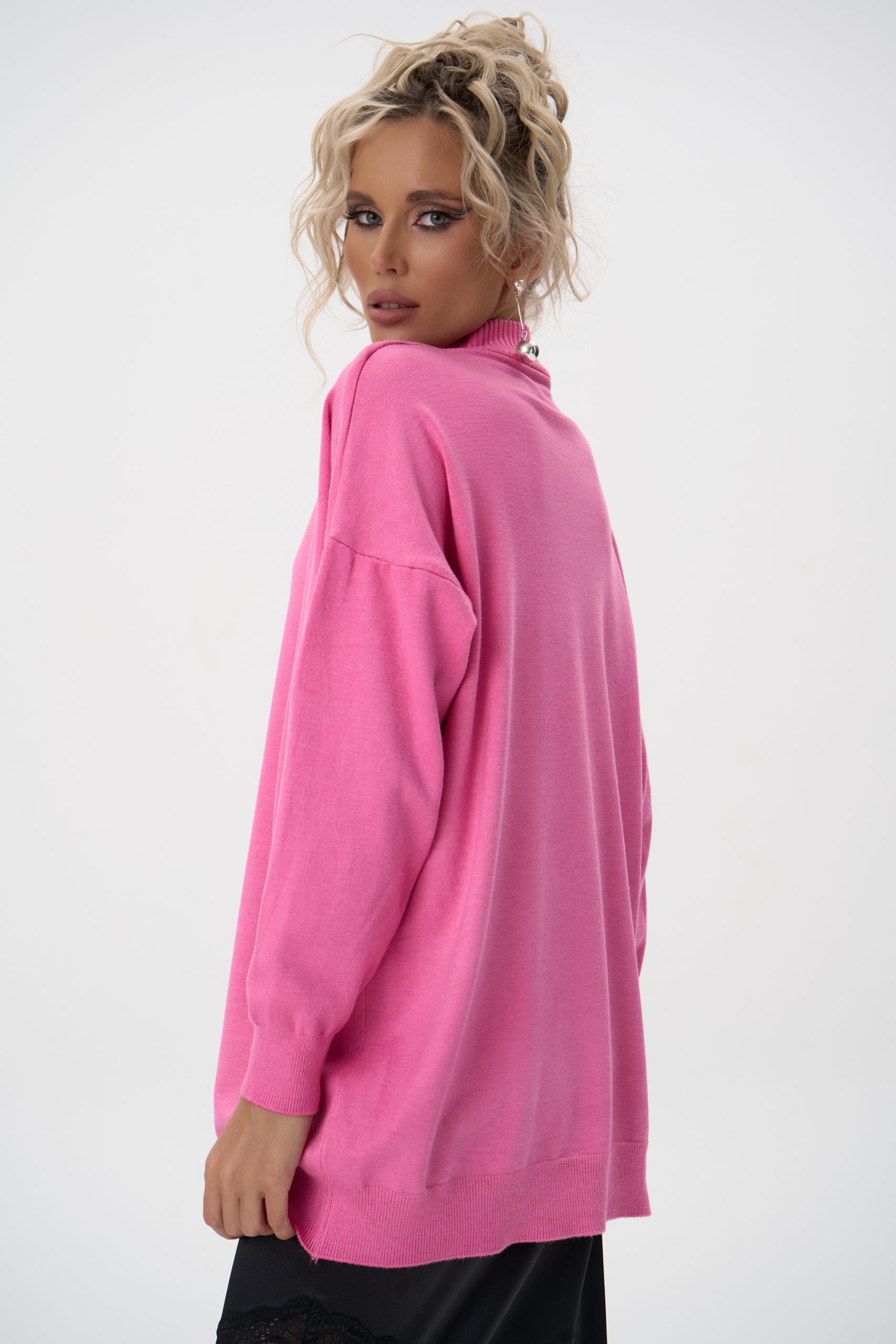 Благодаря свободному силуэту и эластичной фактуре трикотажа, пуловер комфортно садится по фигуре разного типа — подчёркивает линию плеч, не обтягивает и создаёт аккуратный силуэт.
