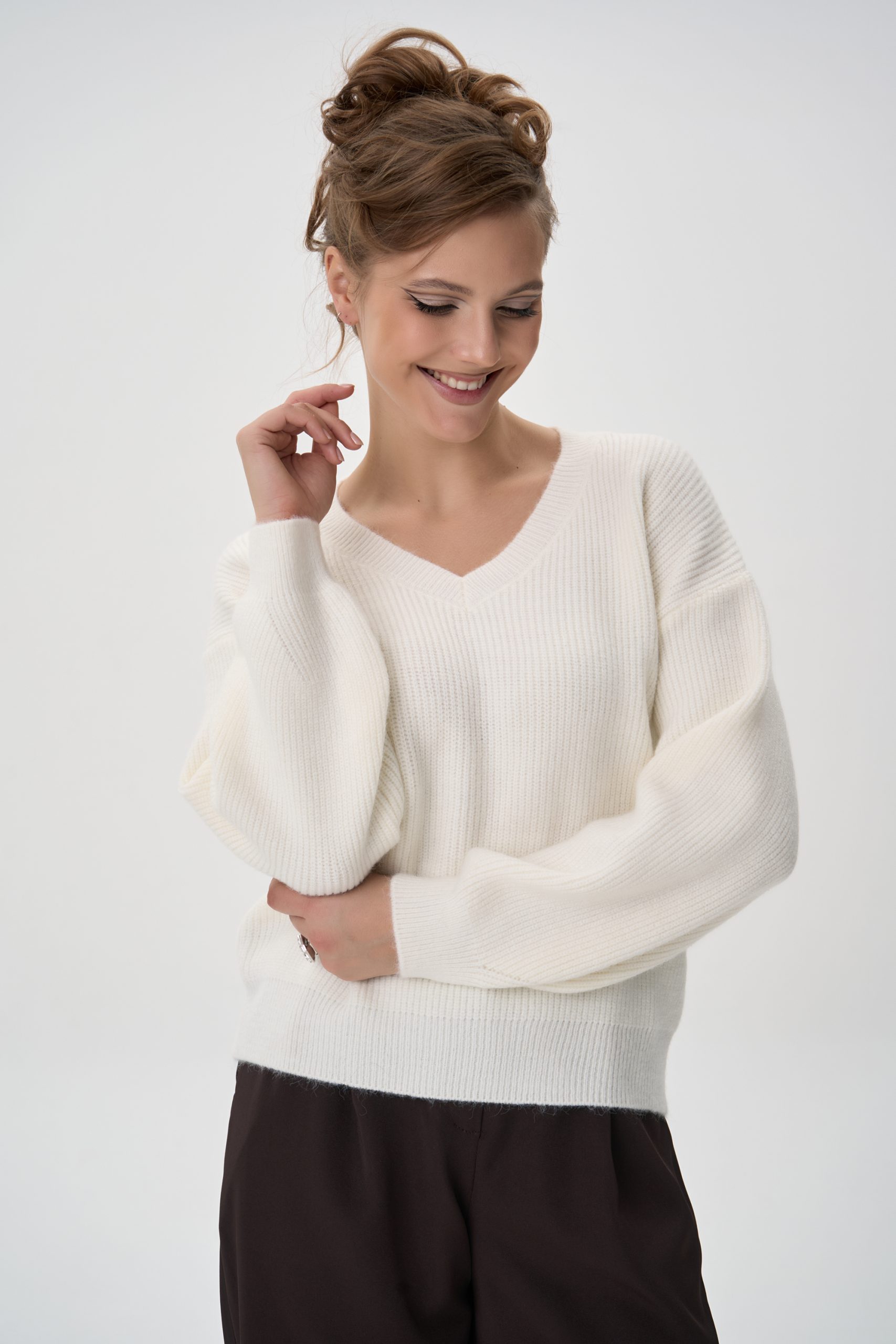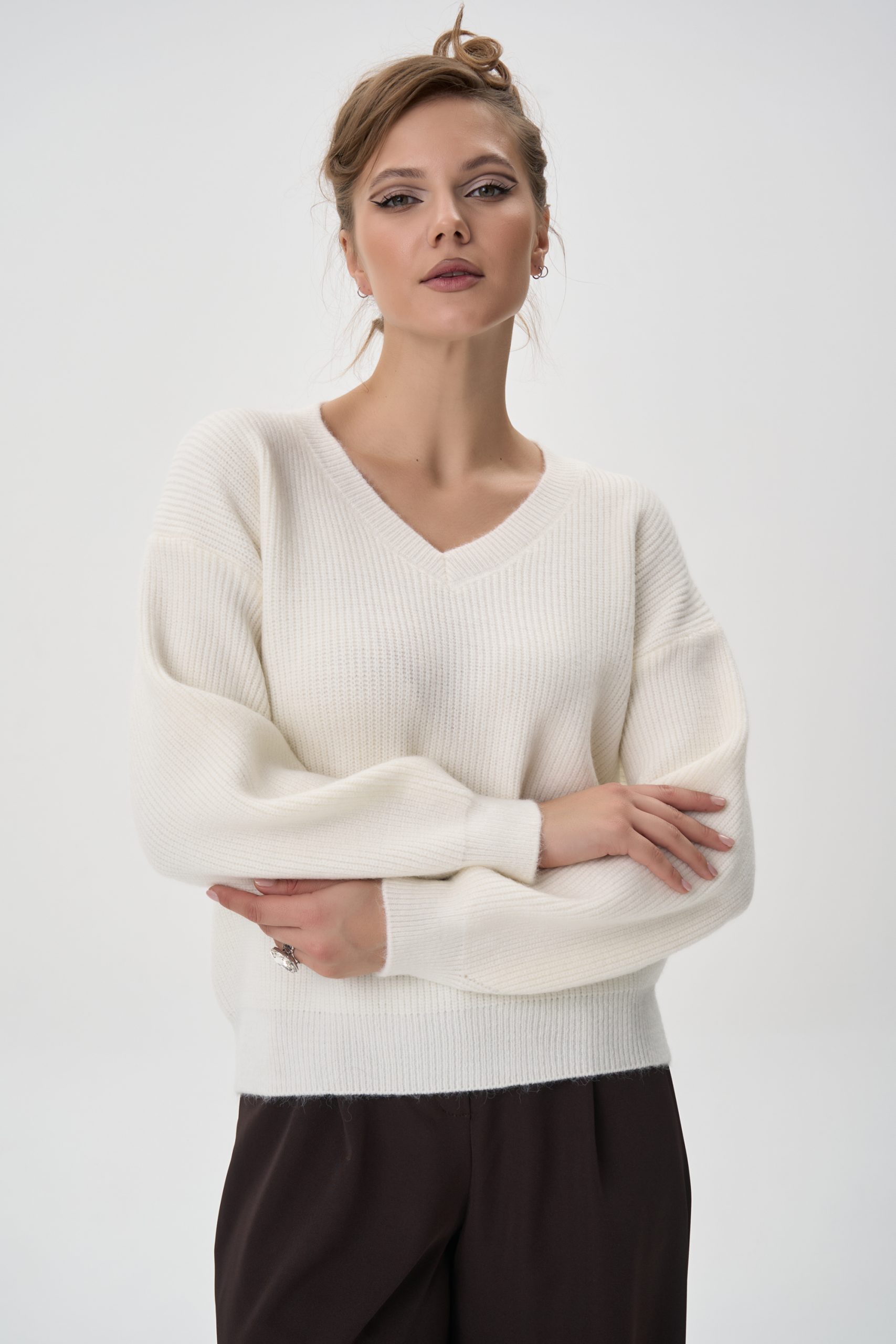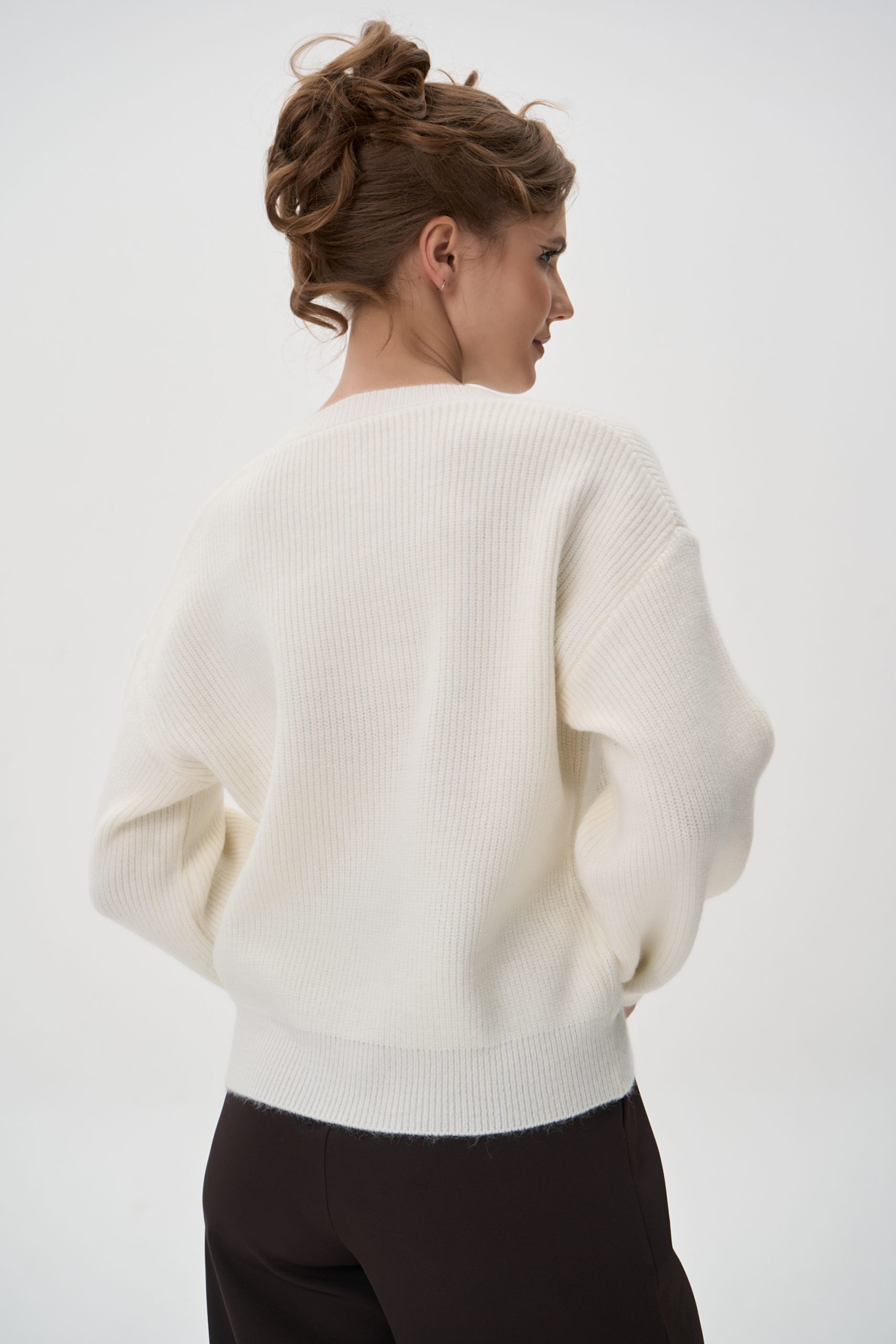 Благодаря свободному силуэту и эластичной фактуре трикотажа, пуловер комфортно садится по фигуре разного типа — подчёркивает линию плеч, не обтягивает и создаёт аккуратный силуэт.