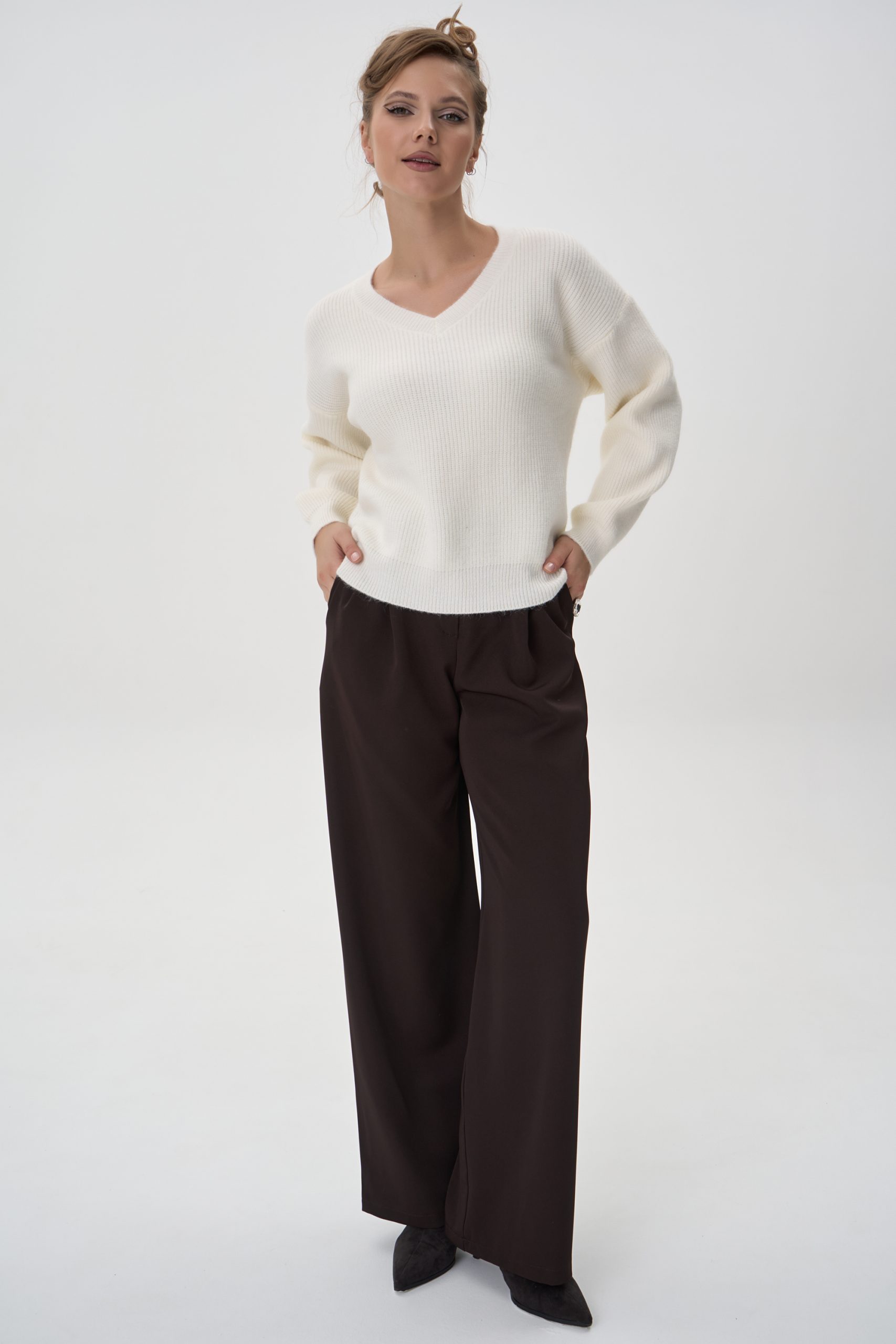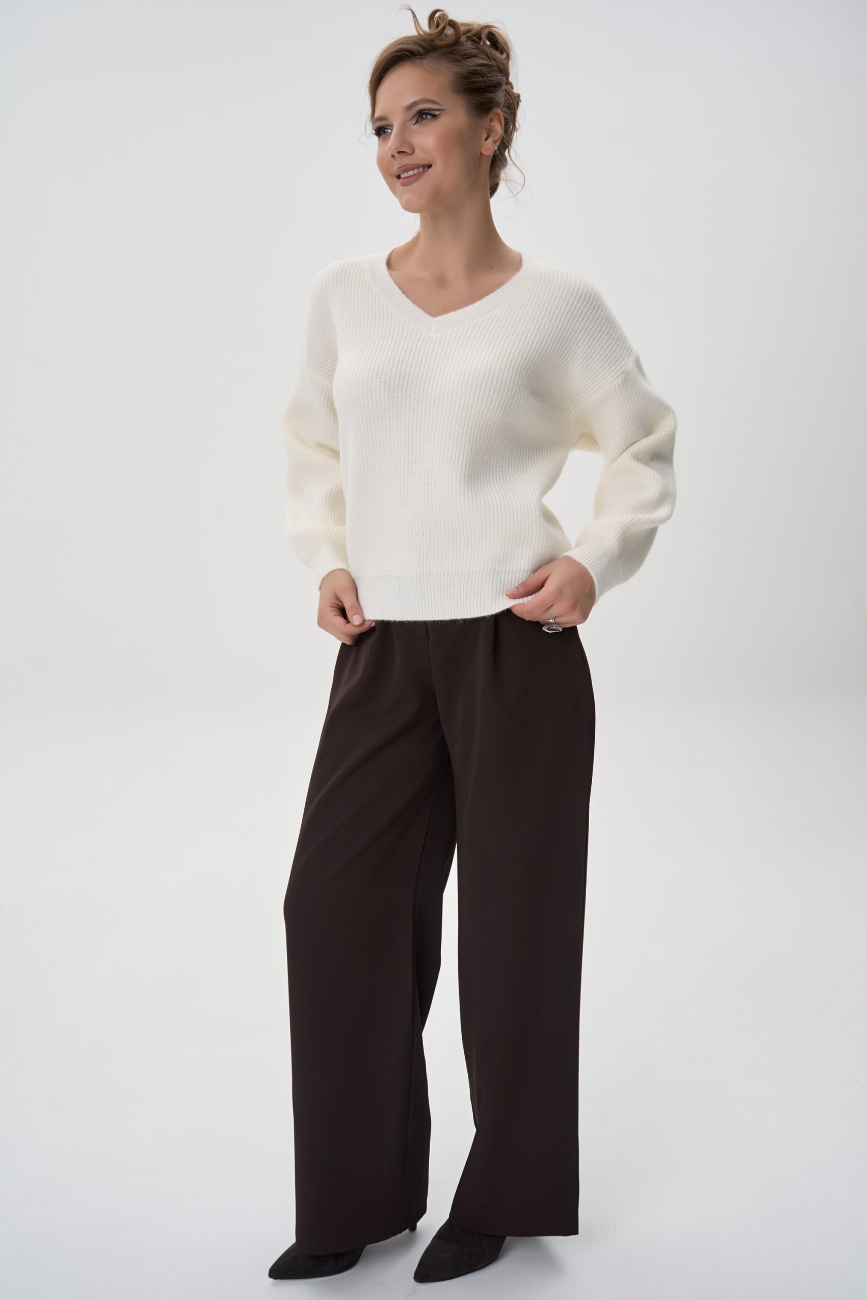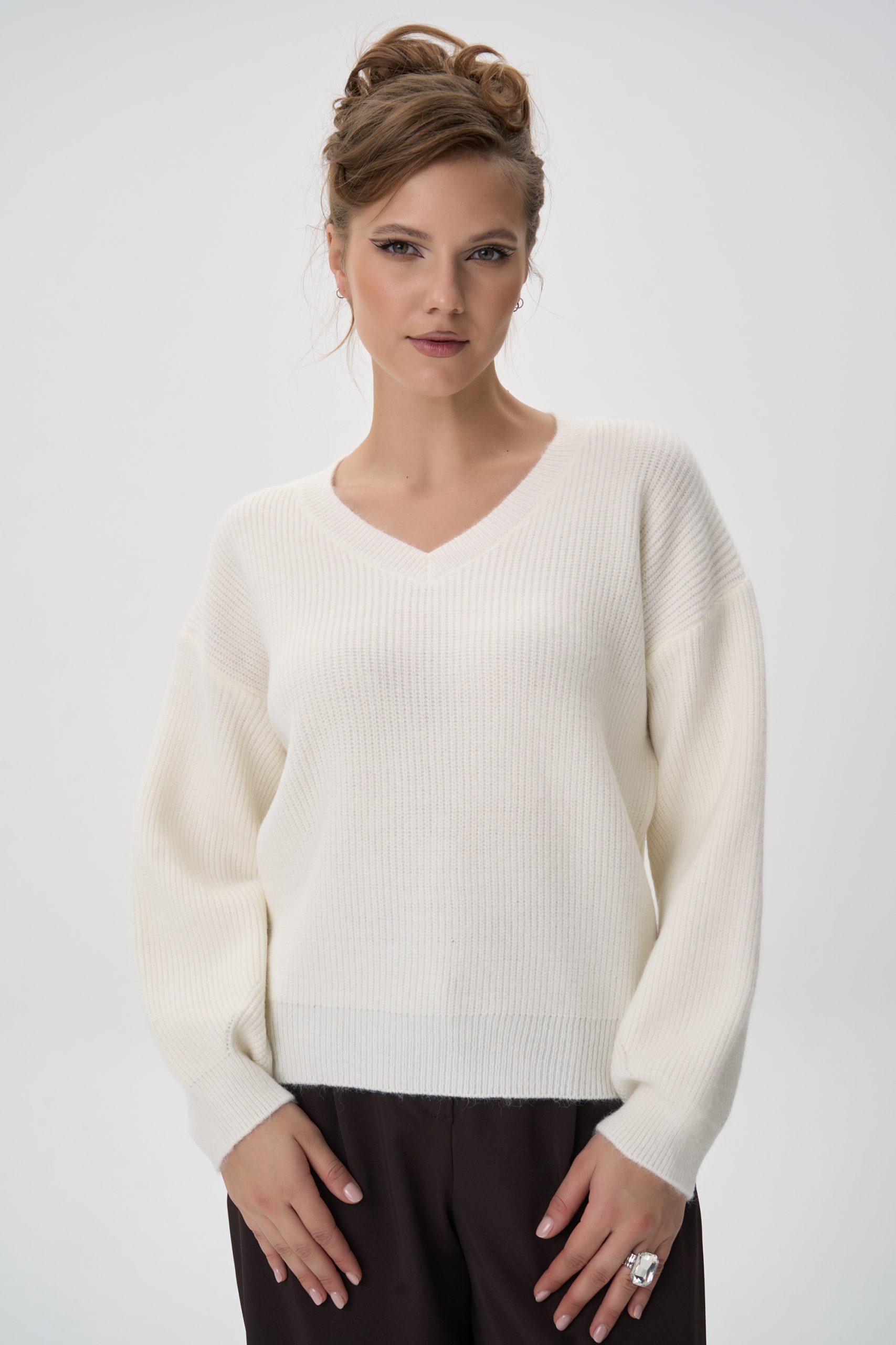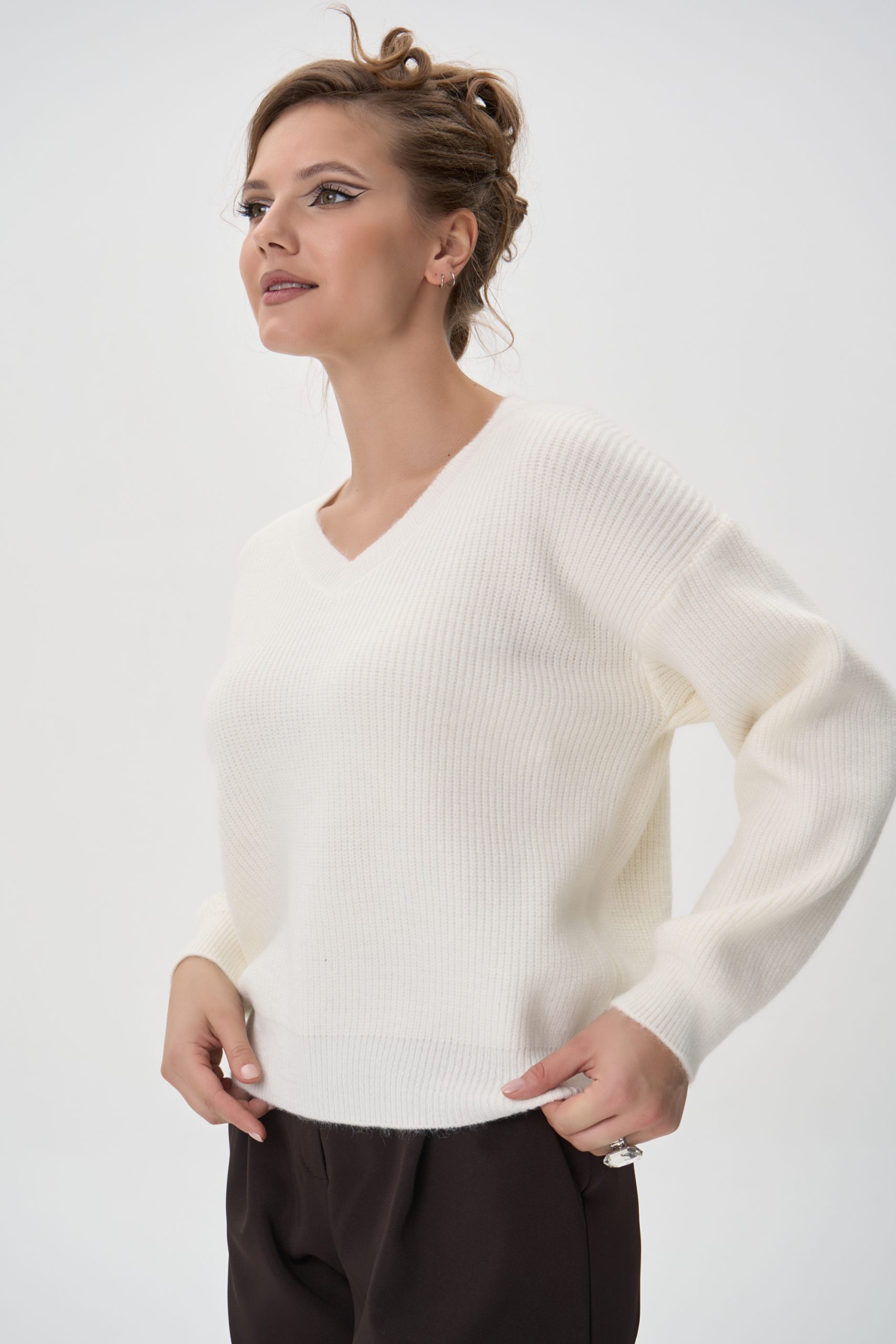 Благодаря свободному силуэту и эластичной фактуре трикотажа, пуловер комфортно садится по фигуре разного типа — подчёркивает линию плеч, не обтягивает и создаёт аккуратный силуэт.