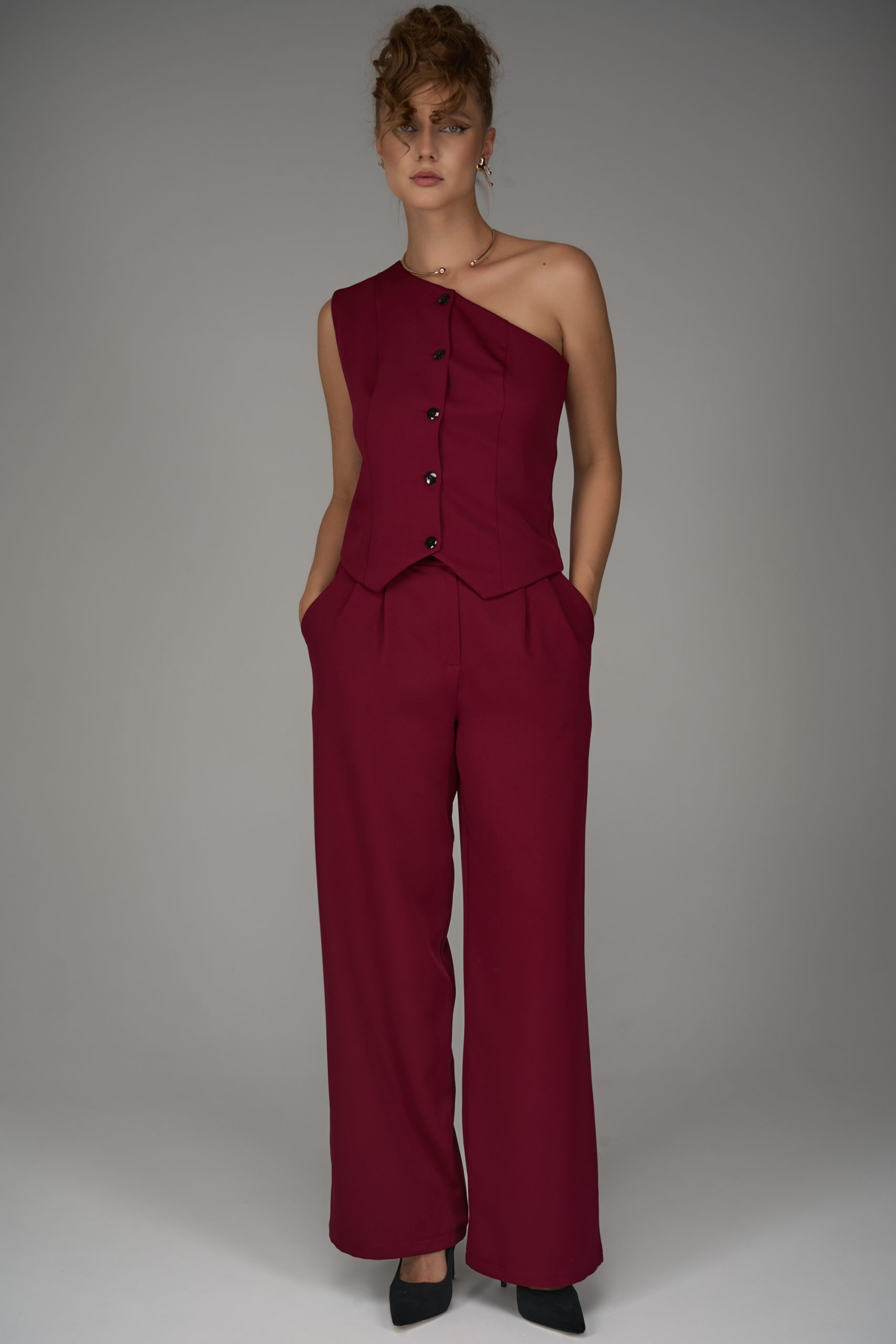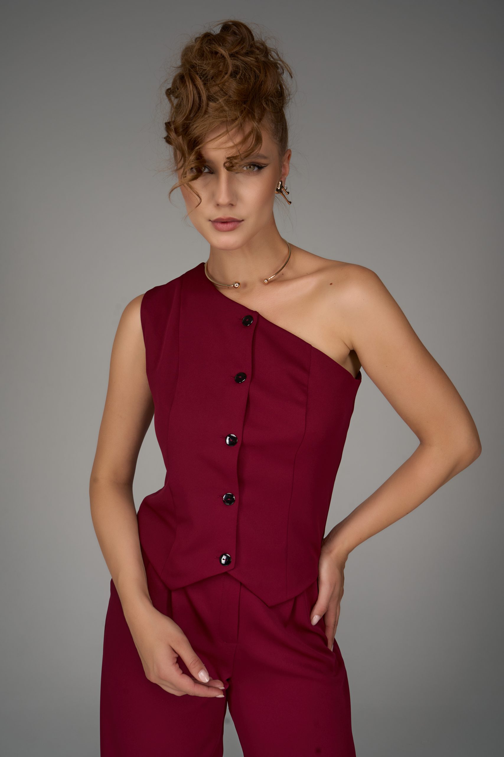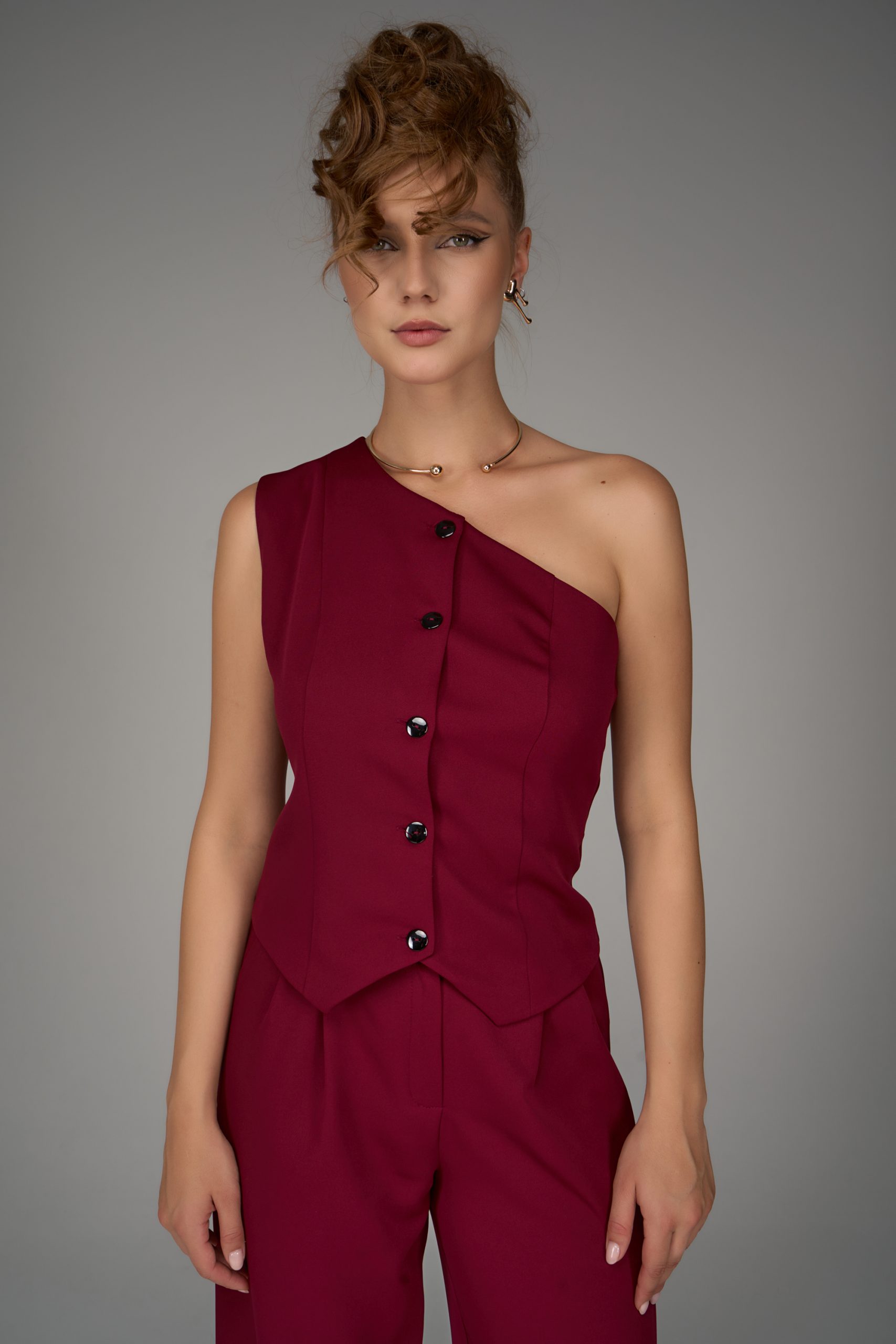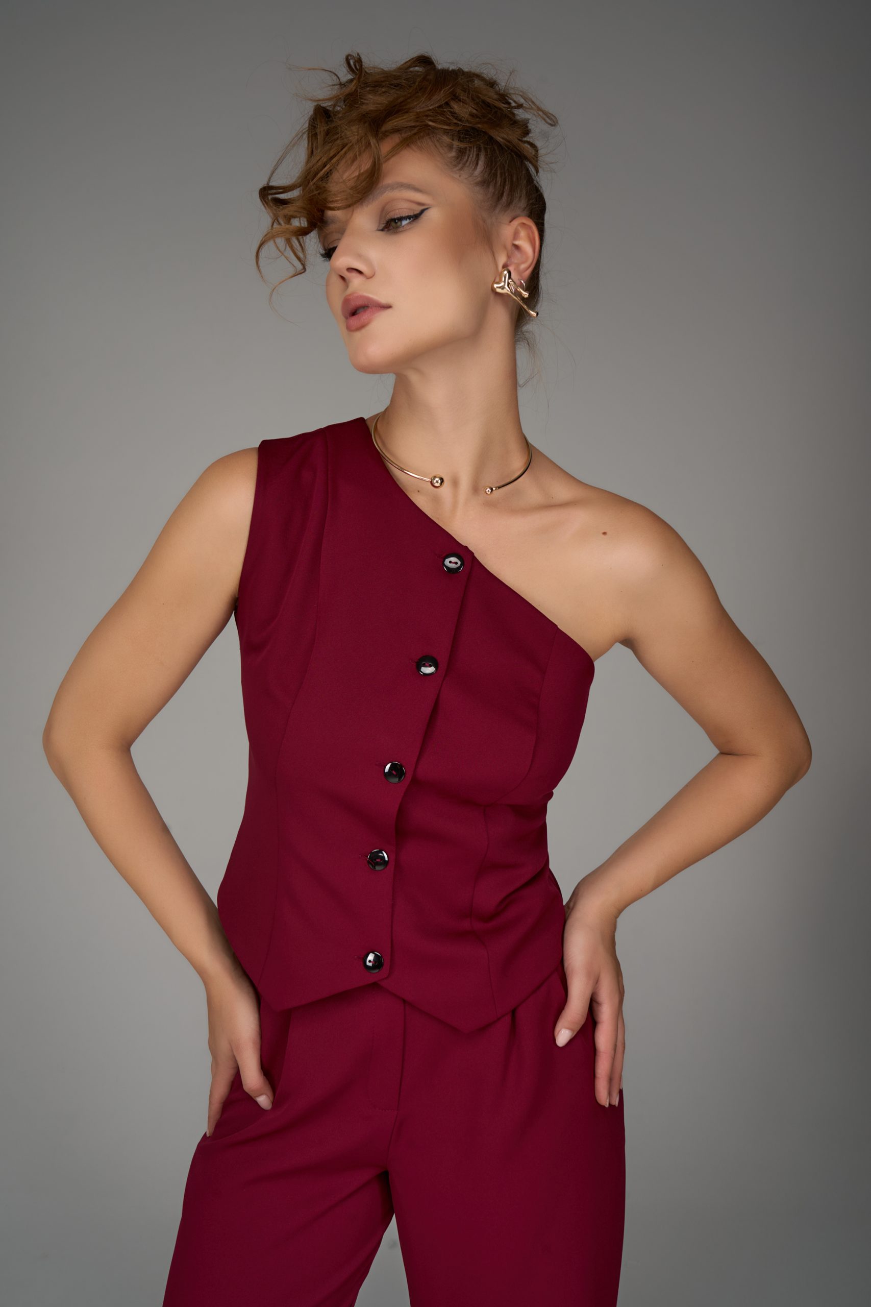 Жилет на одно плечо — смелый акцент коллекции. Нестандартный крой превращает классическую деталь гардероба в модное высказывание. Ассиметричная линия делает образ современным и запоминающимся, подчеркивая изящность фигуры и утончённый вкус.