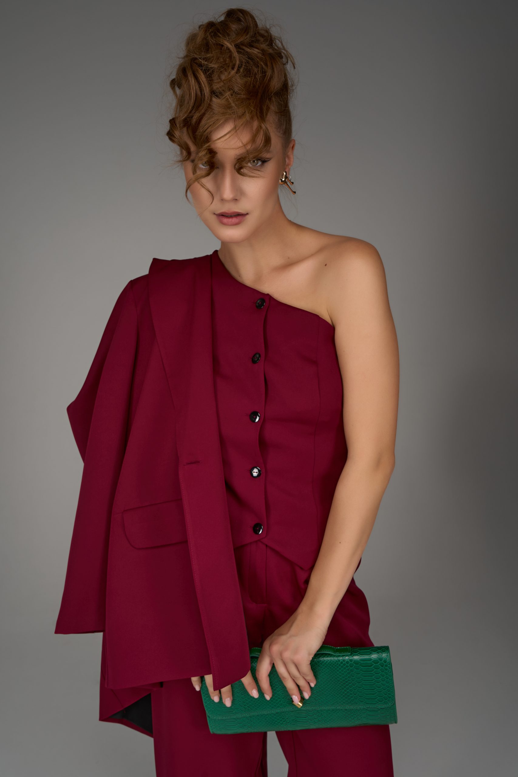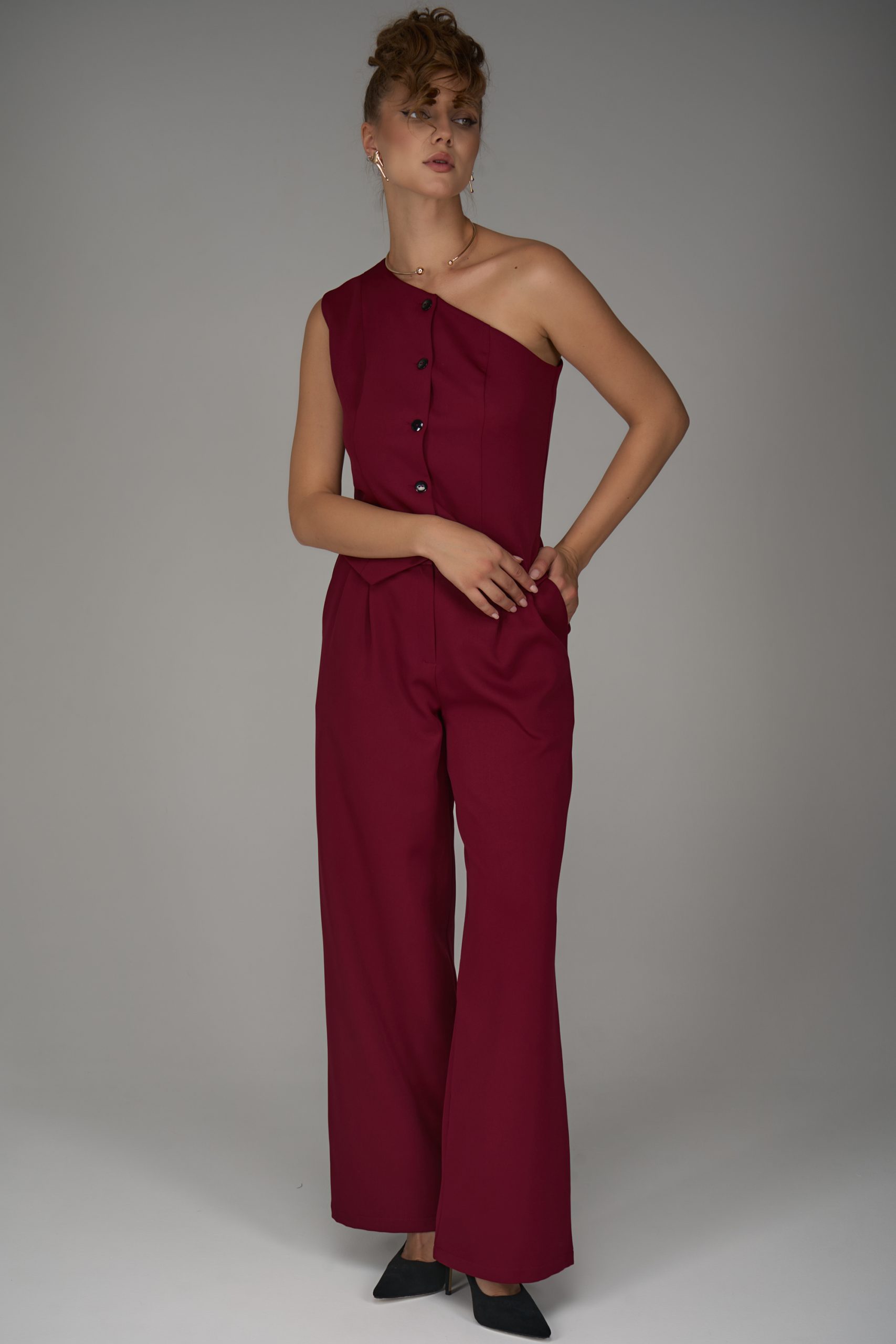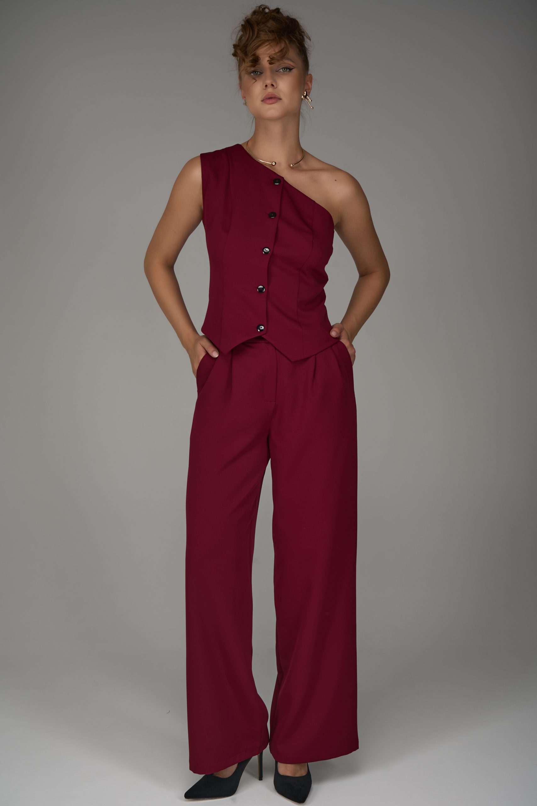 Жилет на одно плечо — смелый акцент коллекции. Нестандартный крой превращает классическую деталь гардероба в модное высказывание. Ассиметричная линия делает образ современным и запоминающимся, подчеркивая изящность фигуры и утончённый вкус.
